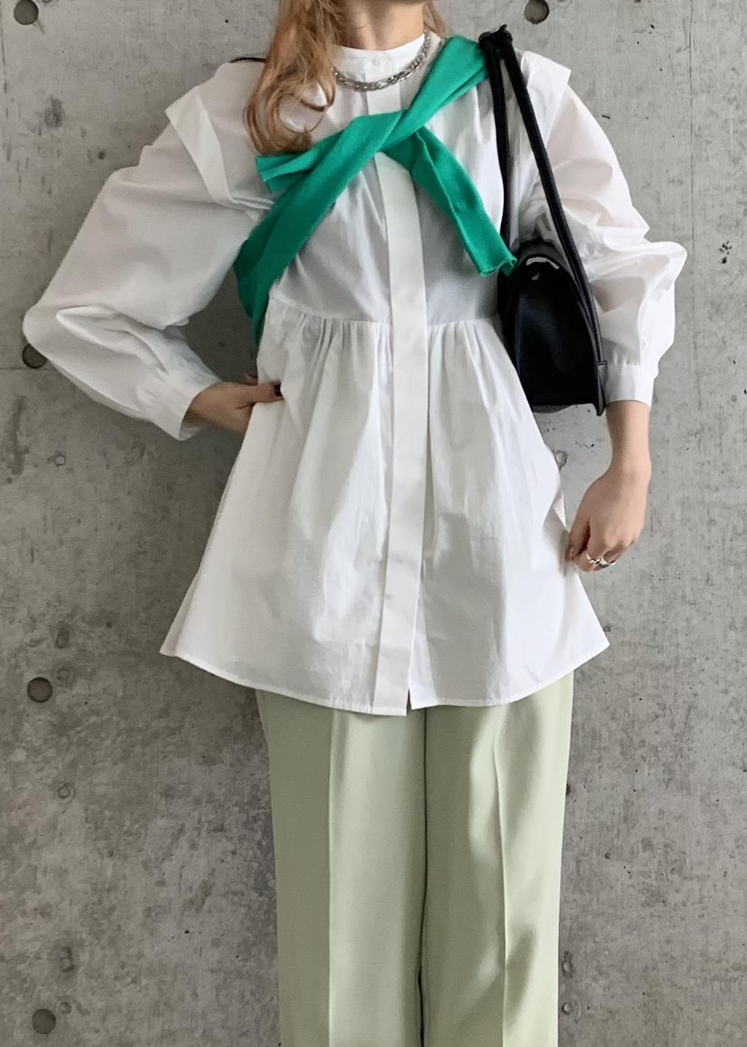 ゆるっとしたシルエットも、肩にカーディガンを巻くことでメリハリをプラス。
