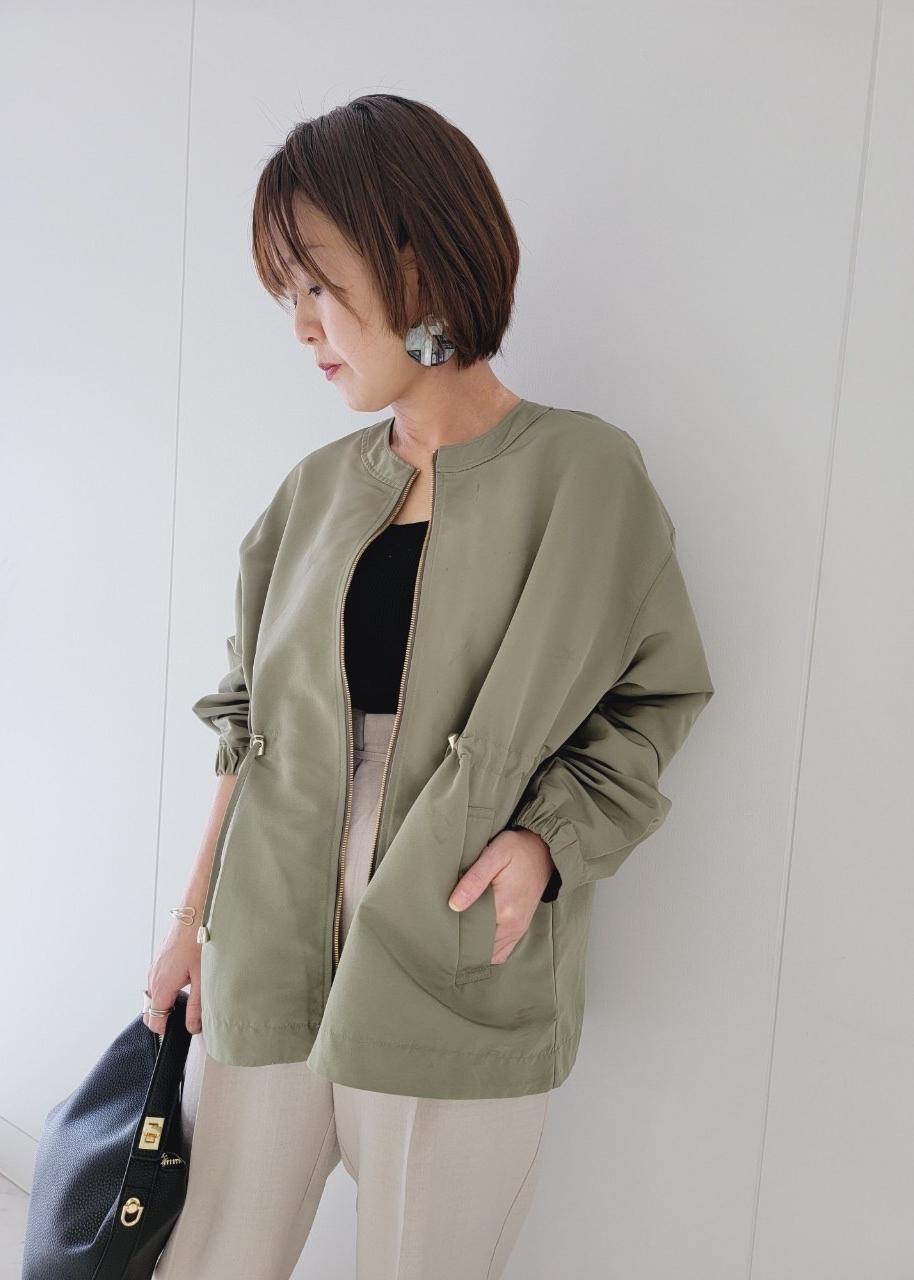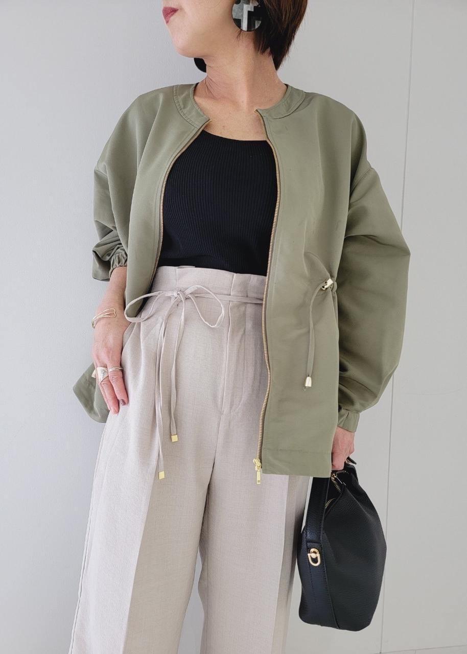 カーキブルゾン×ベージュリネンライクパンツ
