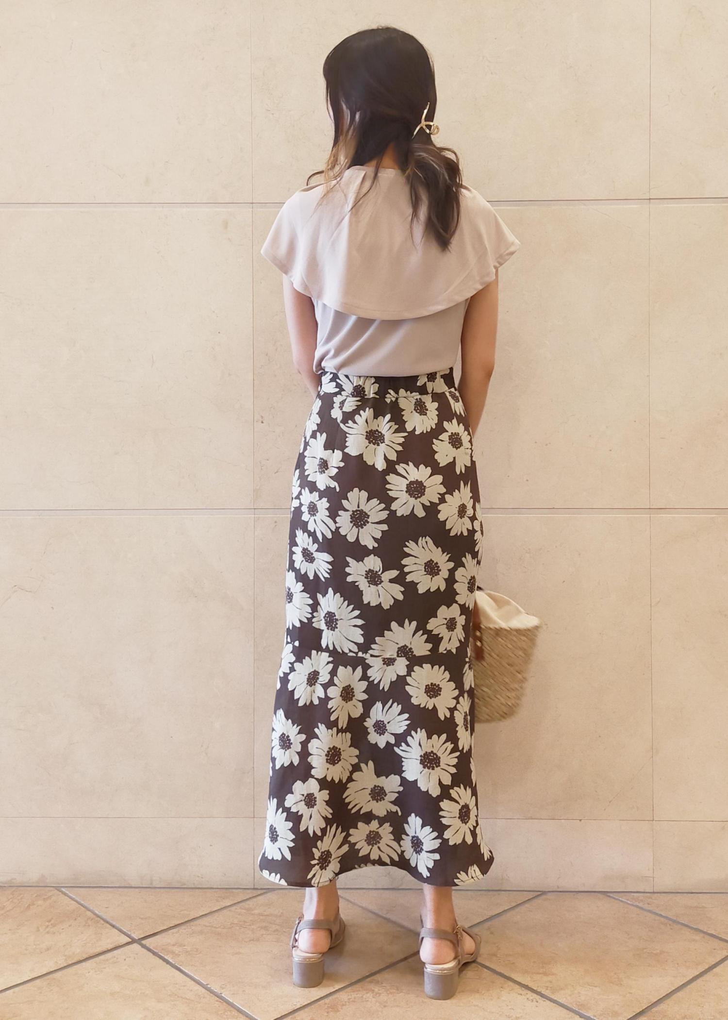 花柄のスカートを主役に、カラーはベージュとブラウンでワントーンにまとめました。 カットソー素材のトップスは吸水速乾の機能素材で夏にぴったり♪ スカートはスリットが入っており、シルエットがきれいなのに動きやすく快適な履き心地です。 仕事にもプライベートにも、おすすめコーディネートですよ♡