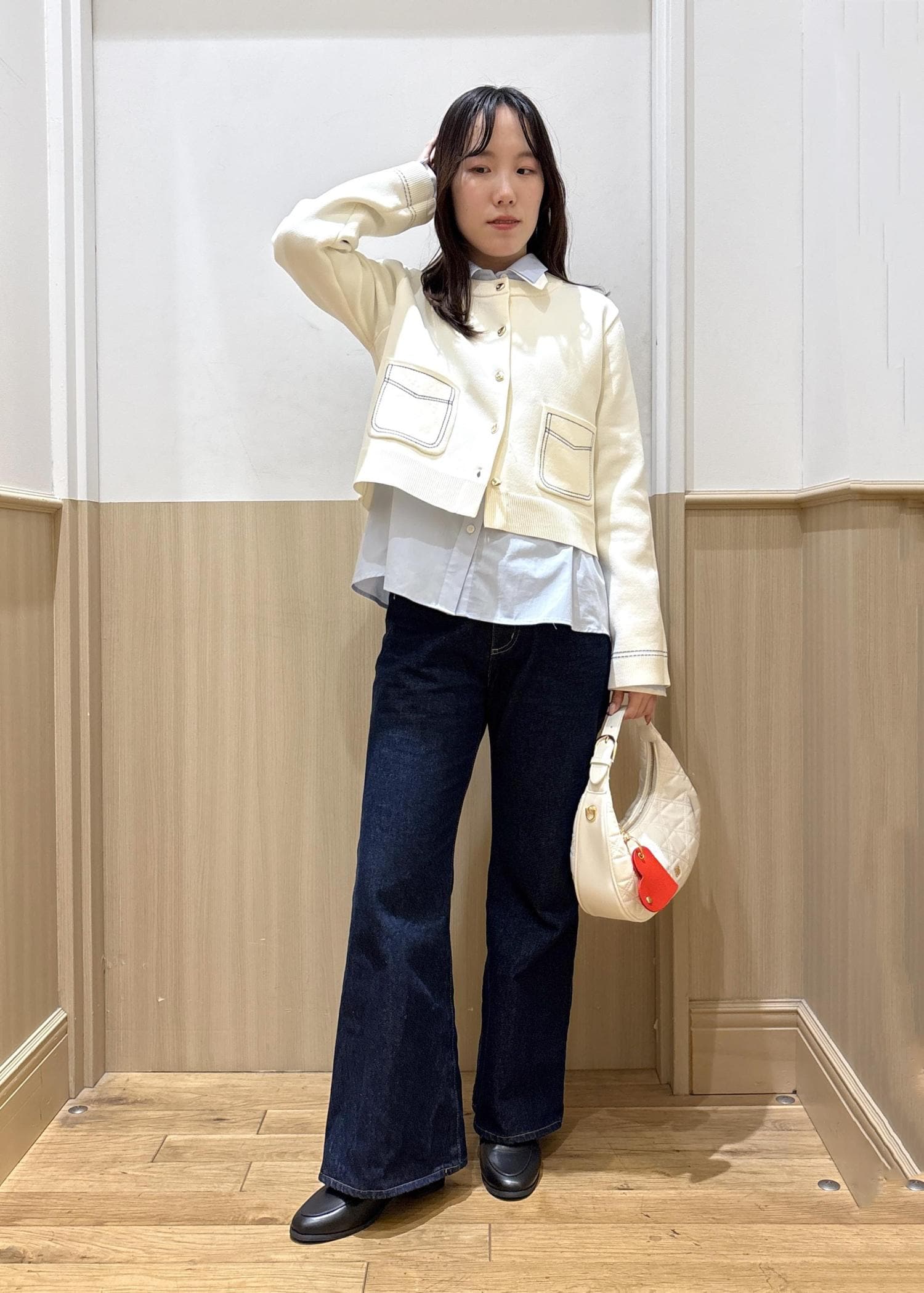 今回着用したジレはロングシルエットで深めのVネックなので