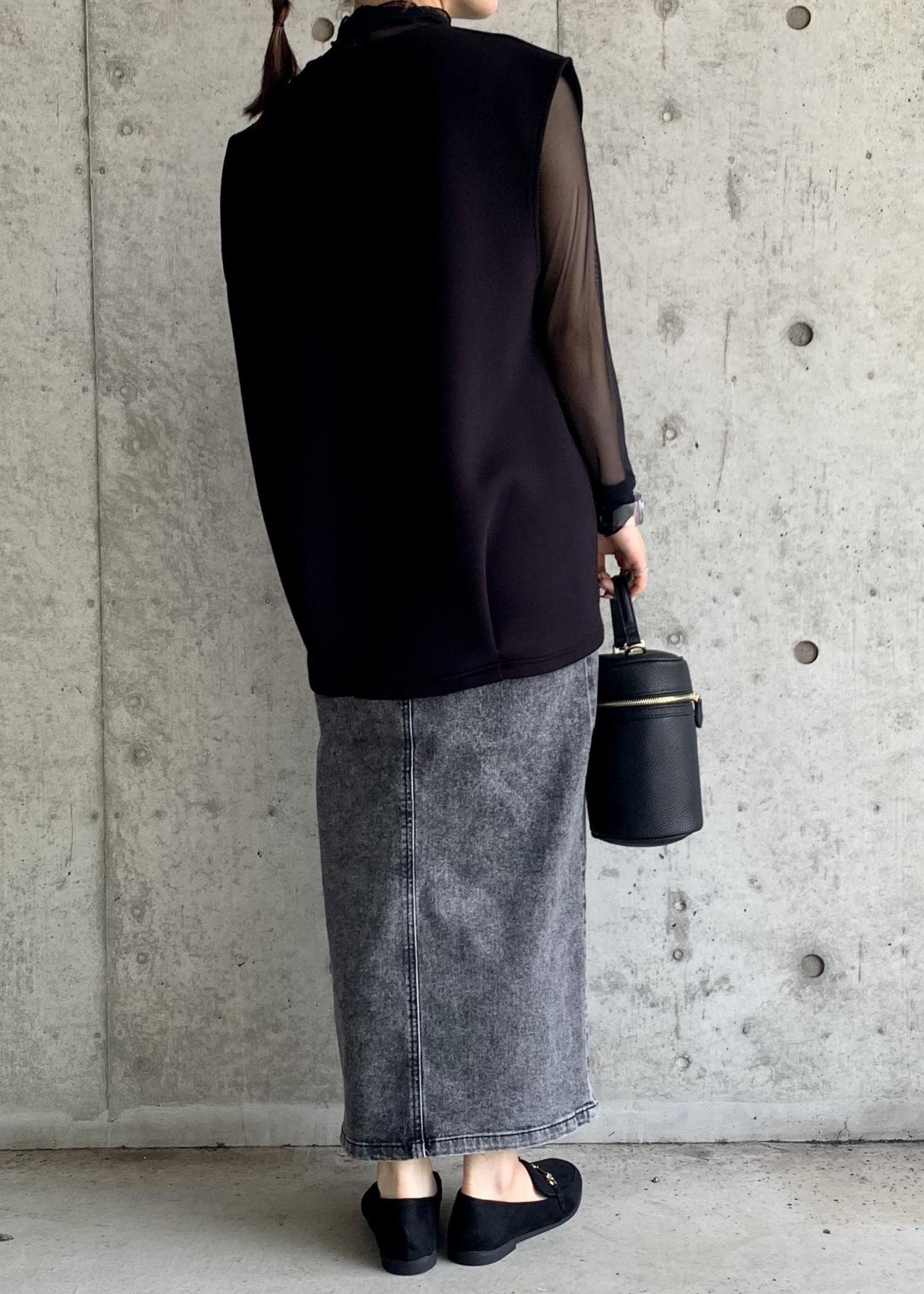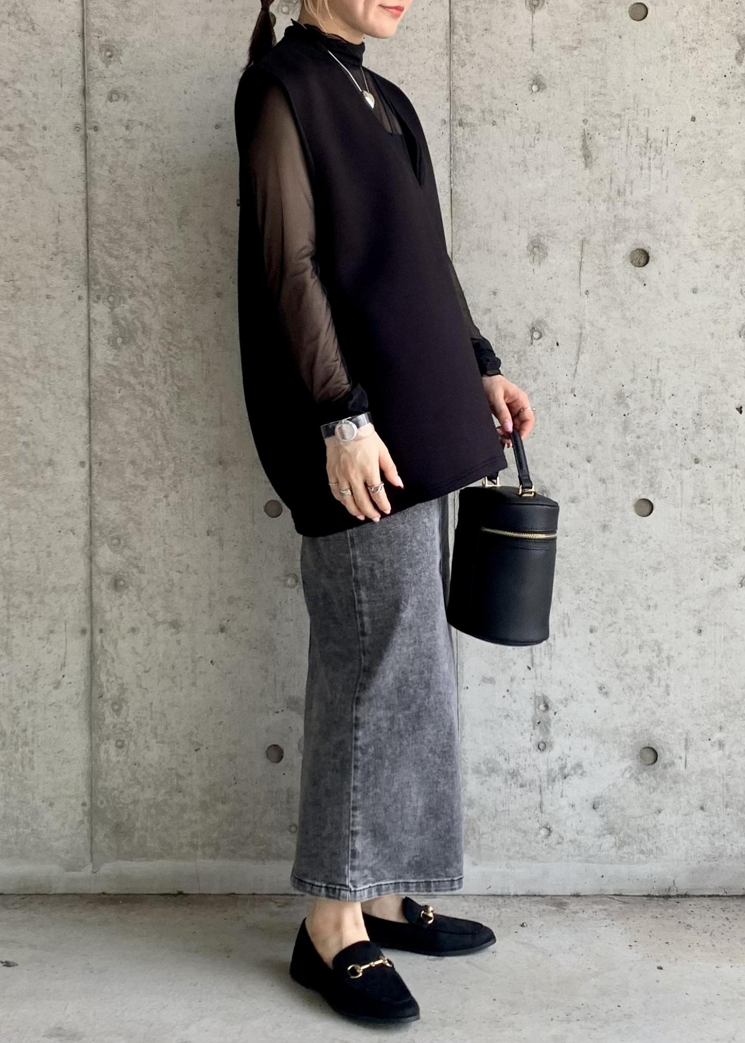 素材感の違うブラックアイテムを集めた オールブラックコーデ✴︎ シアーインナーやスカートのスリットで 抜け感をプラスして、黒でも重たくならない ように意識しました◎ スフレタッチ素材やストレッチの効いたデニムで オシャレだけど動きやすく...が叶うコーデです☺︎