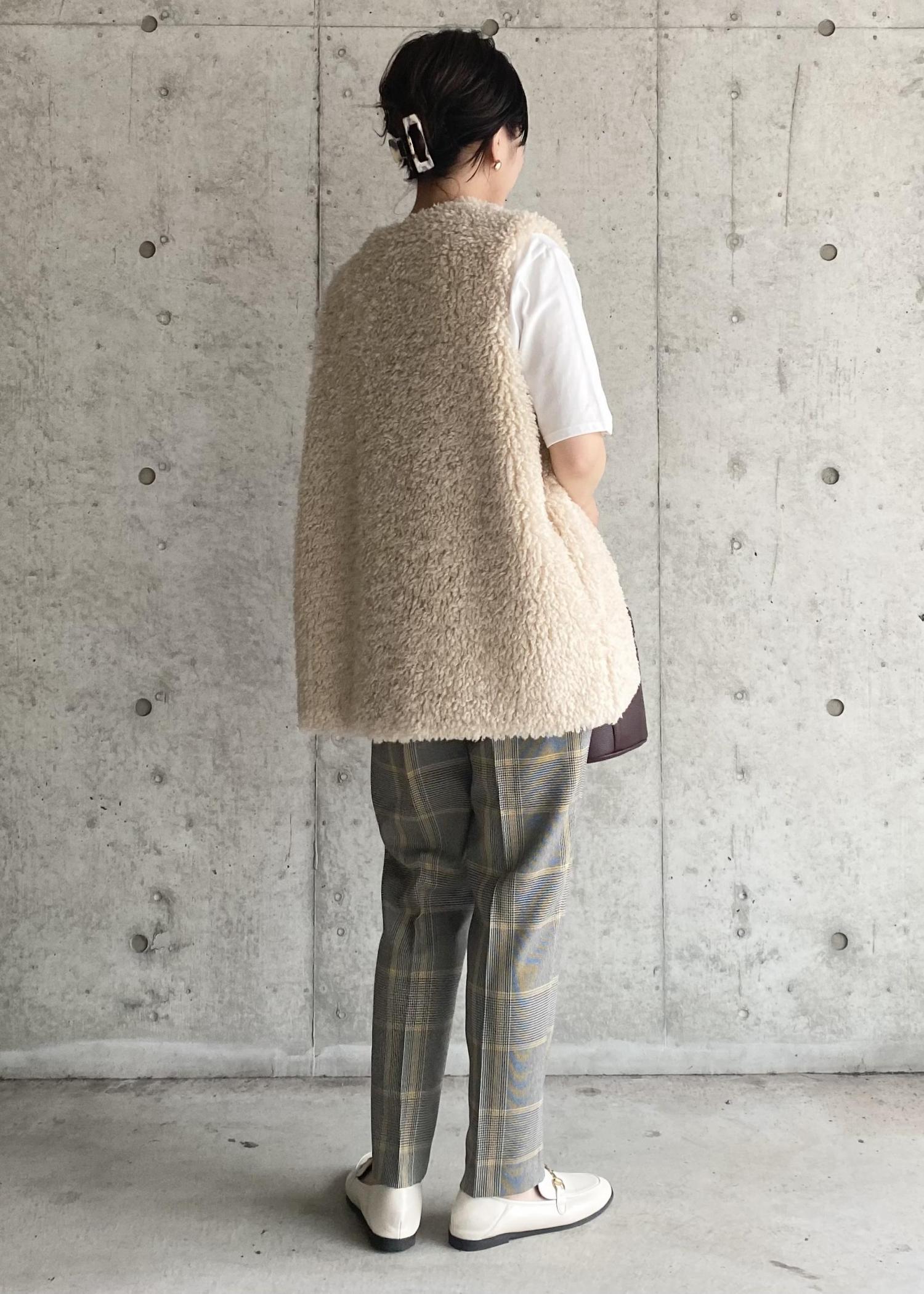 ViS今季おすすめのファーアイテムが入荷しております! トレンド感のあるジレスタイルに チェックパンツとローファーで 大人カジュアルな雰囲気になりますよ◎