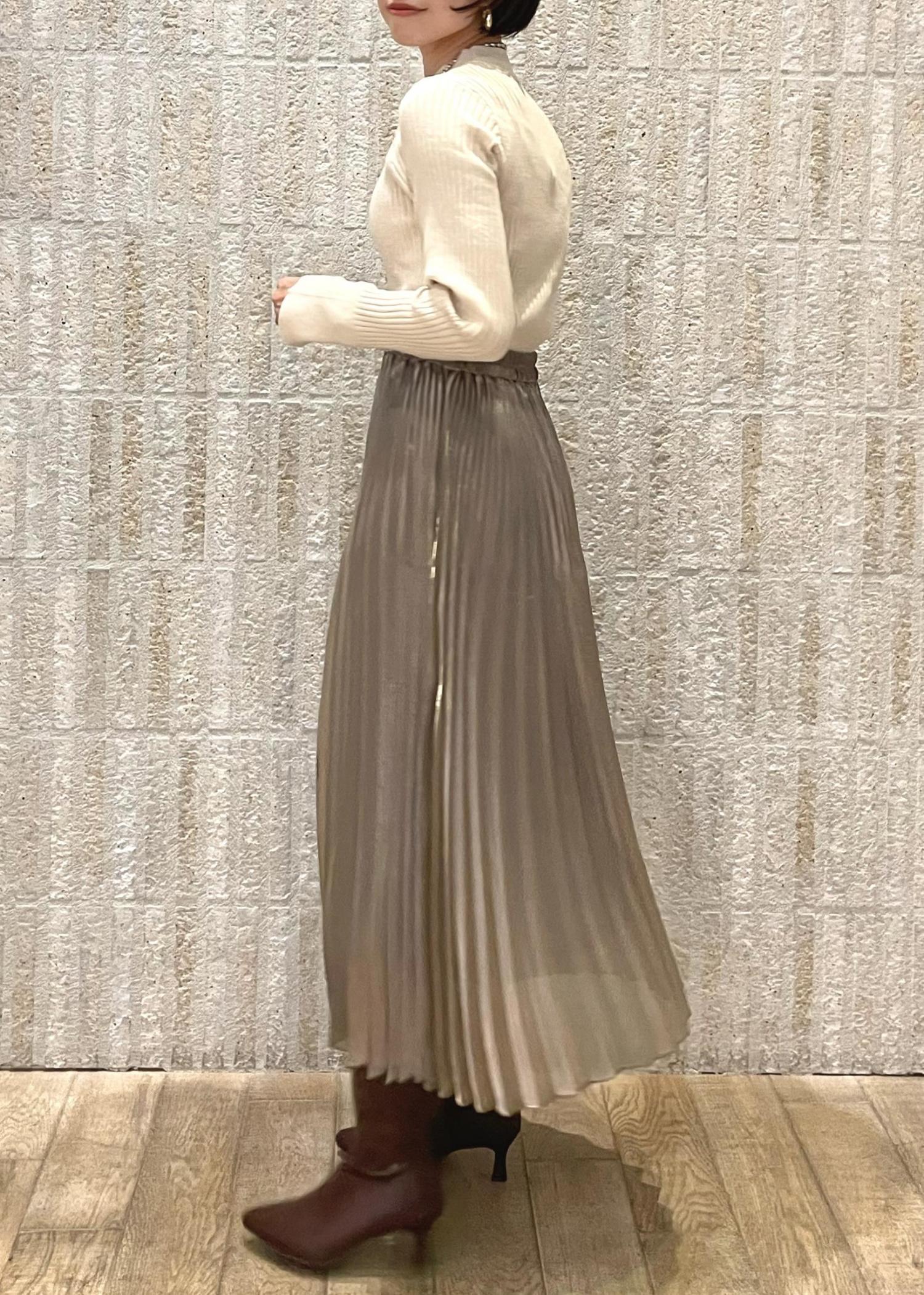 上品な光沢感のプリーツスカートで合わせた
