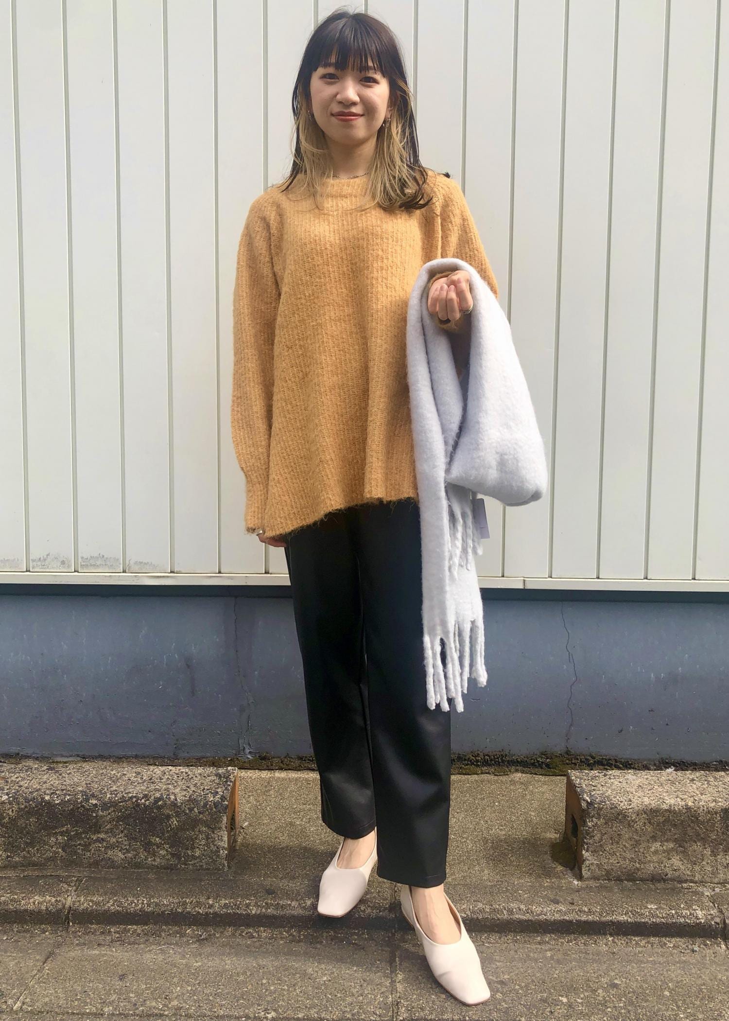 レザーパンツで締めて大人のふんわりコーデにしてみました。