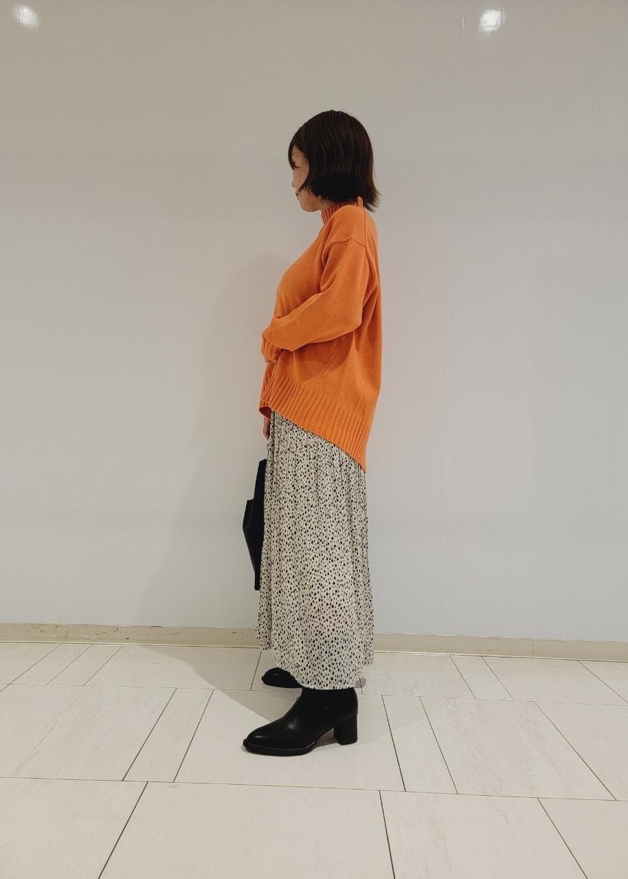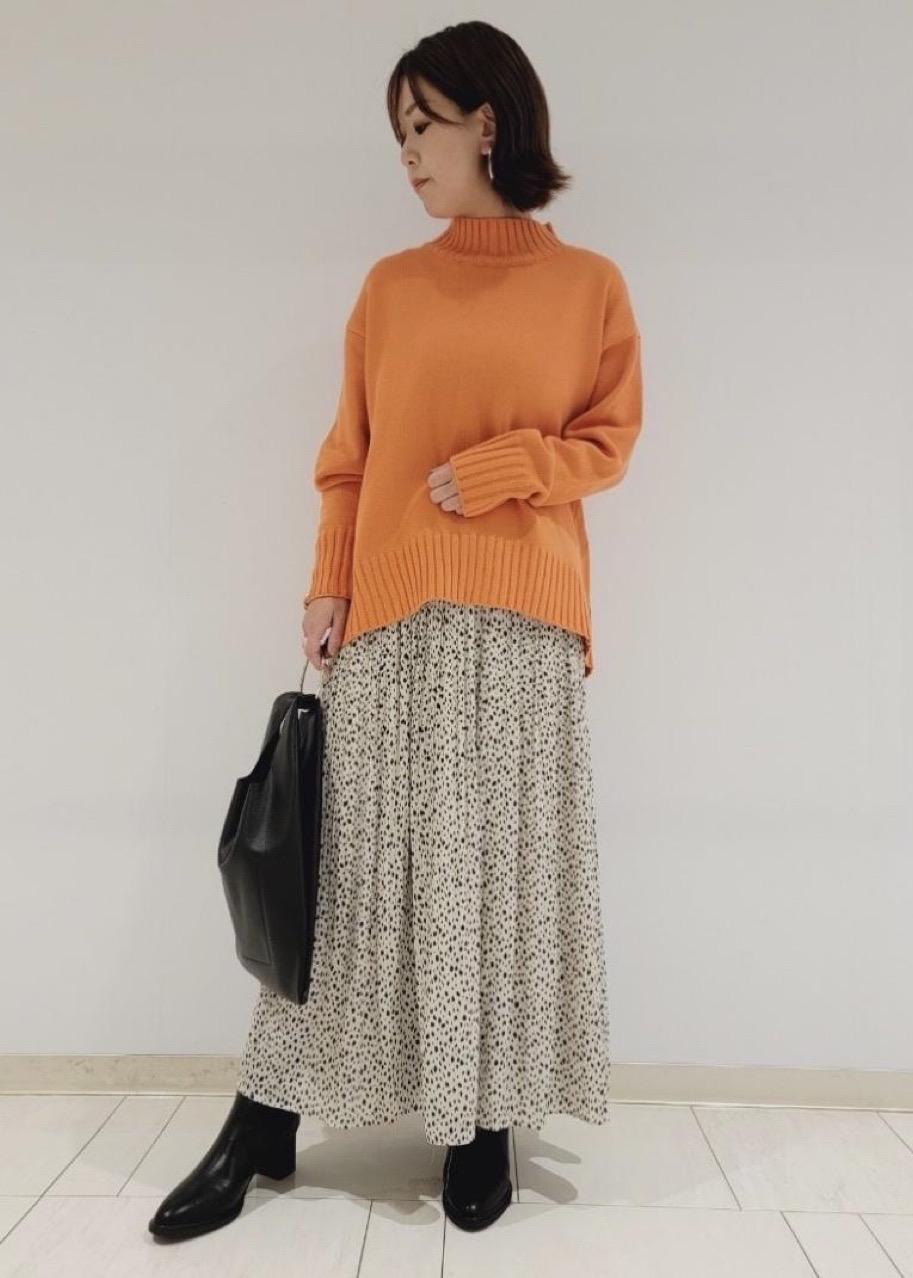 カラーニット×柄プリーツスカートの組み合わせ♫