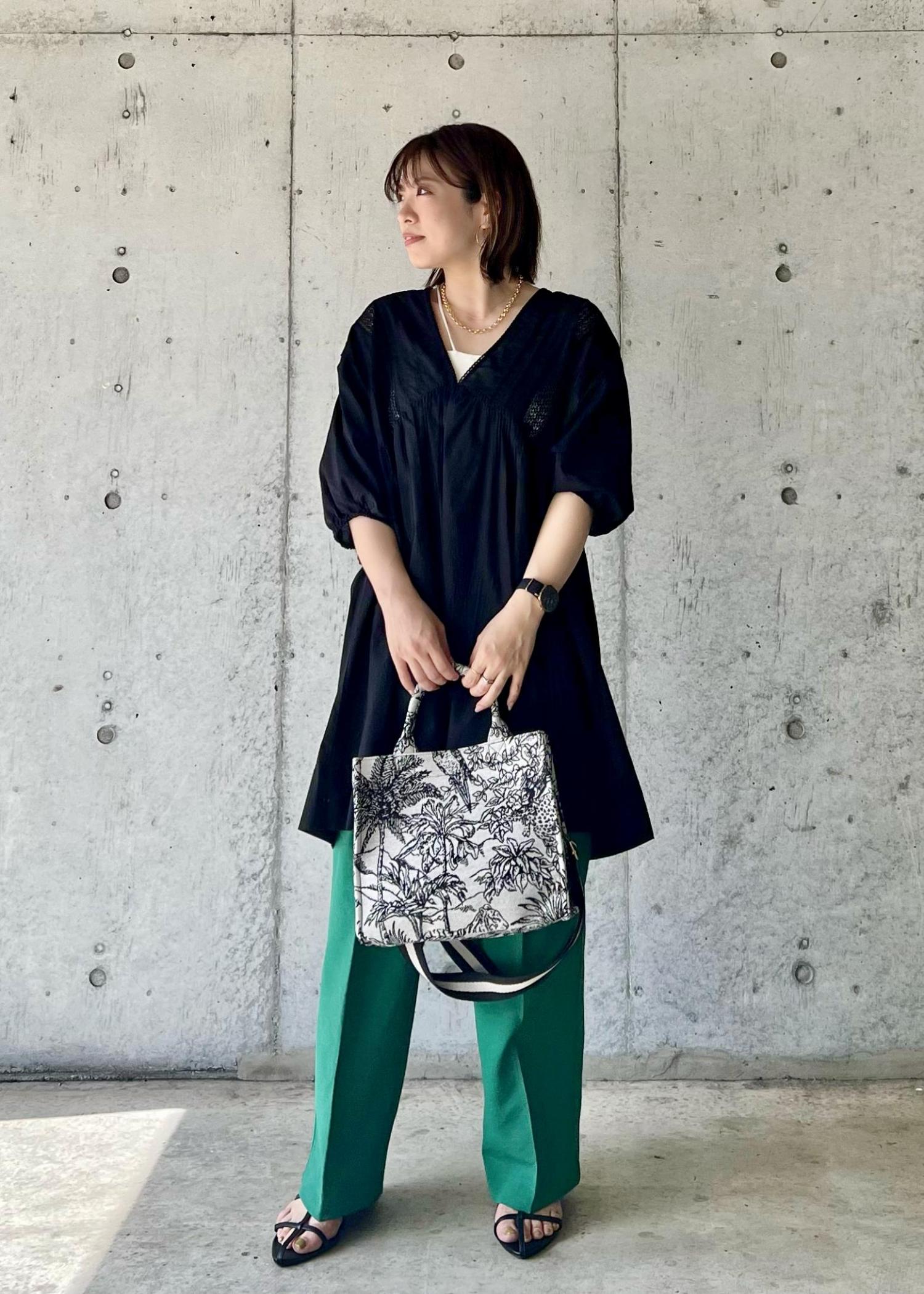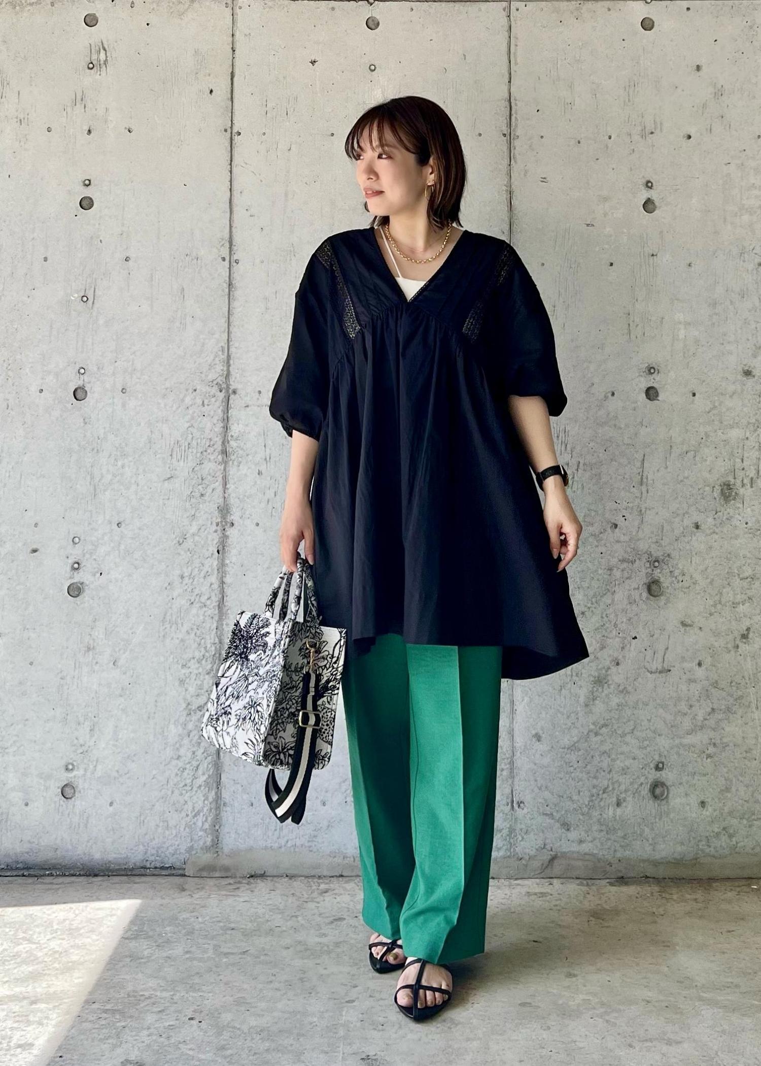 カラーが映える!大人の綺麗めカジュアルスタイル♪ 一見甘めのチュニックブラウスもBlack×Greenのパキッとしたカラーでまとめることで大人の女性も安心して着られます◎ ゴールドアクセで統一感をだし、足元はトレンドのストラップサンダルで抜け感をプラス♪ 深Vネックで顔まわりがすっきり見えるので、骨格ストレートさんでもバランス良く着ていただけます! ぜひお試しください♡ LINEで在庫のお問い合わせや商品、コーディネートのご相談など是非お気軽にお問い合わせくださいませ。 LINEでラゾーナ川崎VISスタッフにご相談は【友だち追加】をタップ!!