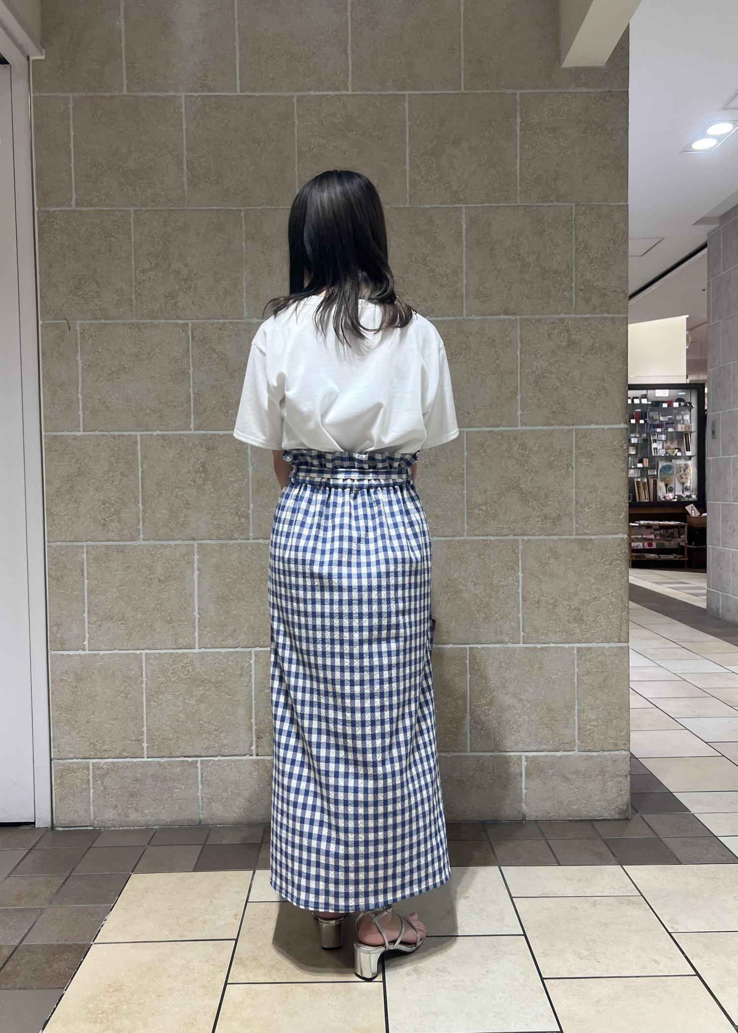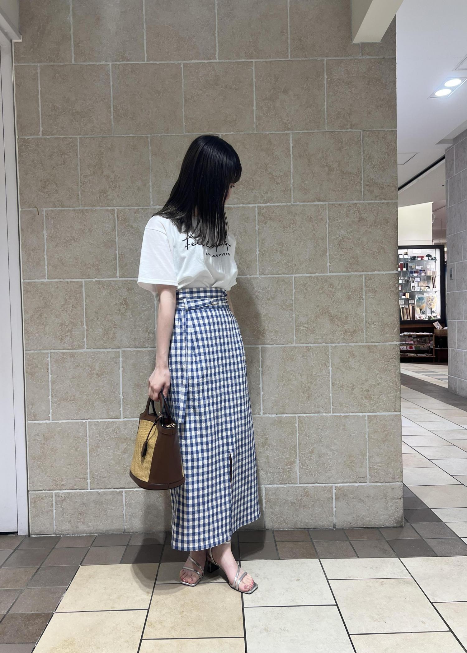 白のロゴTシャツに爽やかなブルーのチェックスカートを合わせて、暑い夏を乗り切れる爽やかコーデを組んでみました