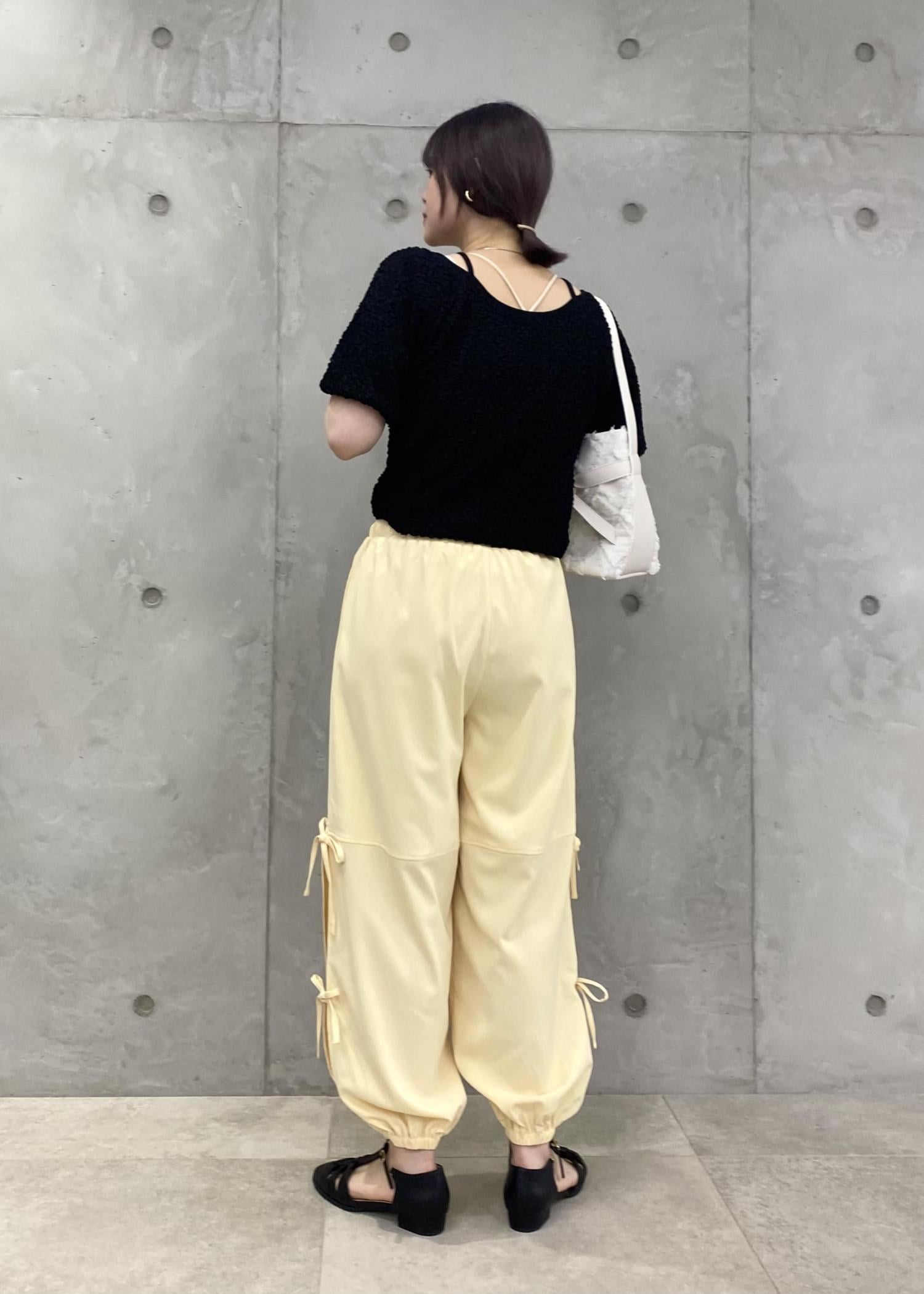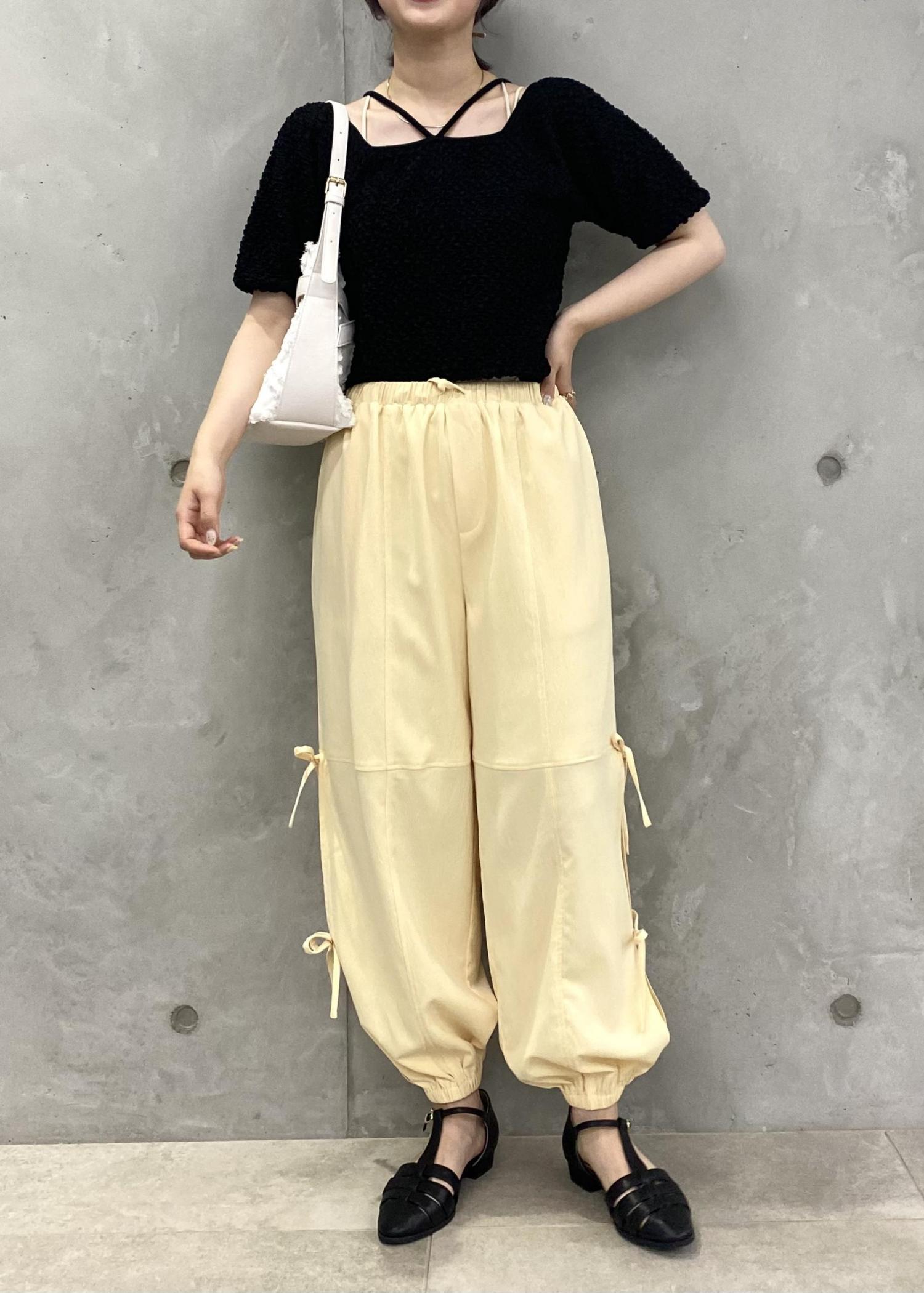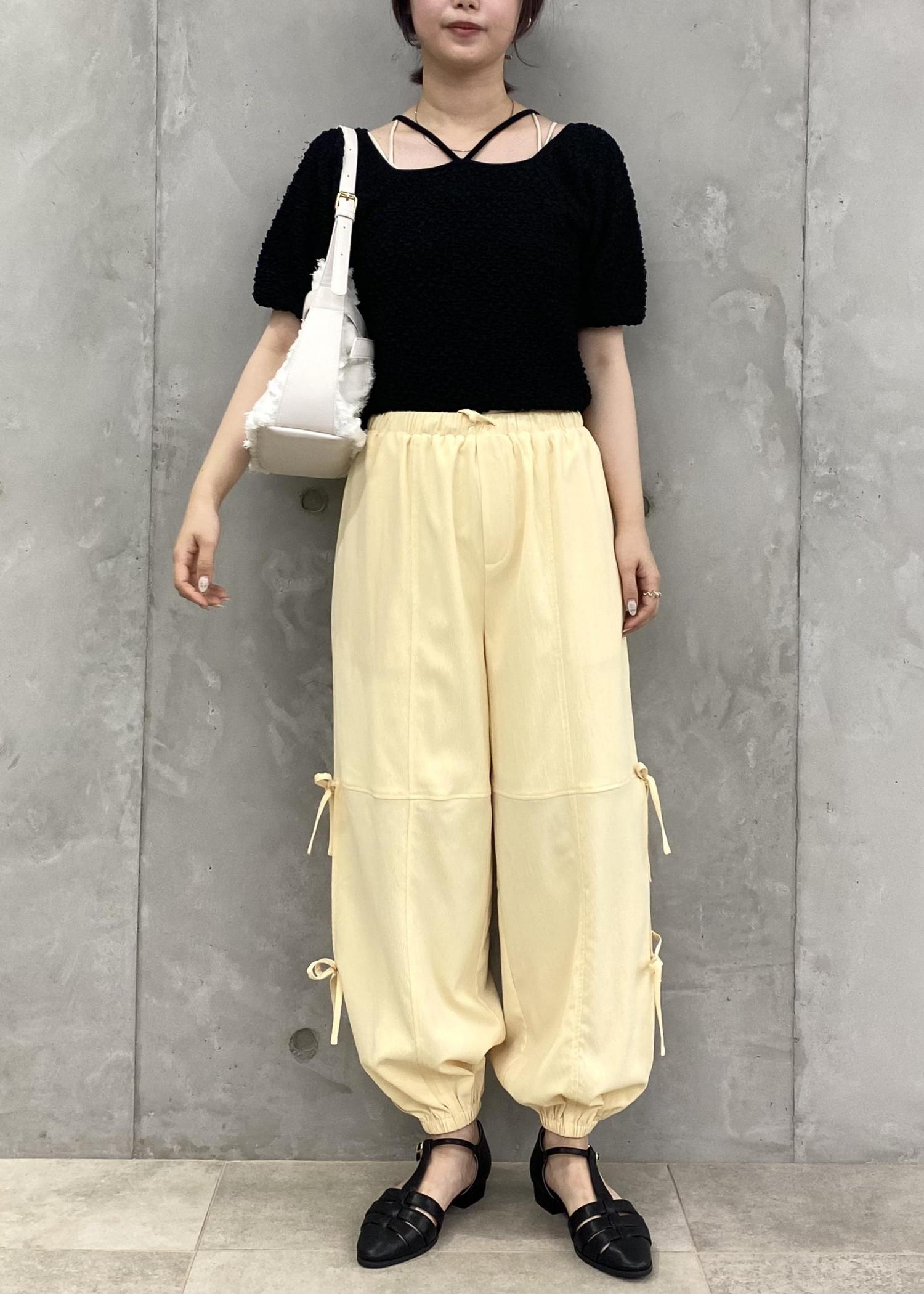 トレンド感あるカーゴパンツに、マルチWAY仕様可能なアイテムでシンプルな組み合わせながらカラーパンツの柔らかさを生かしたスタイリングに!