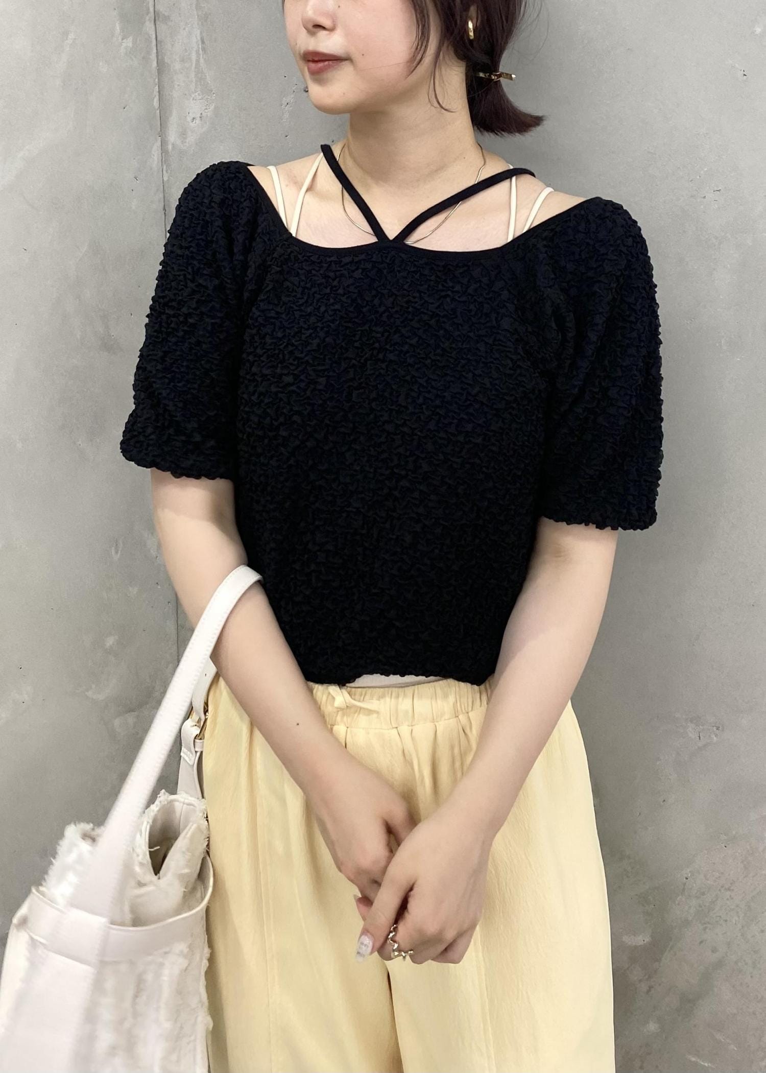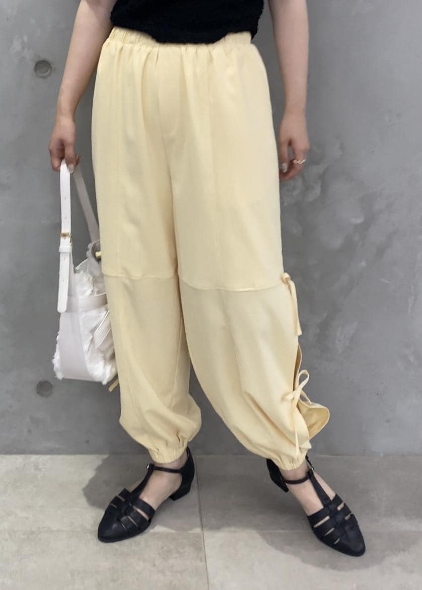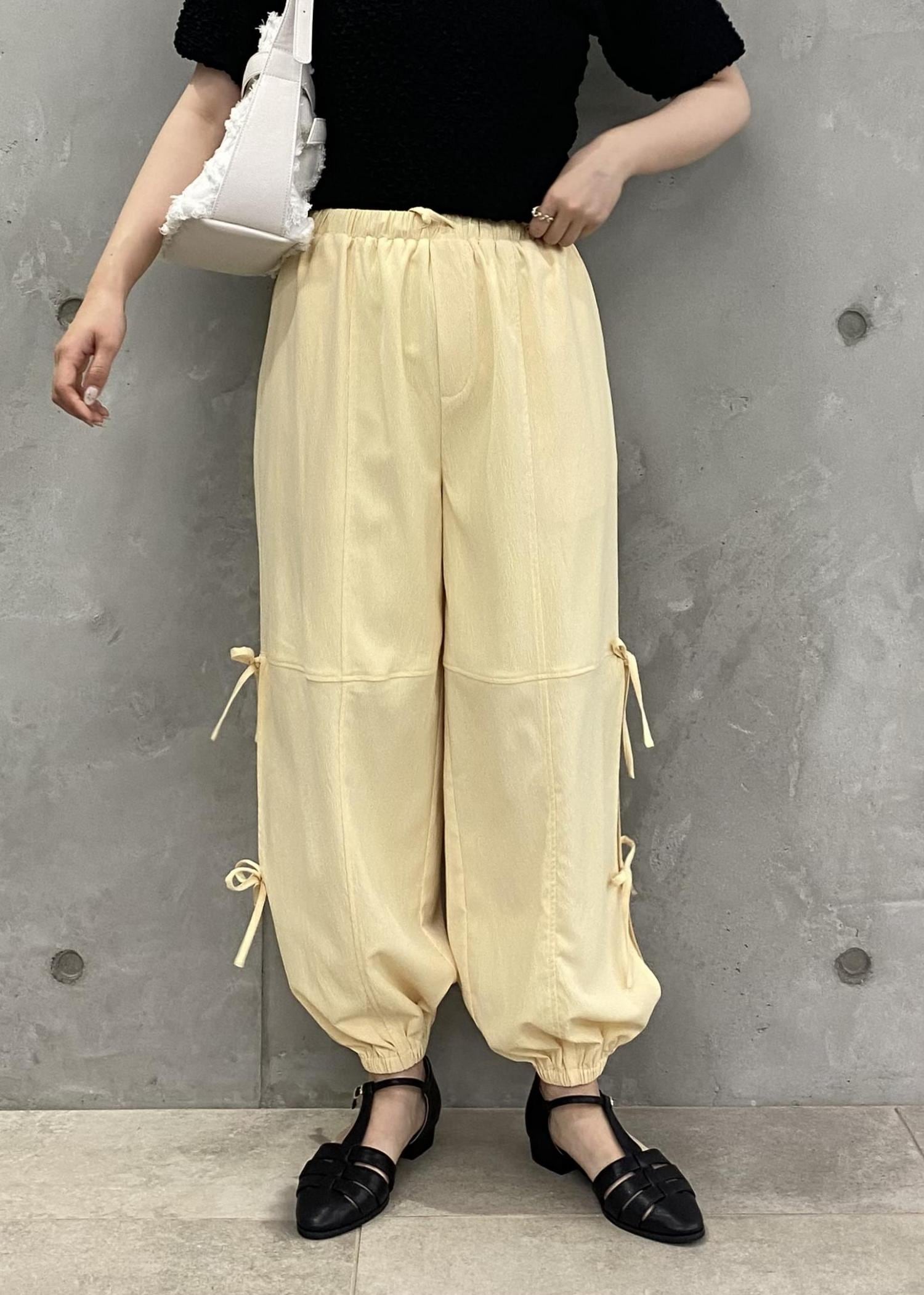 トレンド感あるカーゴパンツに、マルチWAY仕様可能なアイテムでシンプルな組み合わせながらカラーパンツの柔らかさを生かしたスタイリングに!