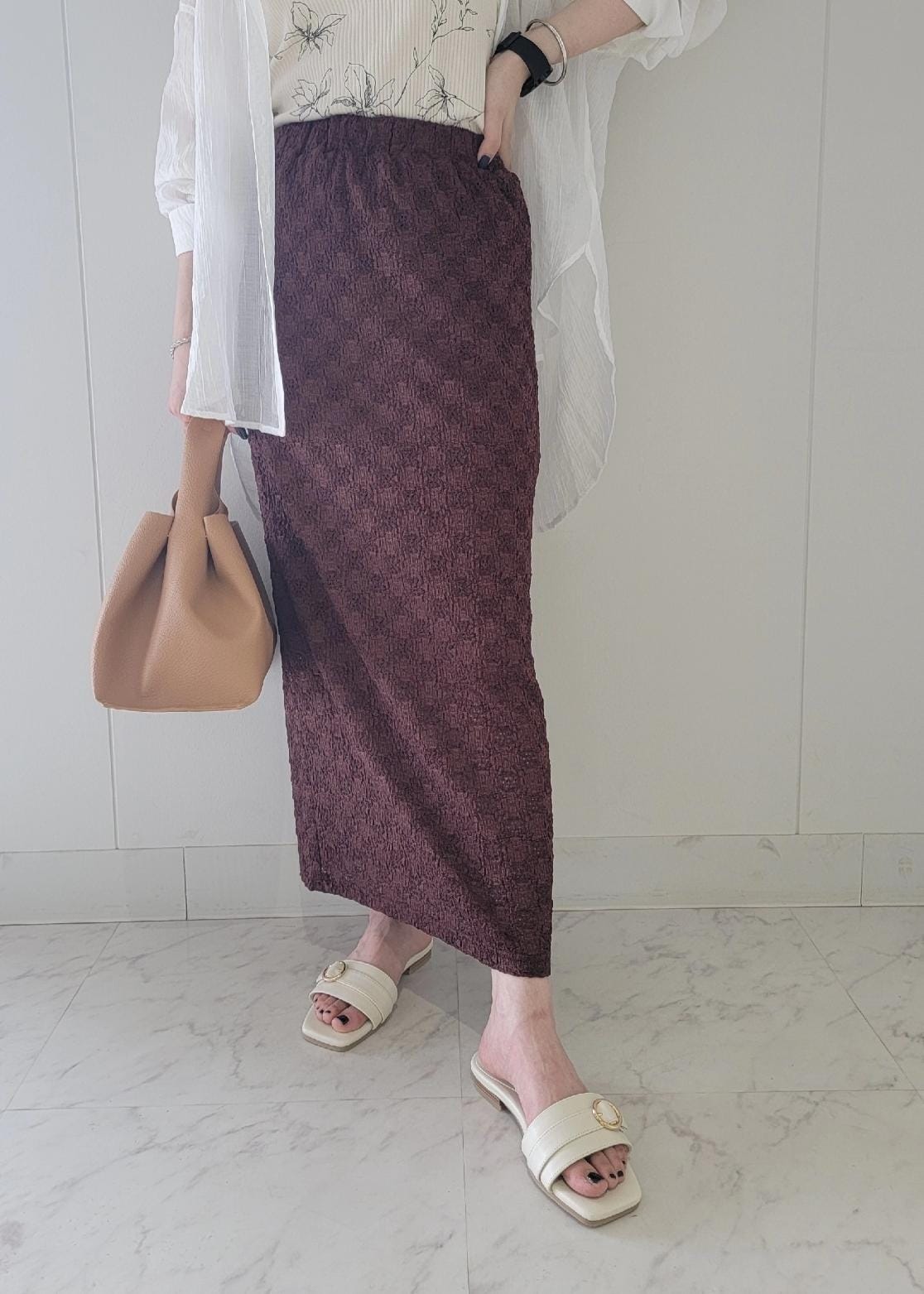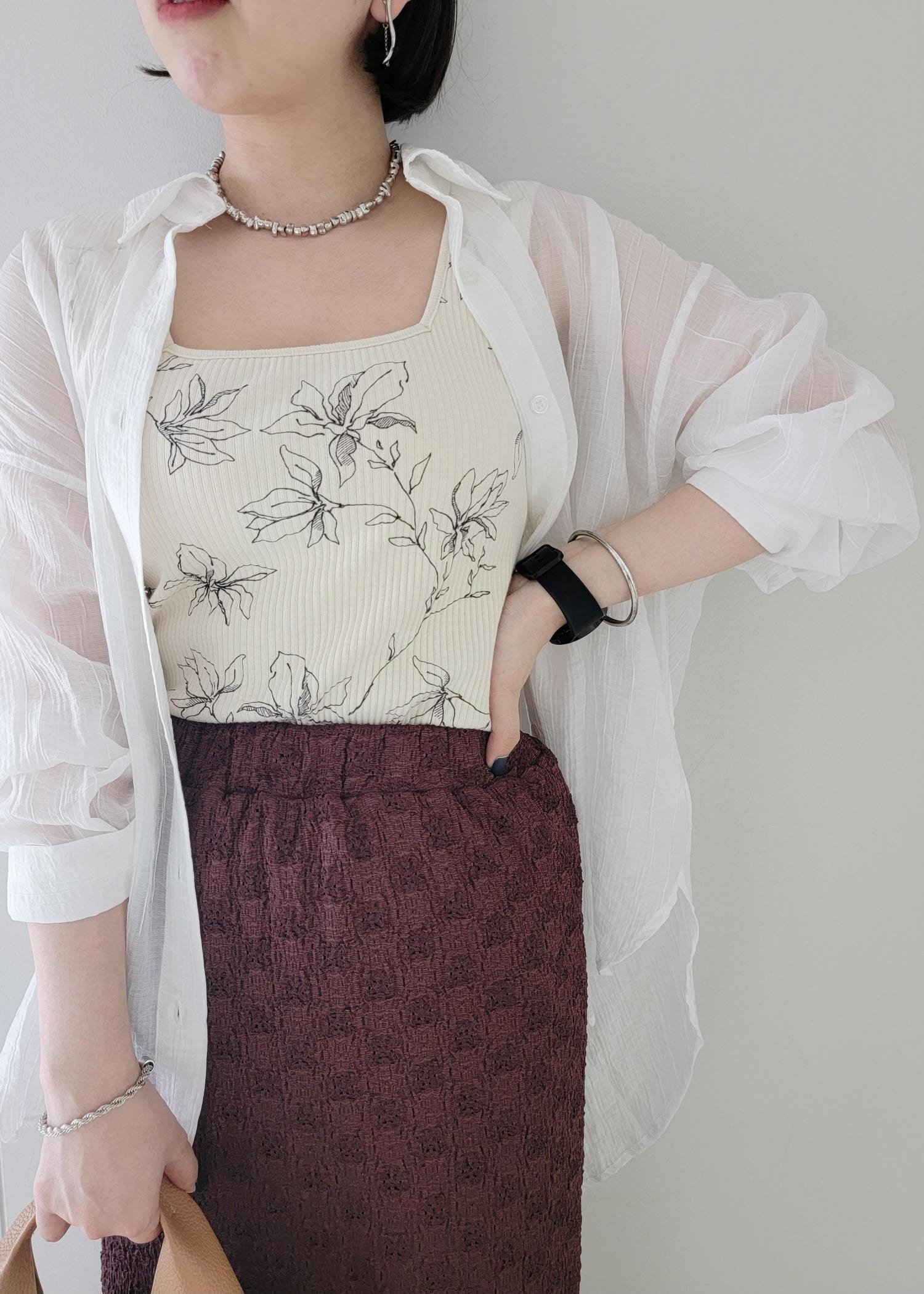 濃いめのブラウンで高見え◎!花柄タンクで女性らしく、シアーシャツを羽織に二の腕カバーと今年らしさをプラスしました。