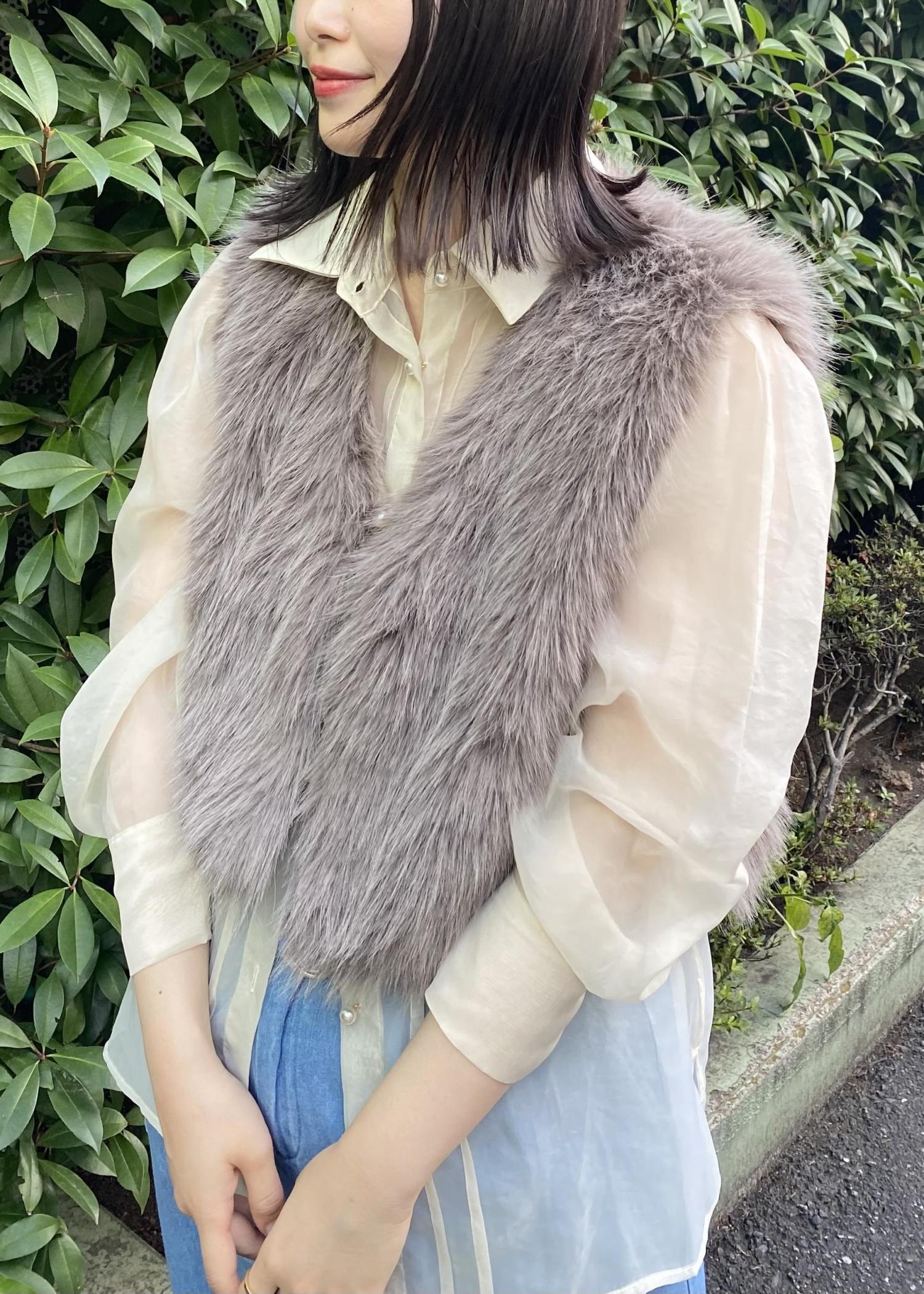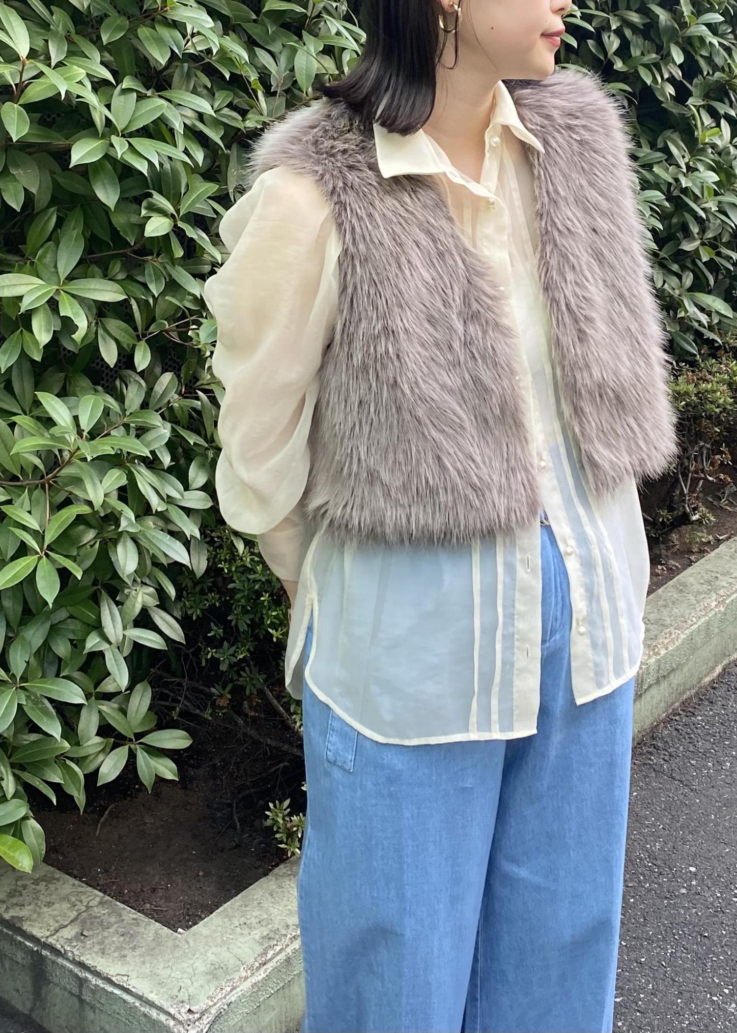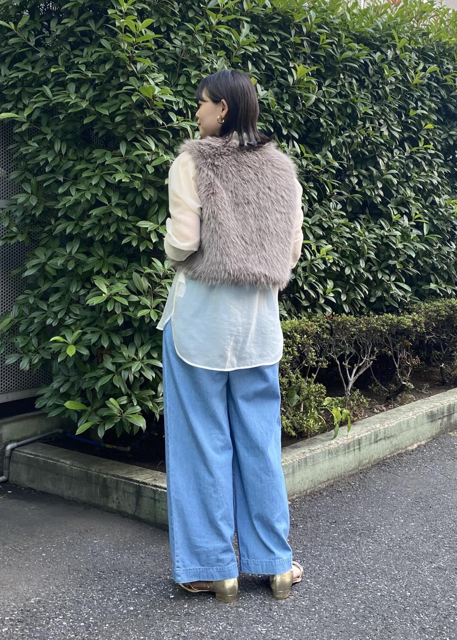 トレンド感あるショートファーベストにツヤ感あるシアーシャツを合わせ、大人っぽい女性らしいコーディネートに! デニムワイドパンツでカジュアルにも着用できます◎
