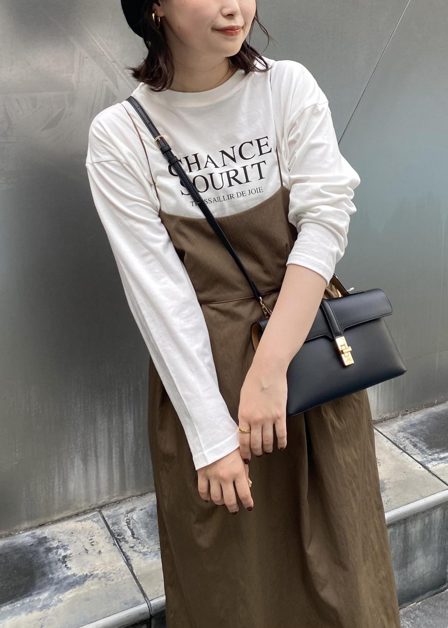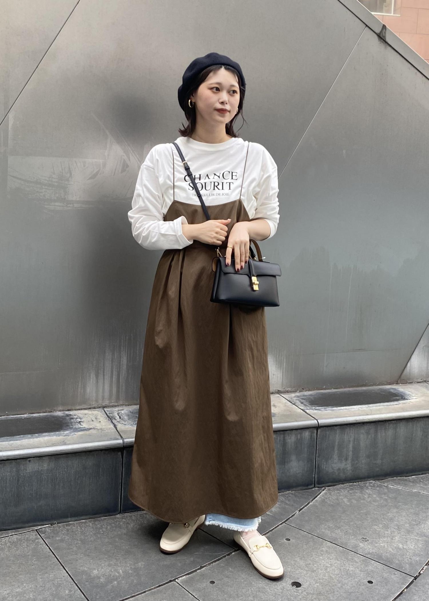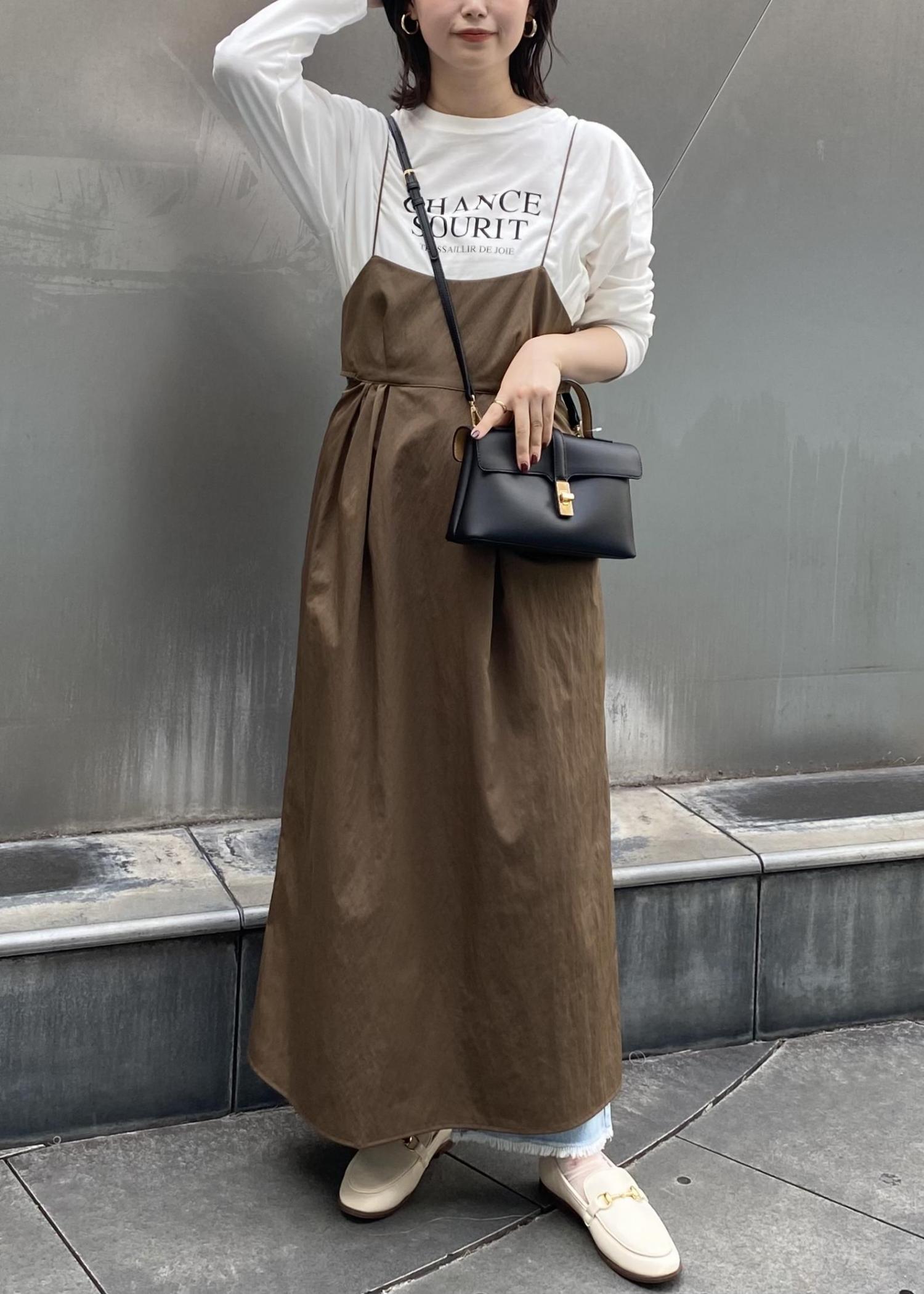 カーキのキャミワンピースにロゴのロンTと合わせ、デニムも合わせカジュアルなレイヤードスタイルに! シューズやバック、帽子で秋らしさ◎