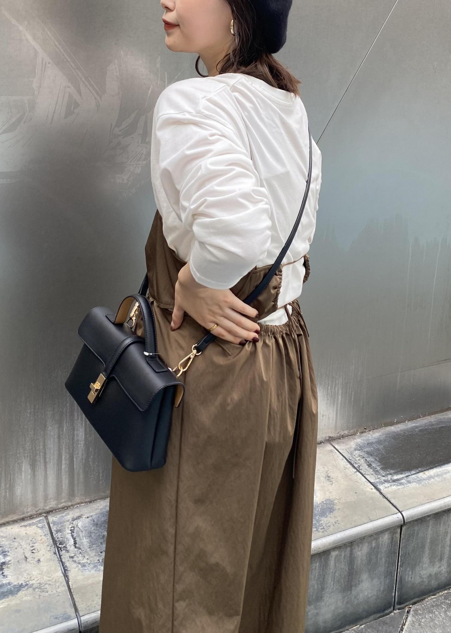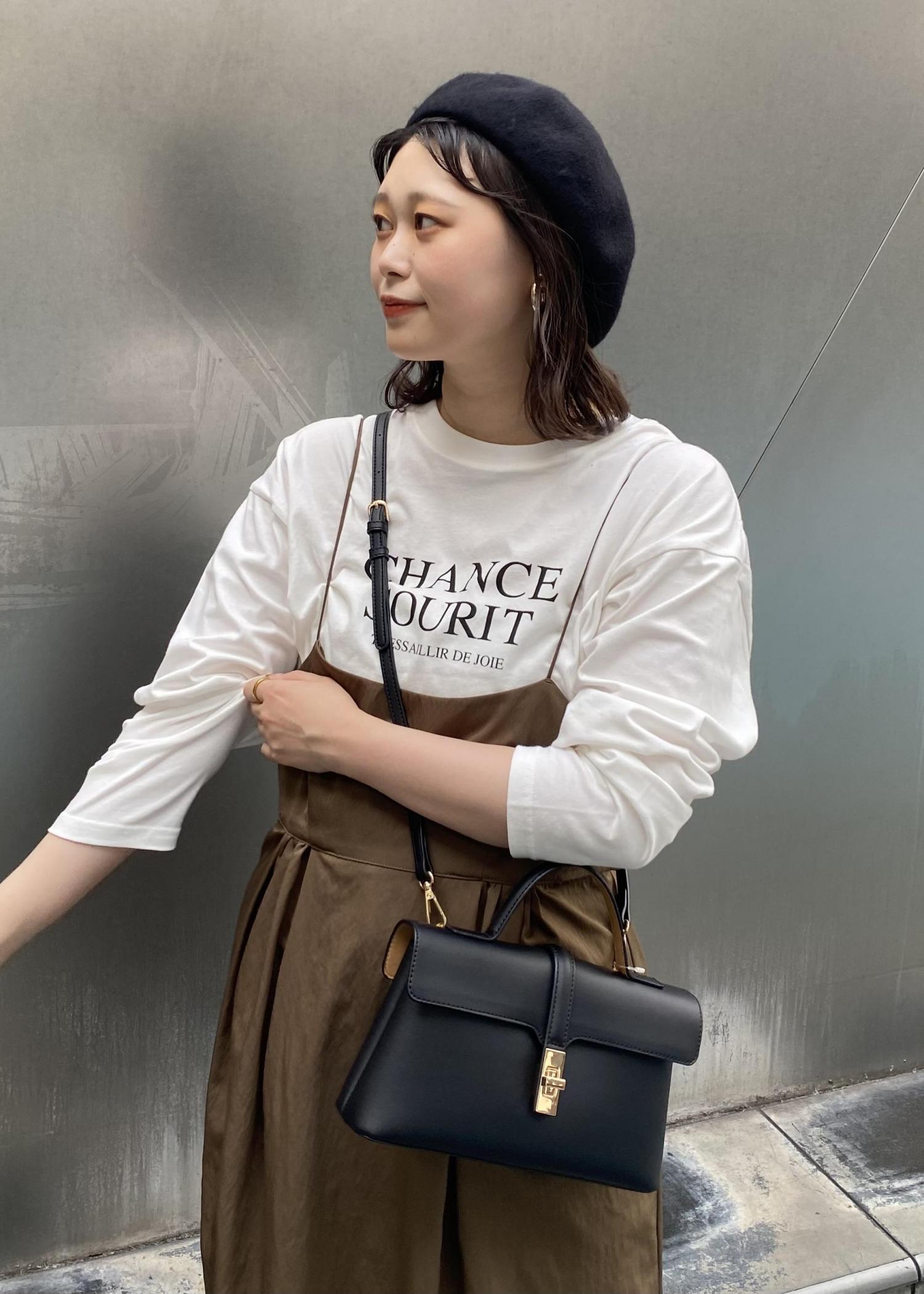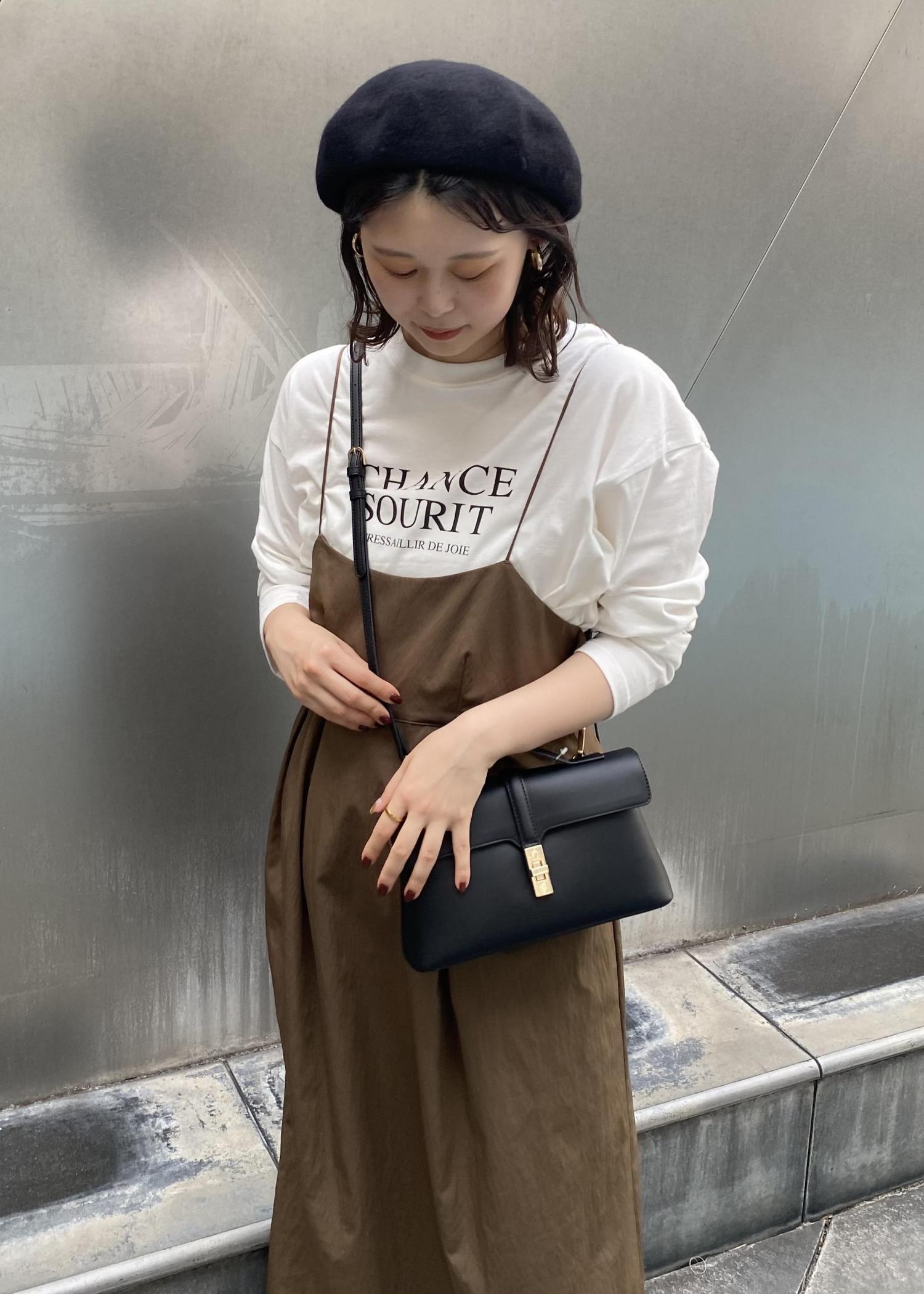 カーキのキャミワンピースにロゴのロンTと合わせ、デニムも合わせカジュアルなレイヤードスタイルに! シューズやバック、帽子で秋らしさ◎