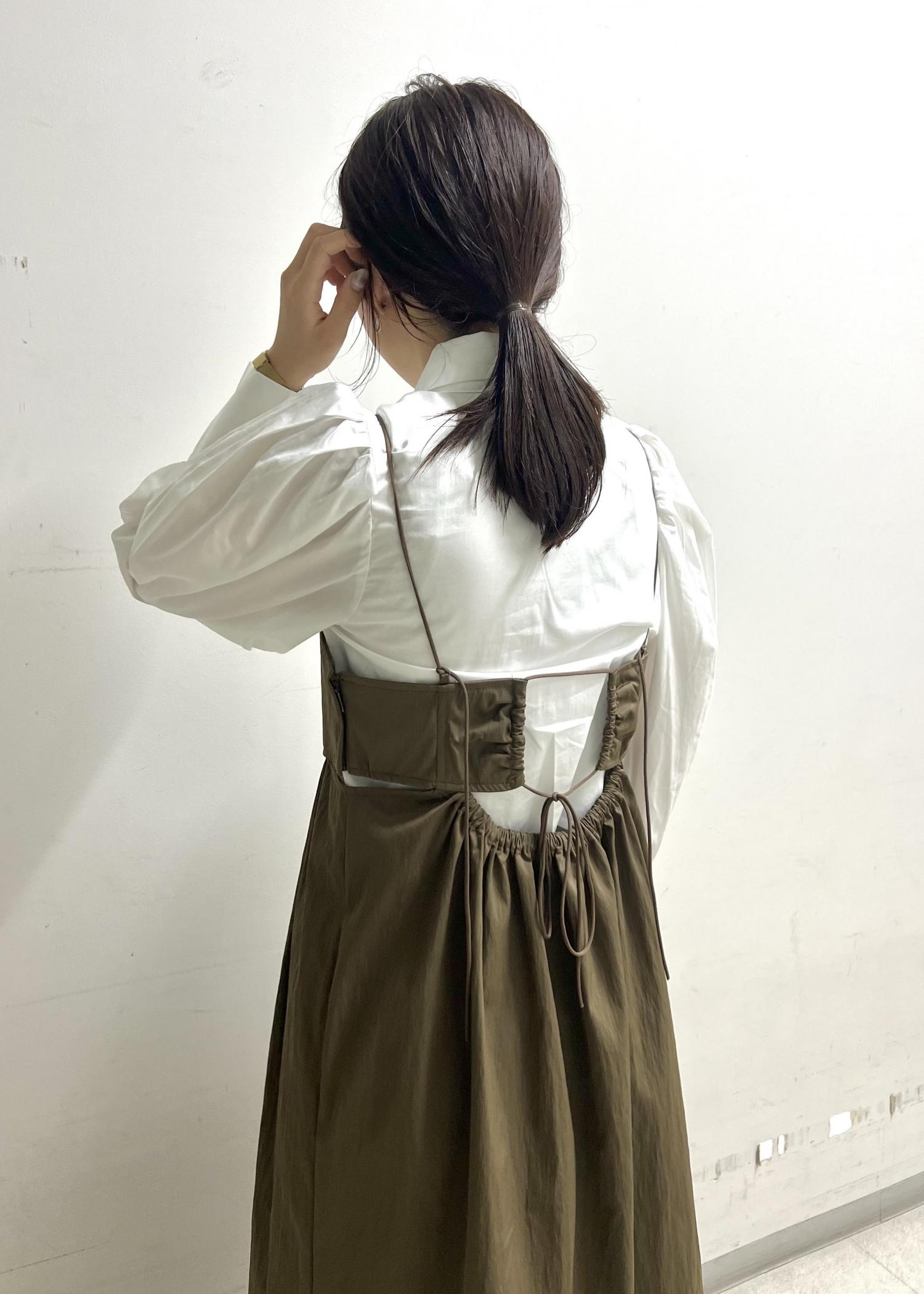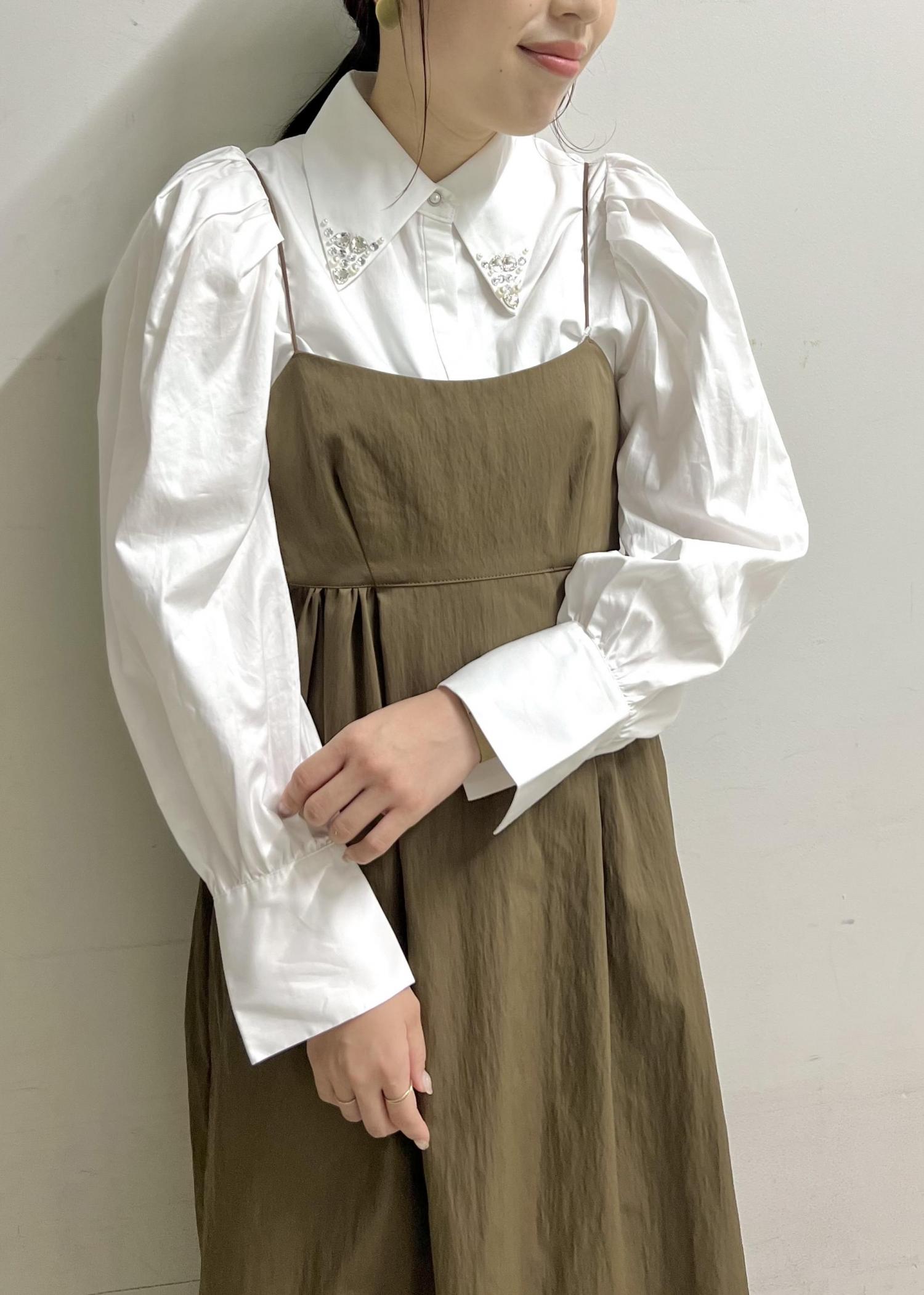 バックデザインが可愛いキャミワンピです。 胸下で切替が入るので、 ロングワンピでもメリハリがついて すっきり着用出来ます◎ 今回は夏場はTシャツ等で合わせていた キャミワンピをビジュー付きシャツにチェンジ。 秋意識しつつ、襟元のビジューが華やかさと 女性らしさもプラス出来るようにしました。
