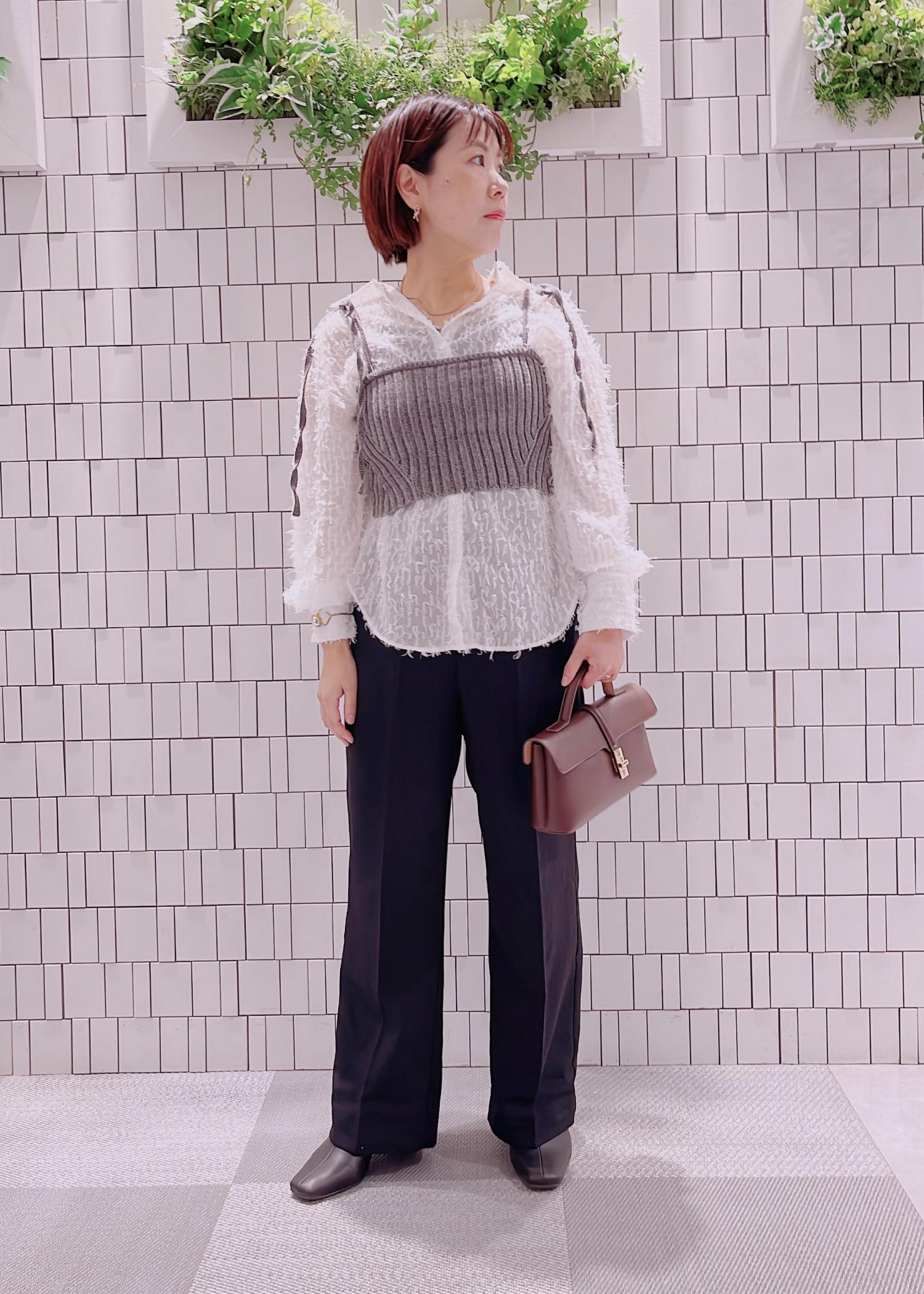 モノトーンなコーディネートにトレンド感のあるモールビスチェを合わせて、キレイめカジュアルな印象にしました!