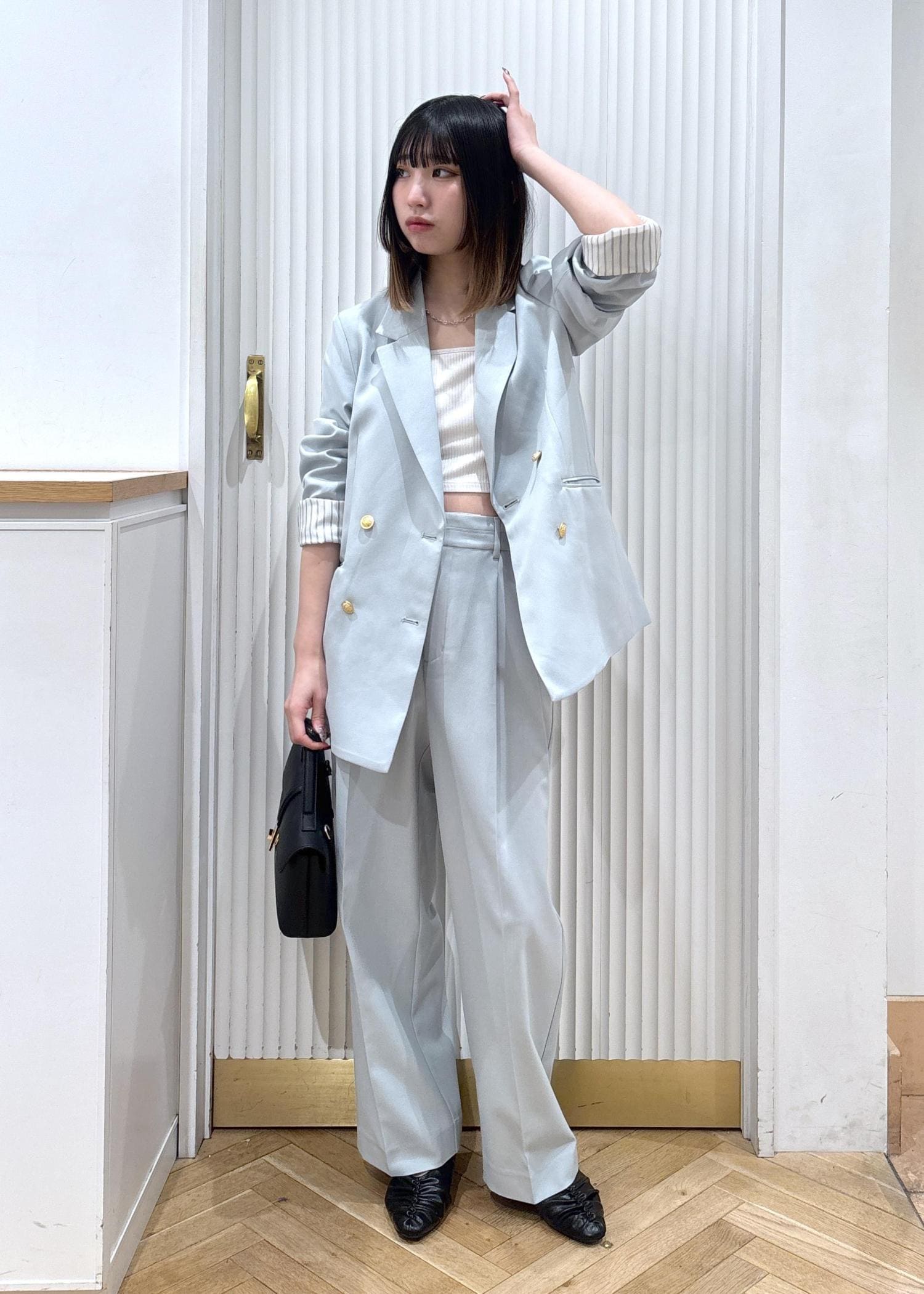 カラーをモノトーンに合わせるだけだと落ち着き過ぎるので、トップスは花柄で華やかさをプラスしました!