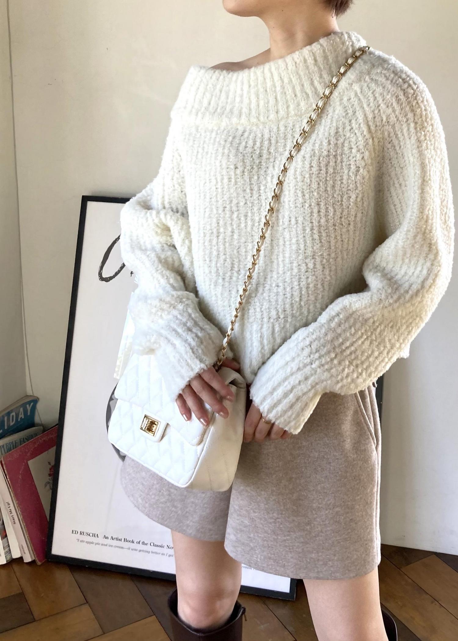 個人的にオフショルは勇気がいるので、片方だけ肩を落として合わせました。