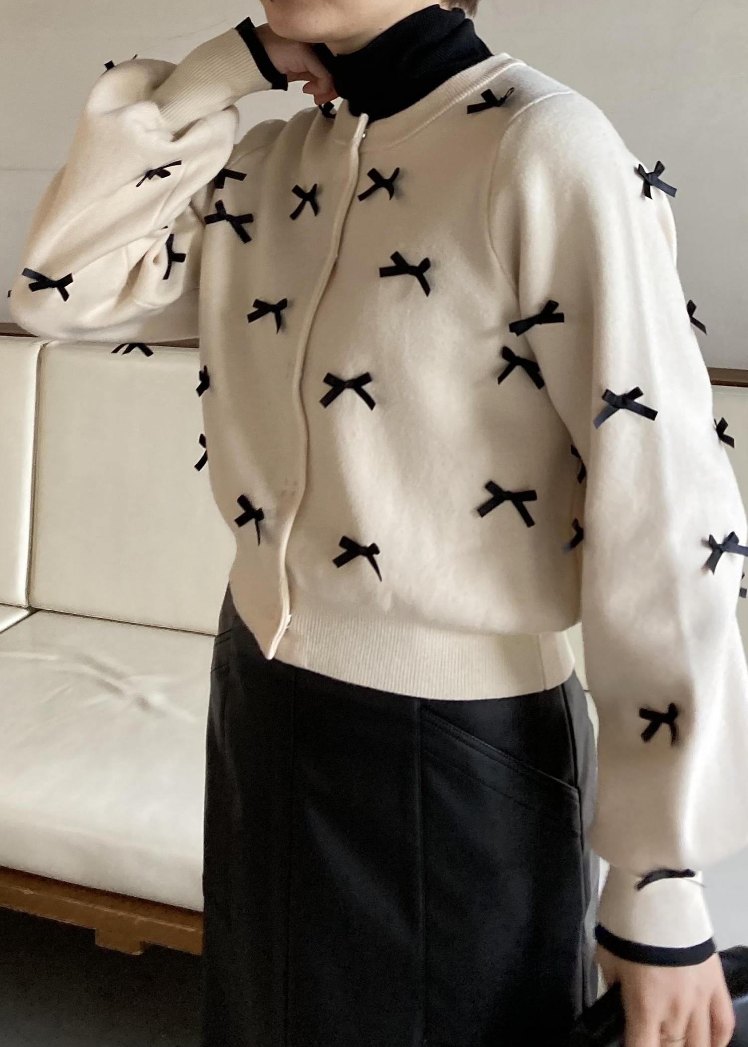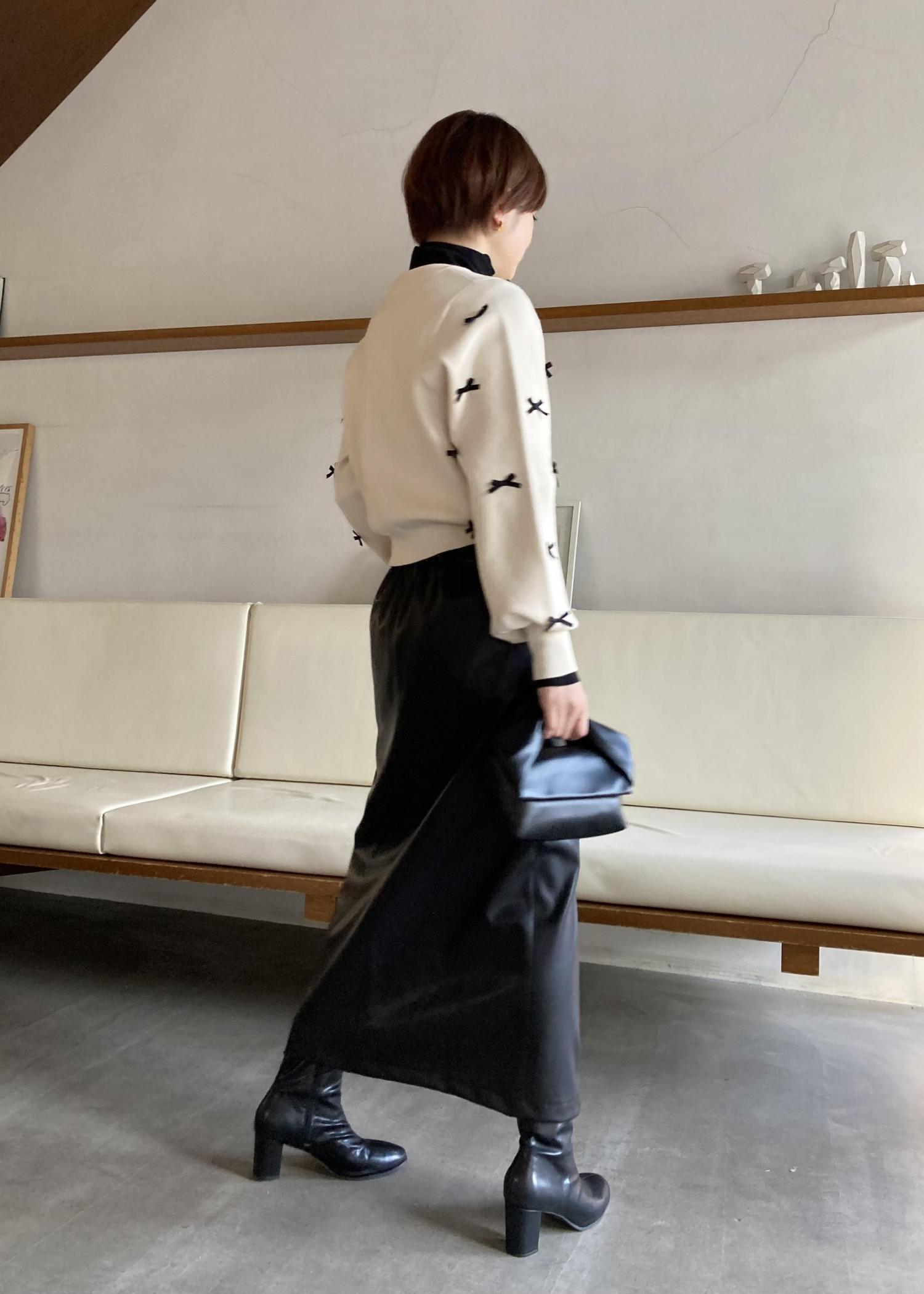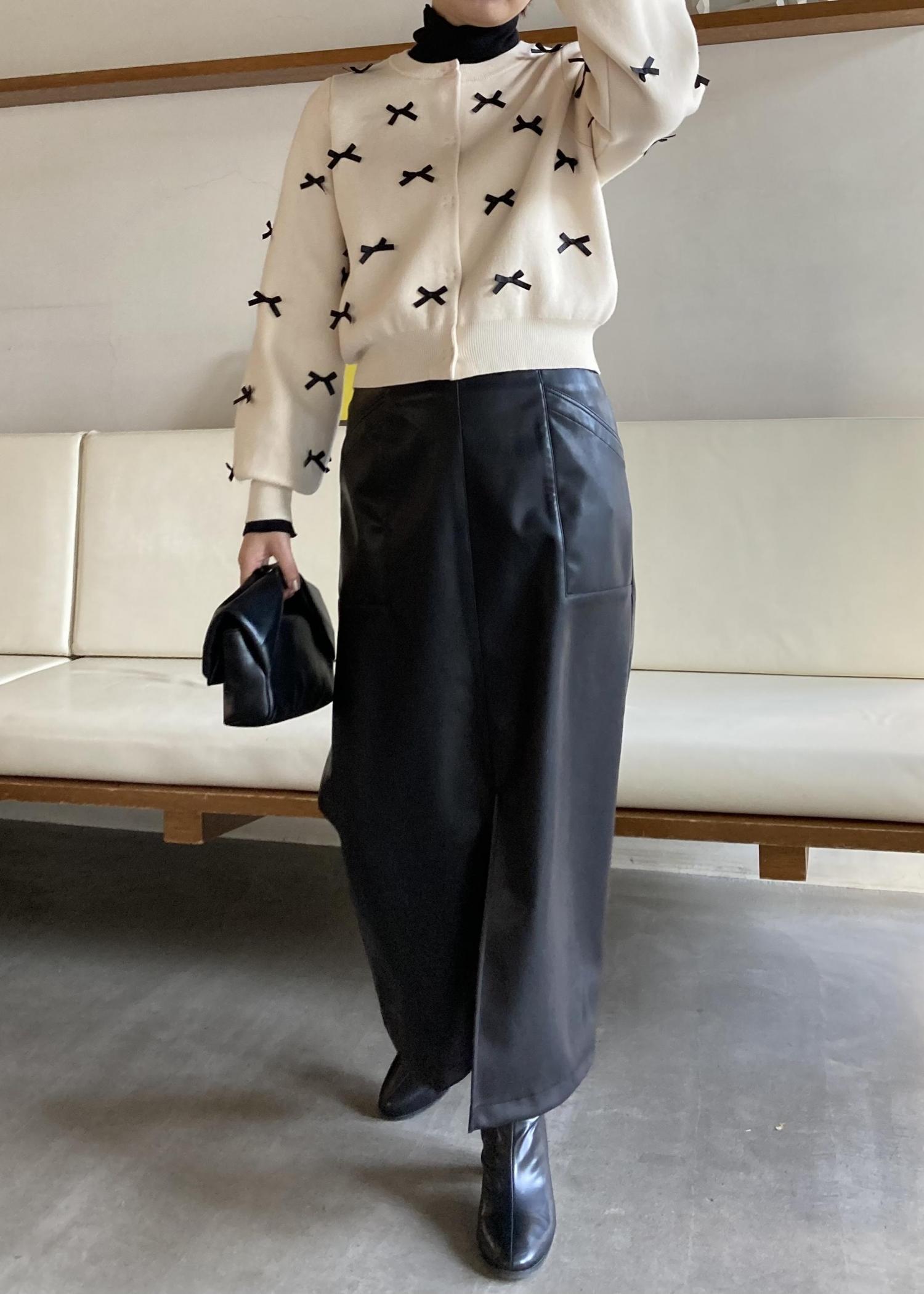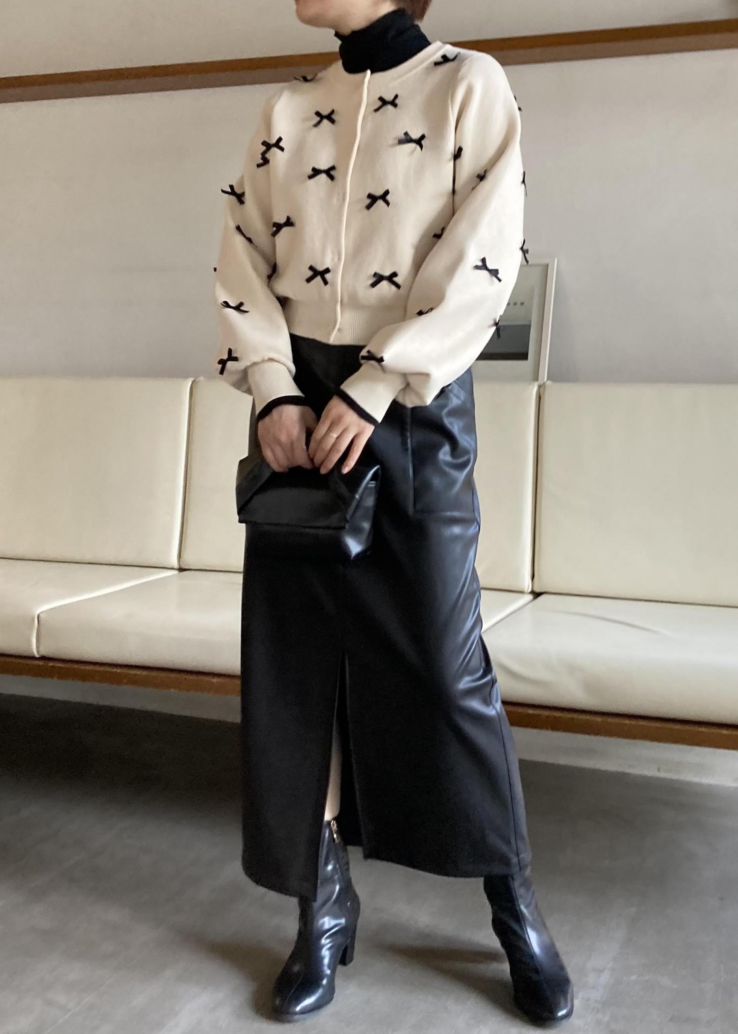 リボンカーデを使った大人コーデです。 カーデ以外はブラックで統一し、ボトムはレザータイトスカートできれい目に。