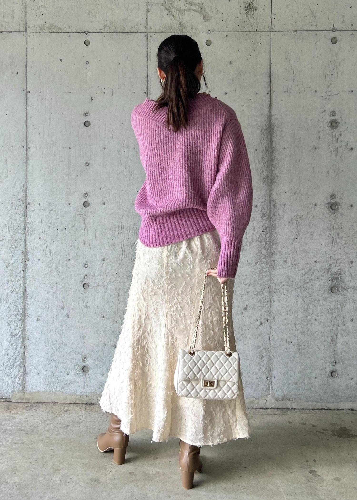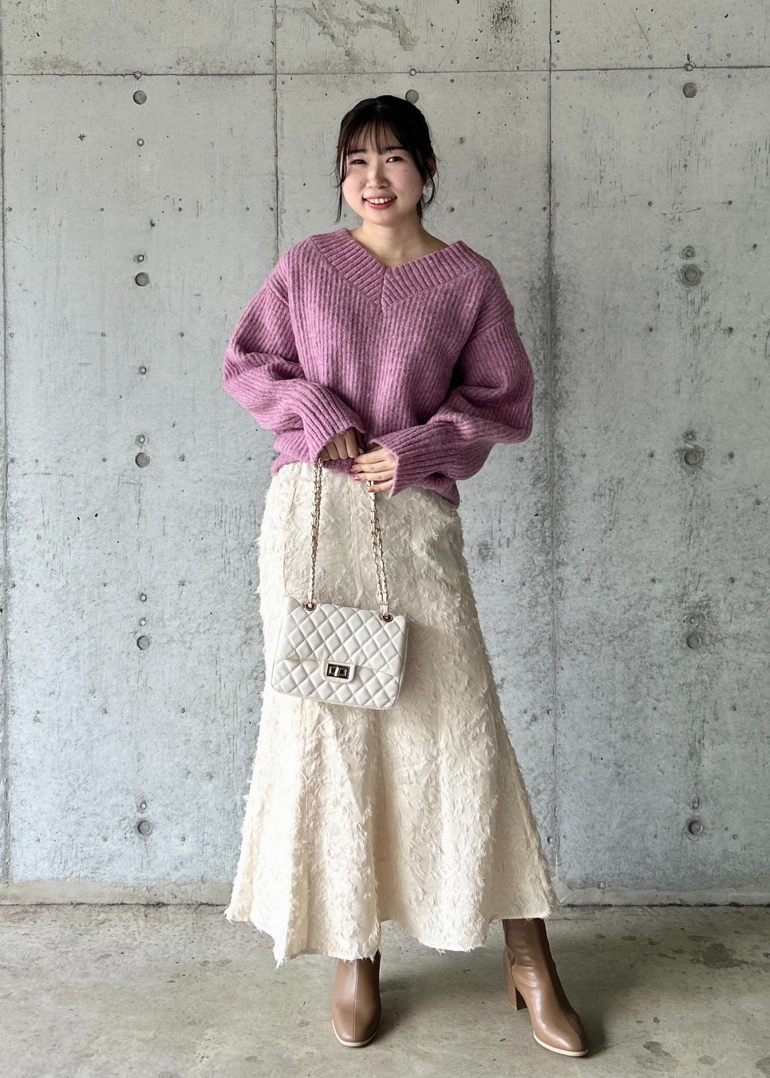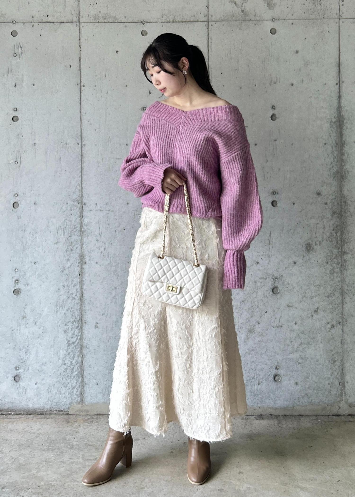 ニットのVネックは広すぎないのでインナーも気にせずきていただけますよ。デコルテが見えて顔周りがスッキリした印象になります!オフショルで着ると少し大人っぽい印象に。