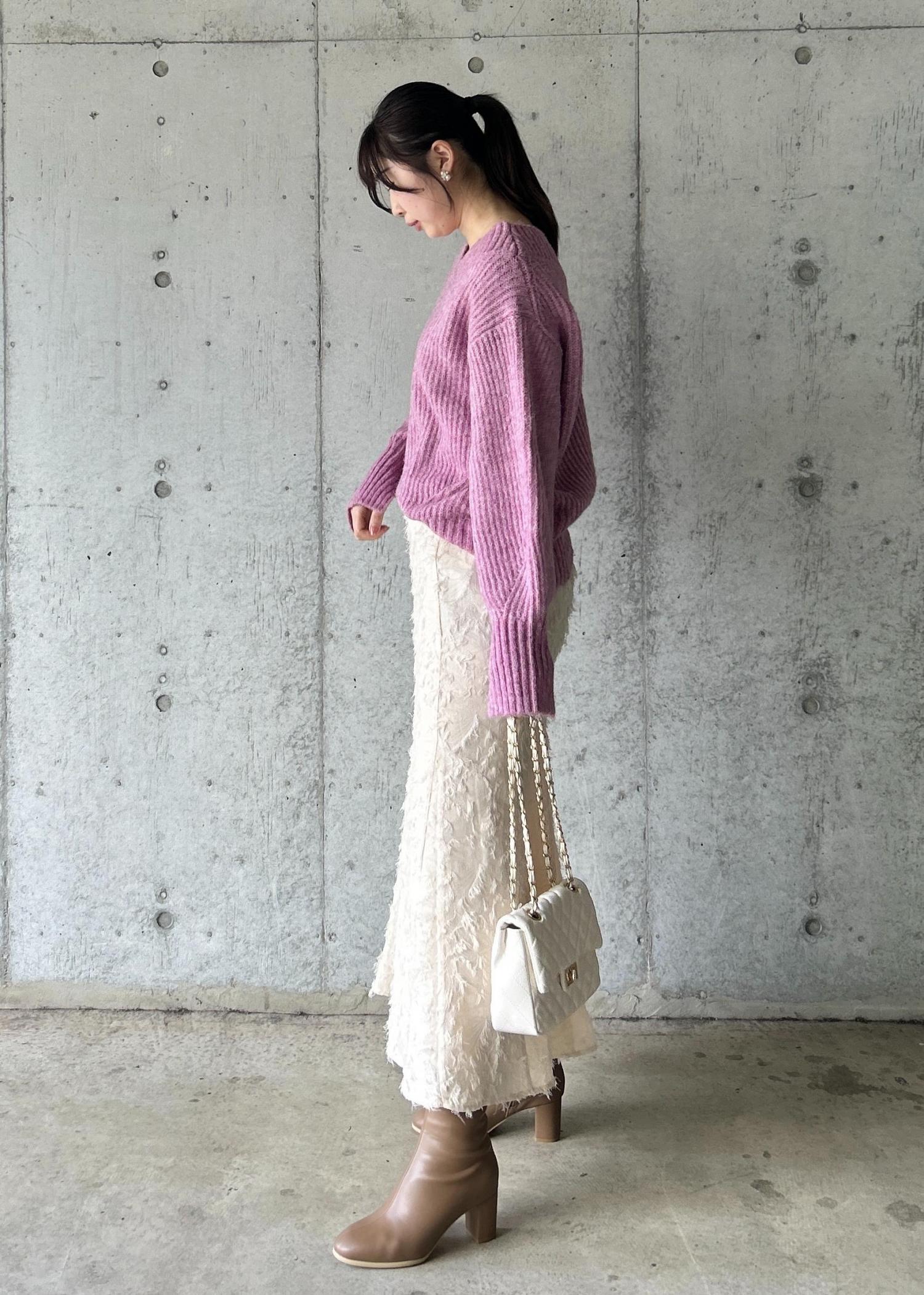 ピンクのニットカーデに白のマーメイドスカートを合わせて、ガーリーな雰囲気に。冬のデートにぴったりのコーデにしました♪