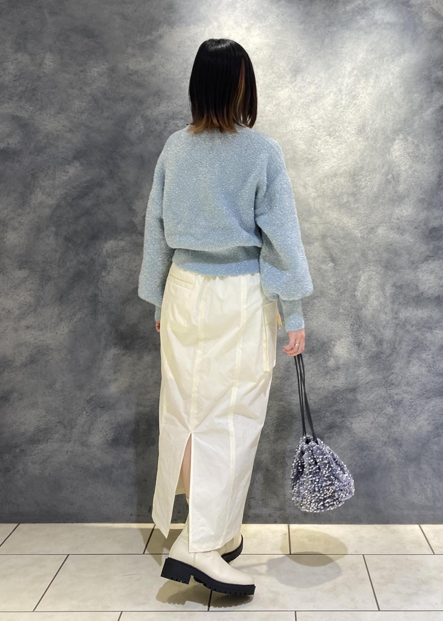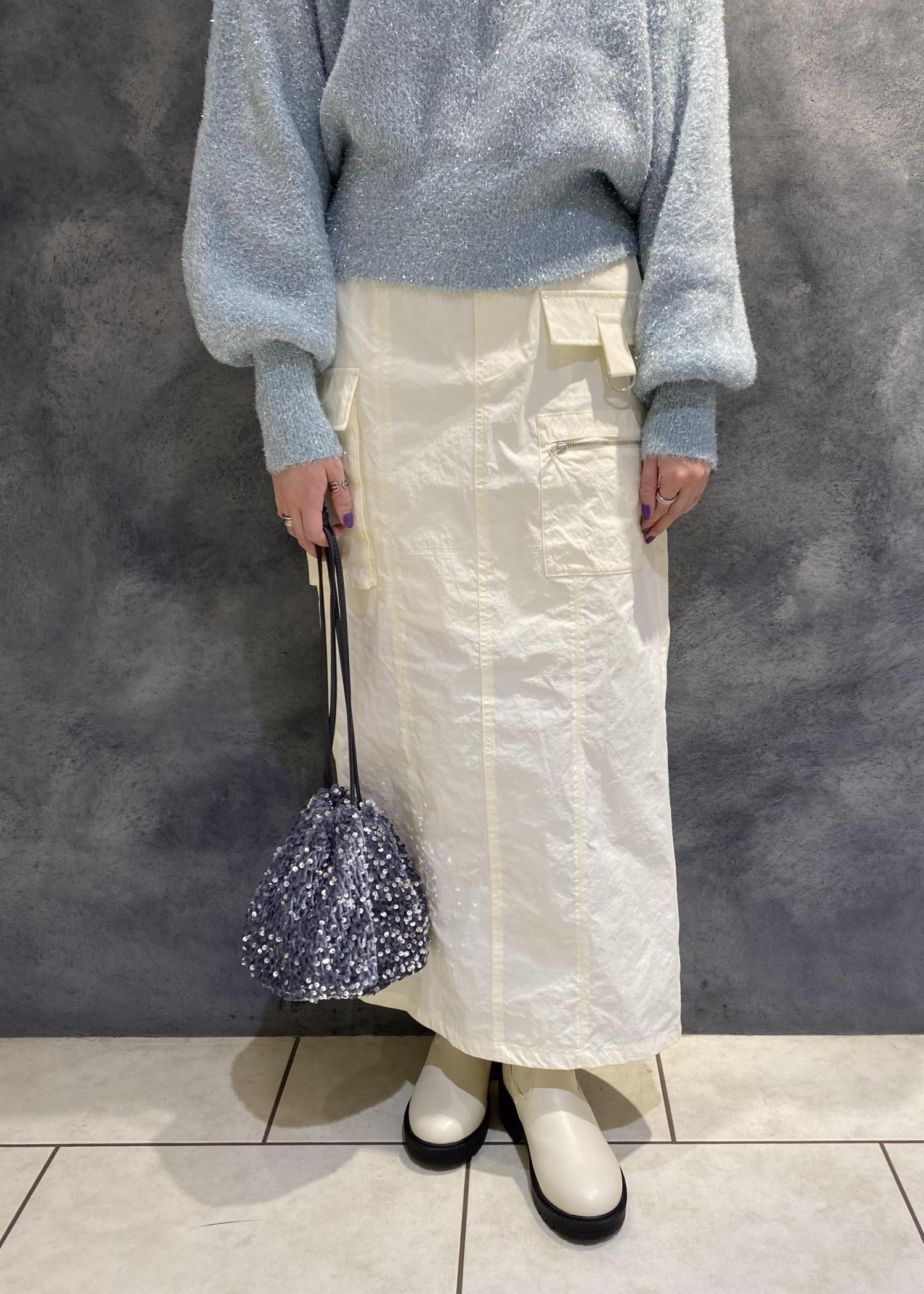 ギラギラしすぎないブルーのラメニットと外でも暖かい裏起毛のカーゴスカートで冬のお出かけコーデ♩