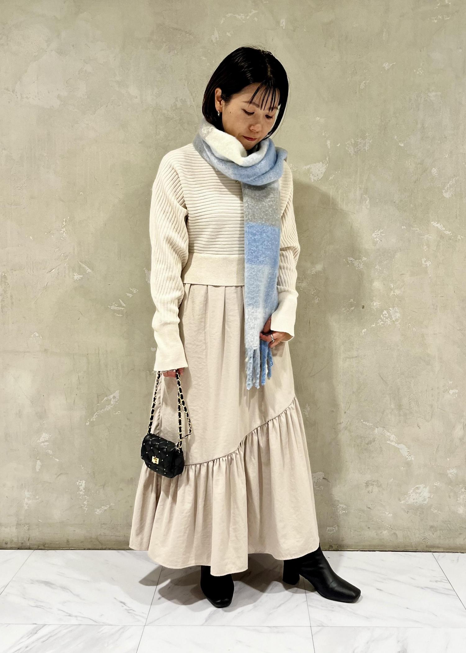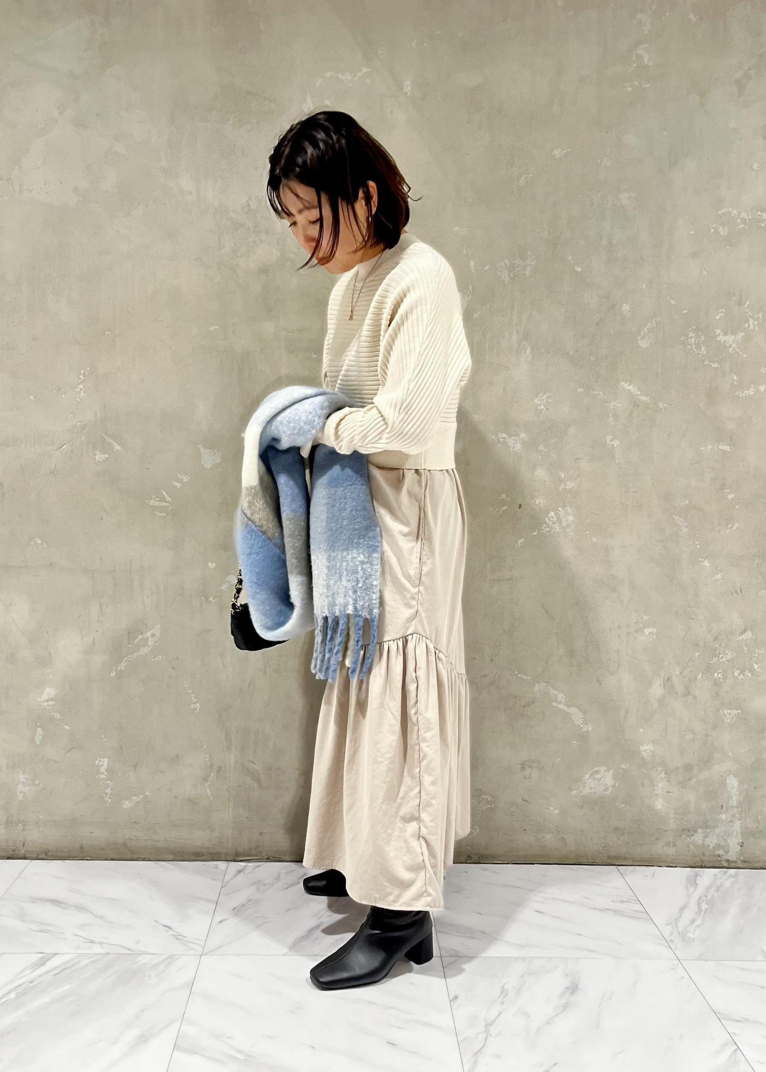アイボリー系のニットとスカートのドッキングワンピースに差し色で柔らかい水色のマフラーをプラスしました。