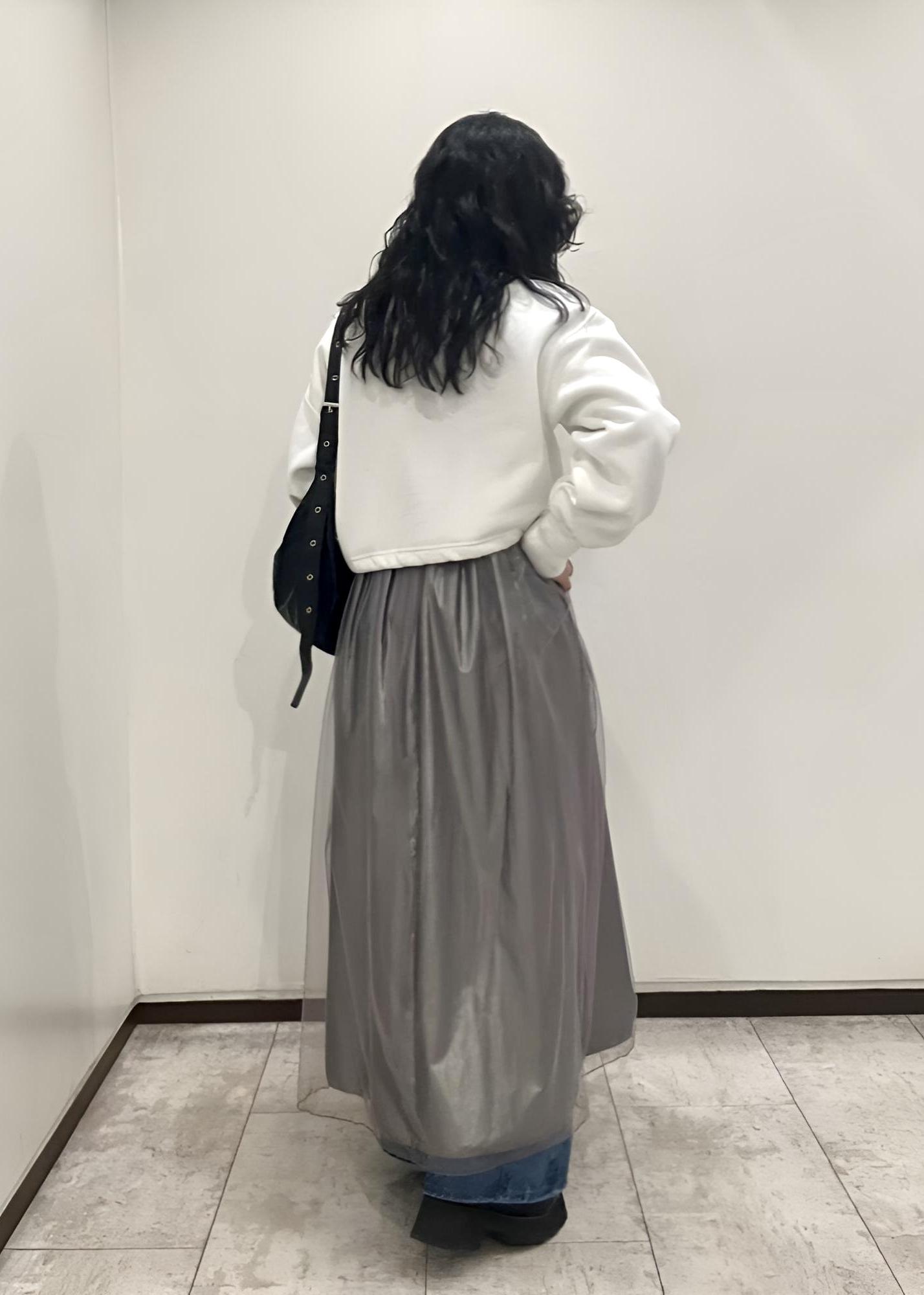コラボスウェットがシンプルめなデザインなので、ひと癖あるレイヤードコーデにまとめました( ◠‿◠ )