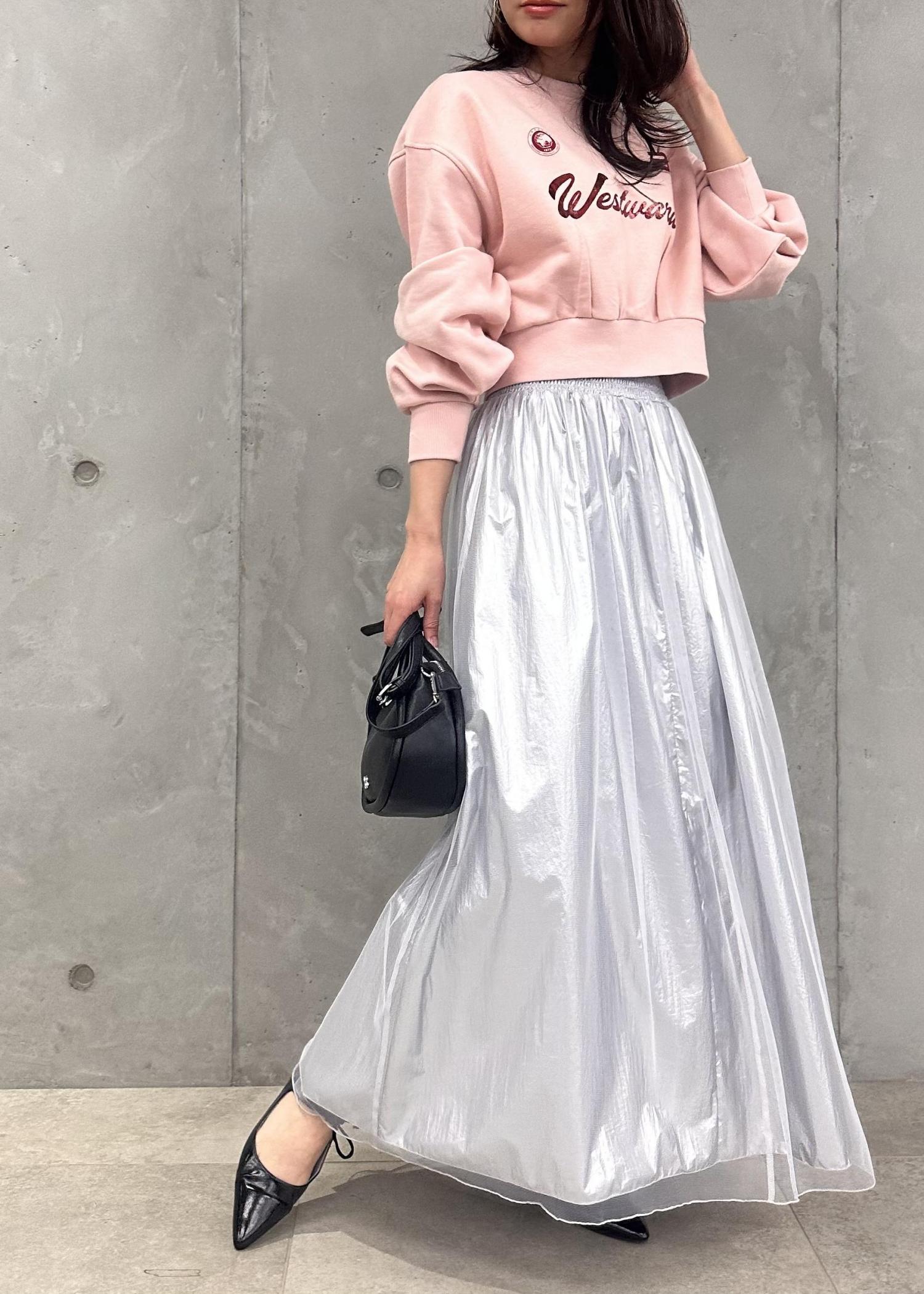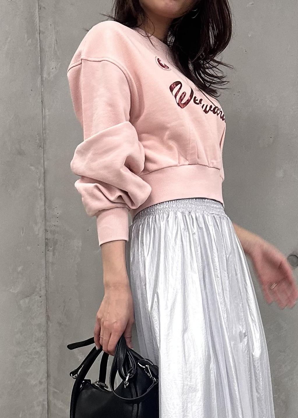 ピンクのスウェットで可愛らしく、短丈トップスでスタイル良く見せてくれるコーディネートです◎