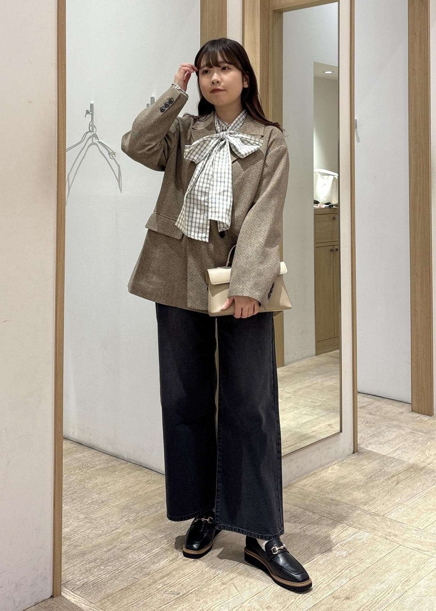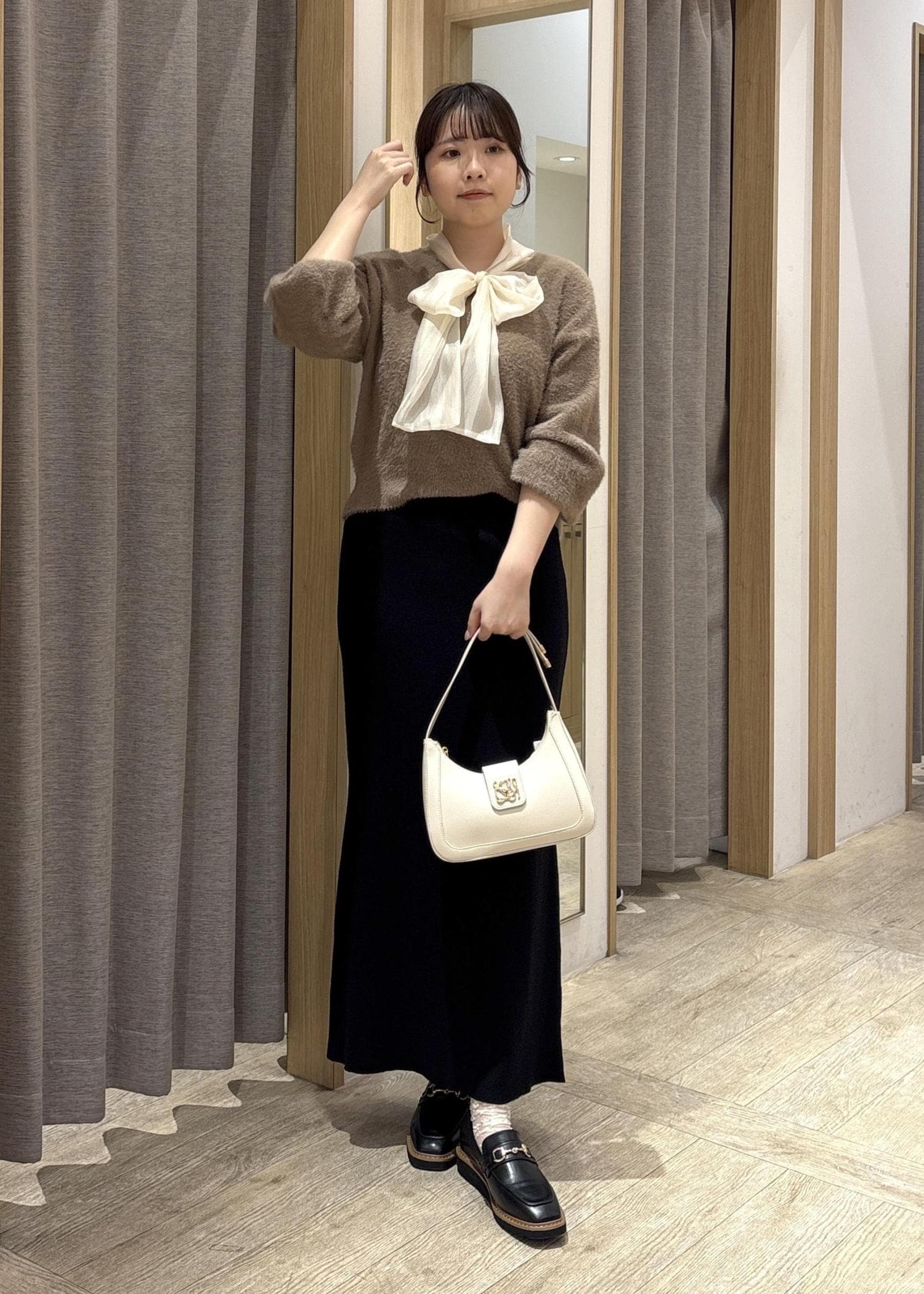 レースアップのデザインが特徴的な柔らかいカラーのリボンニットと、シルエットに拘ったマーメイドシルエットのデニムスカートを合わせたコーディネートです!