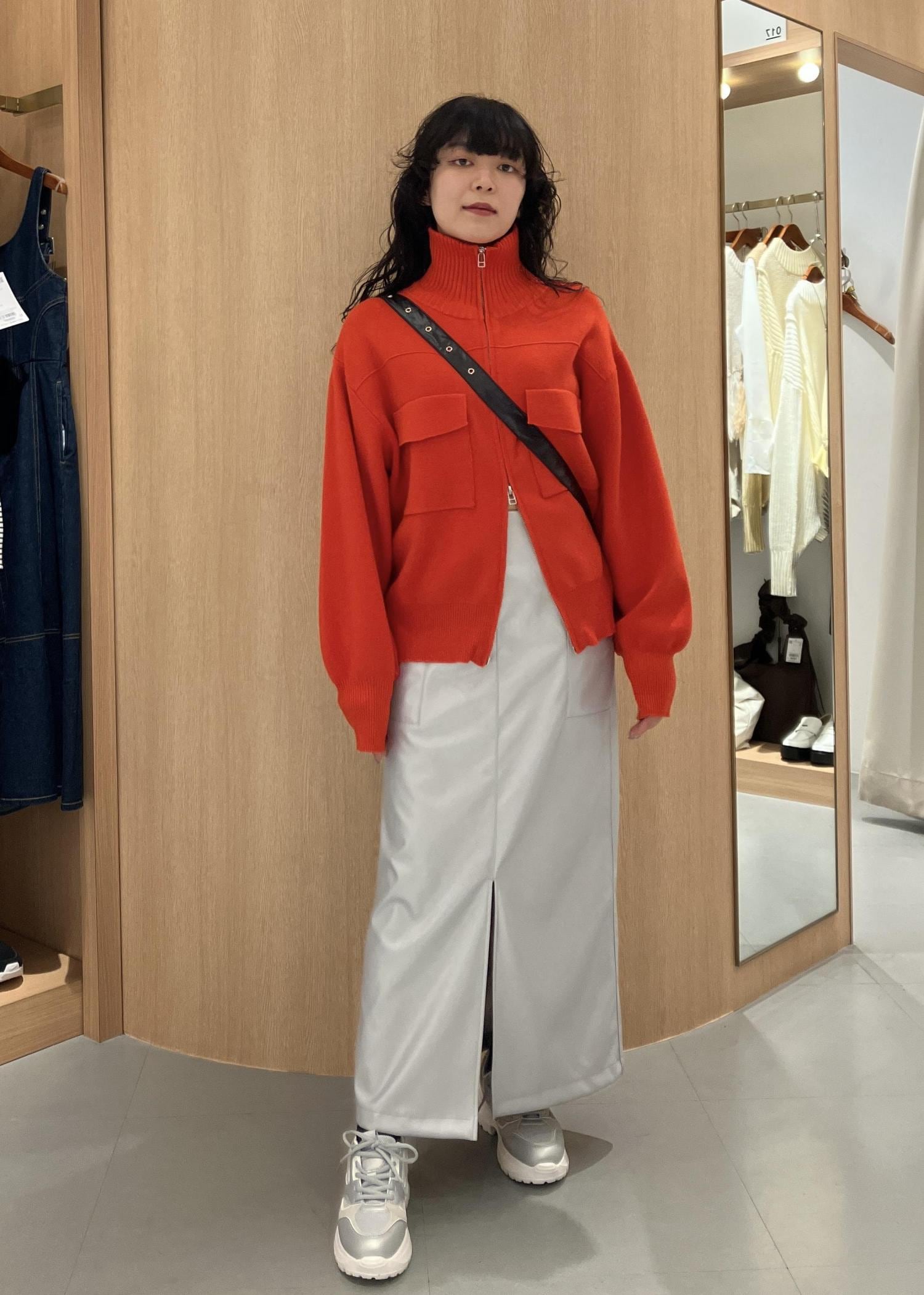 ポップなカラーカーデとシルバースカートで、テック系ファッションを意識したコーディネートにしました( ◠‿◠ )