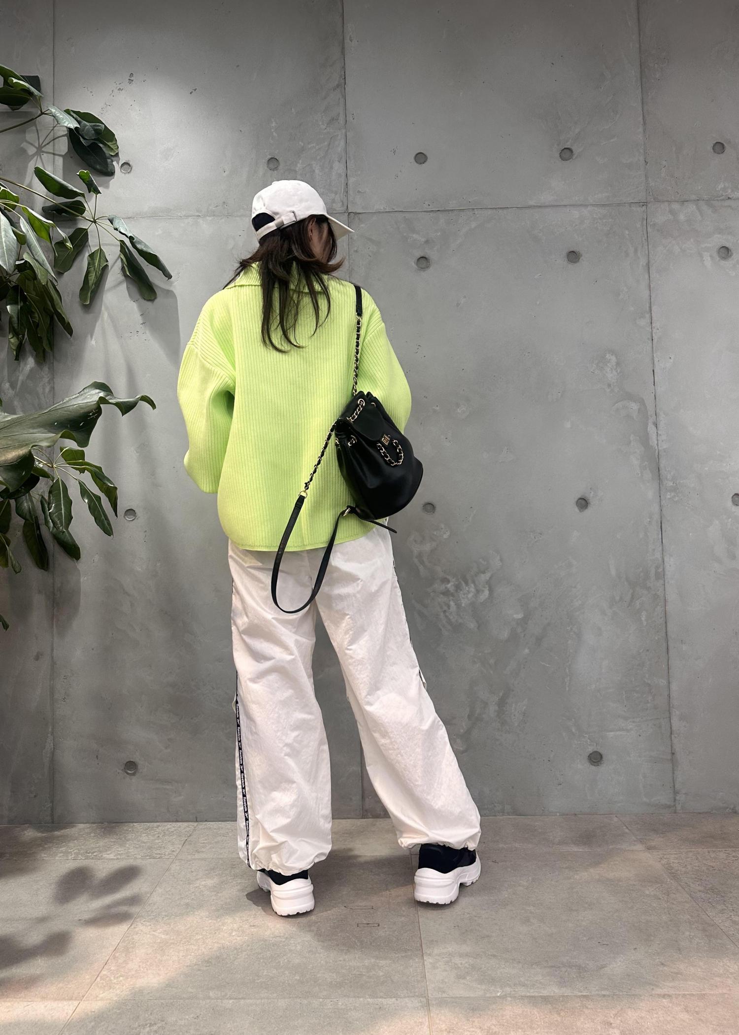 ライトグリーンのニットが目を惹くコーディネート。