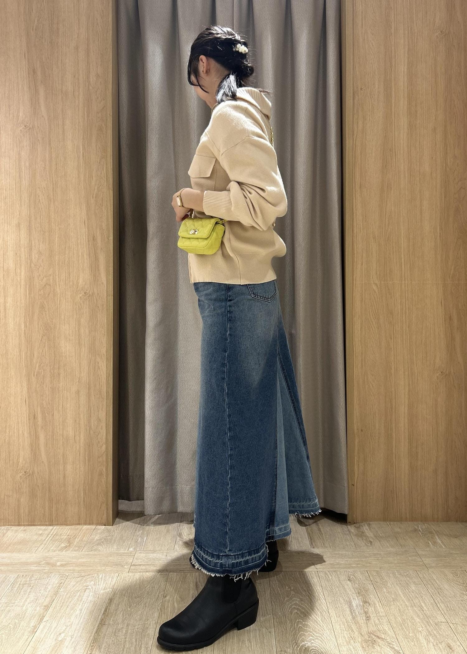ダブルジップのニットにマーメイドデニムスカートを合わせたカジュアルなコーデです。