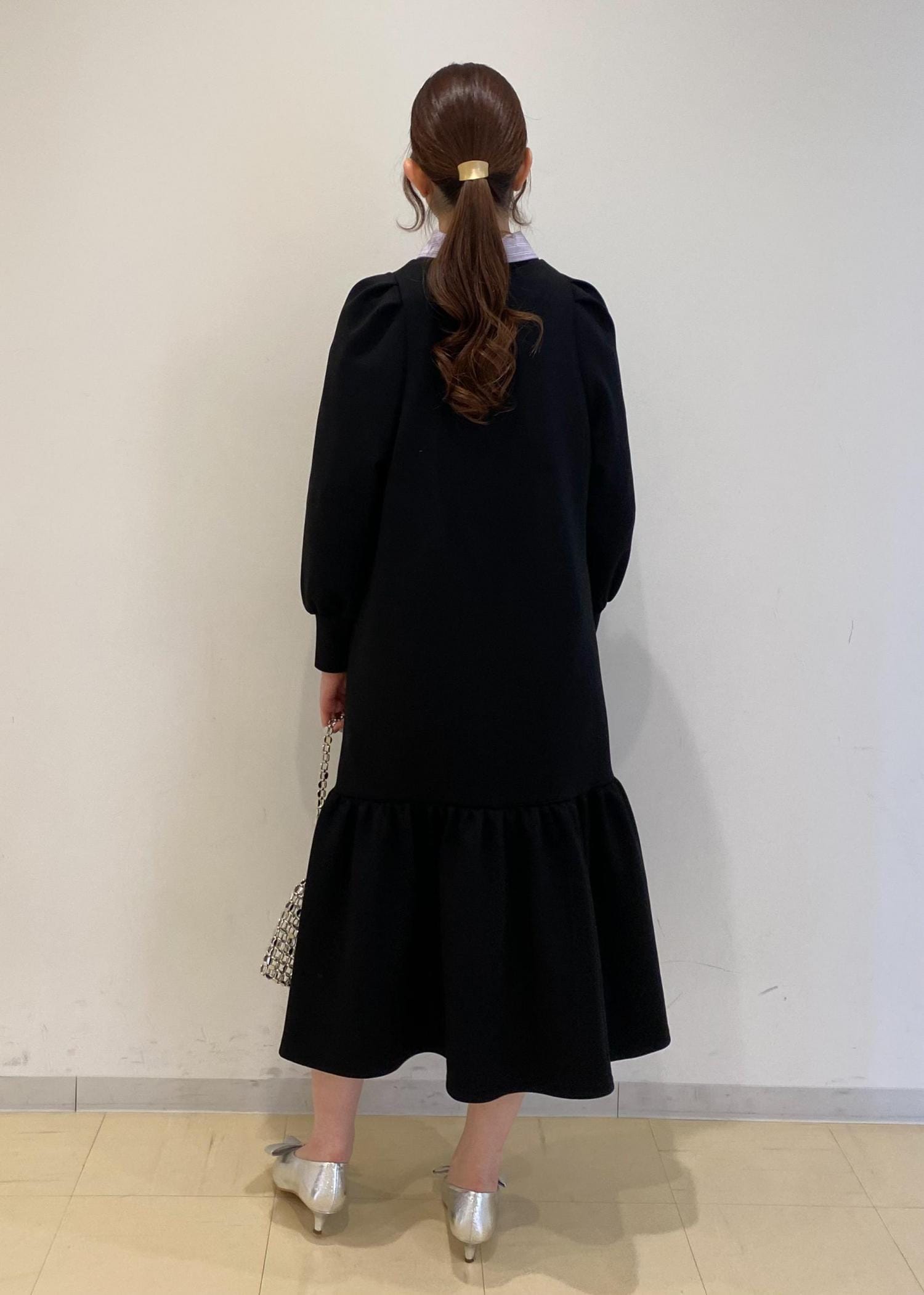 バッグとパンプスはシルバーで合わせて華やかさな印象に!
