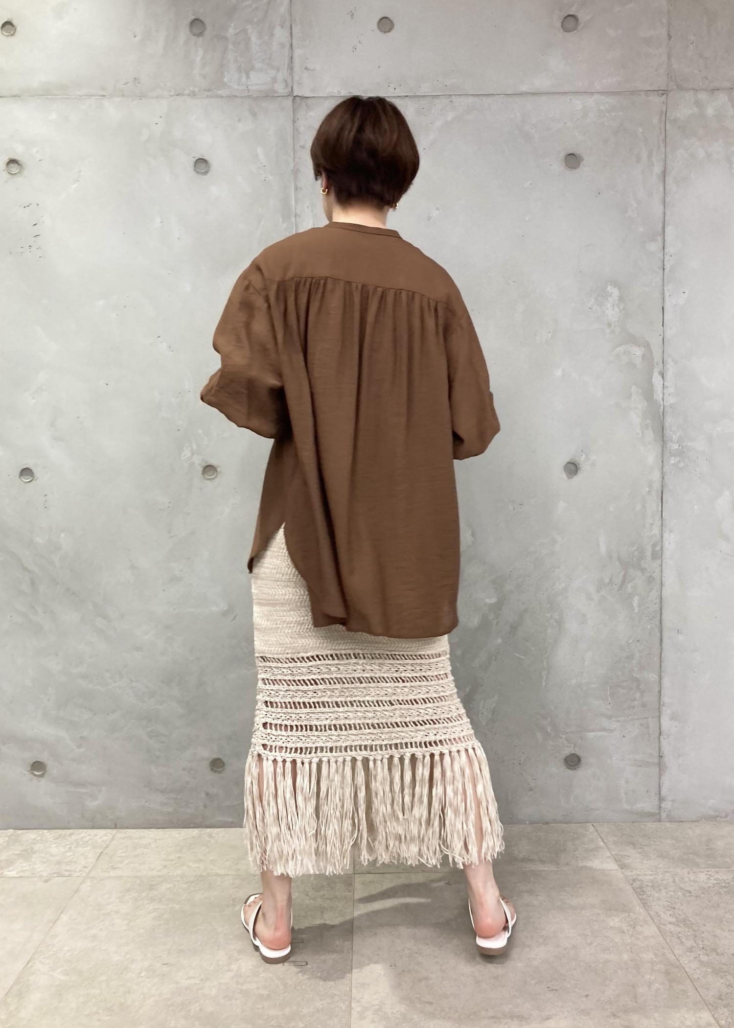 ゆとりのあるシャツに伸縮性のあるフリンジスカートで、トレンド感も抑えつつラクチンでおすすめです◎