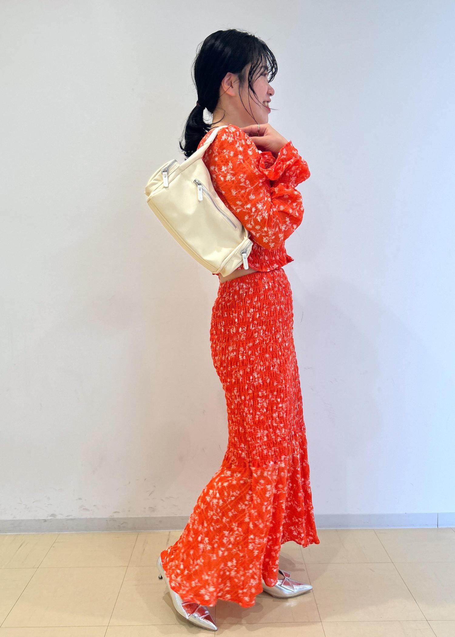 アウトレットVIS【セットアップ対応】花柄シャーリングロングスカートオレンジ系 / M¥2,307レビュー足首が隠れる丈感でした。透け感があるので、ぺたんこの靴と合わせても◎