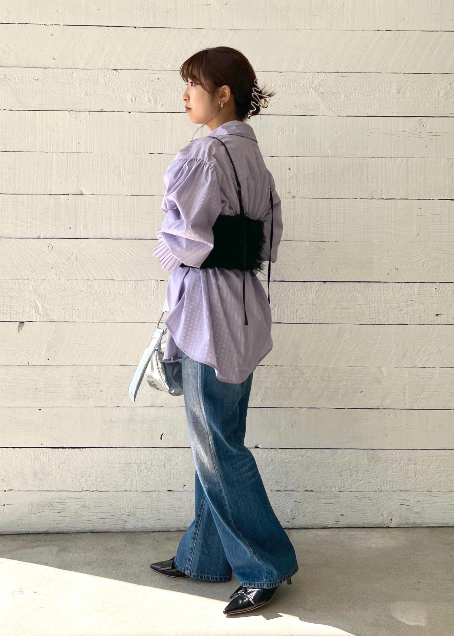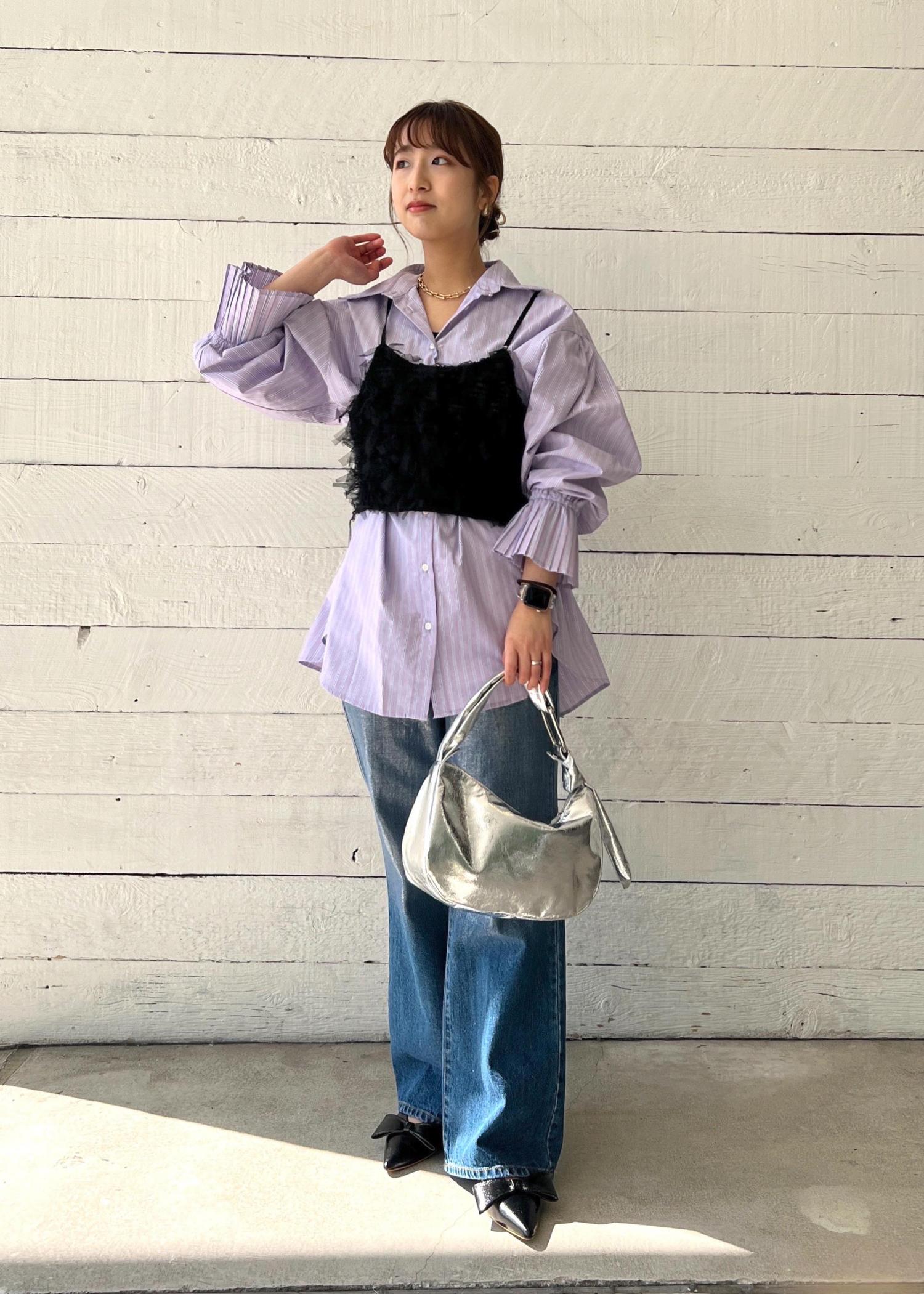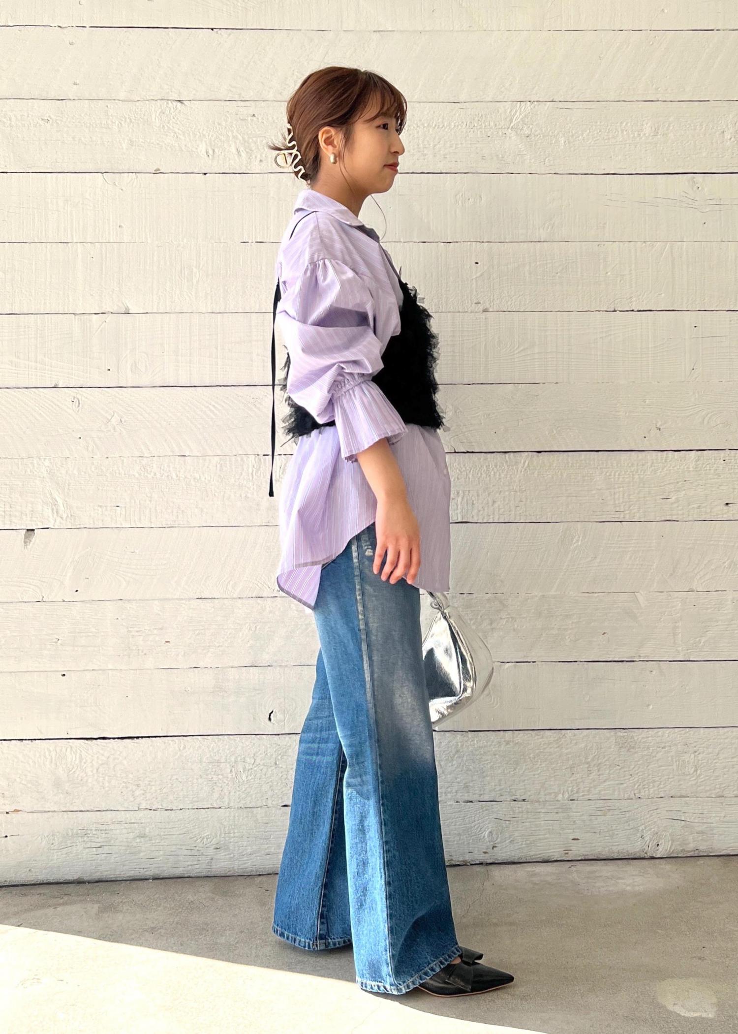 箔とバッグのシルバーがアクセントの、ビスチェでスタイルアップしたデニムブラウスコーディネートです。