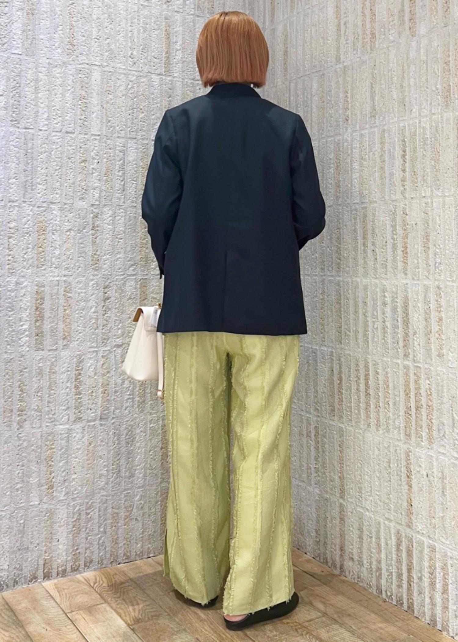 トレンドのフリンジパンツはきれいなグリーンを選んで今年らしくバージョンアップしています。