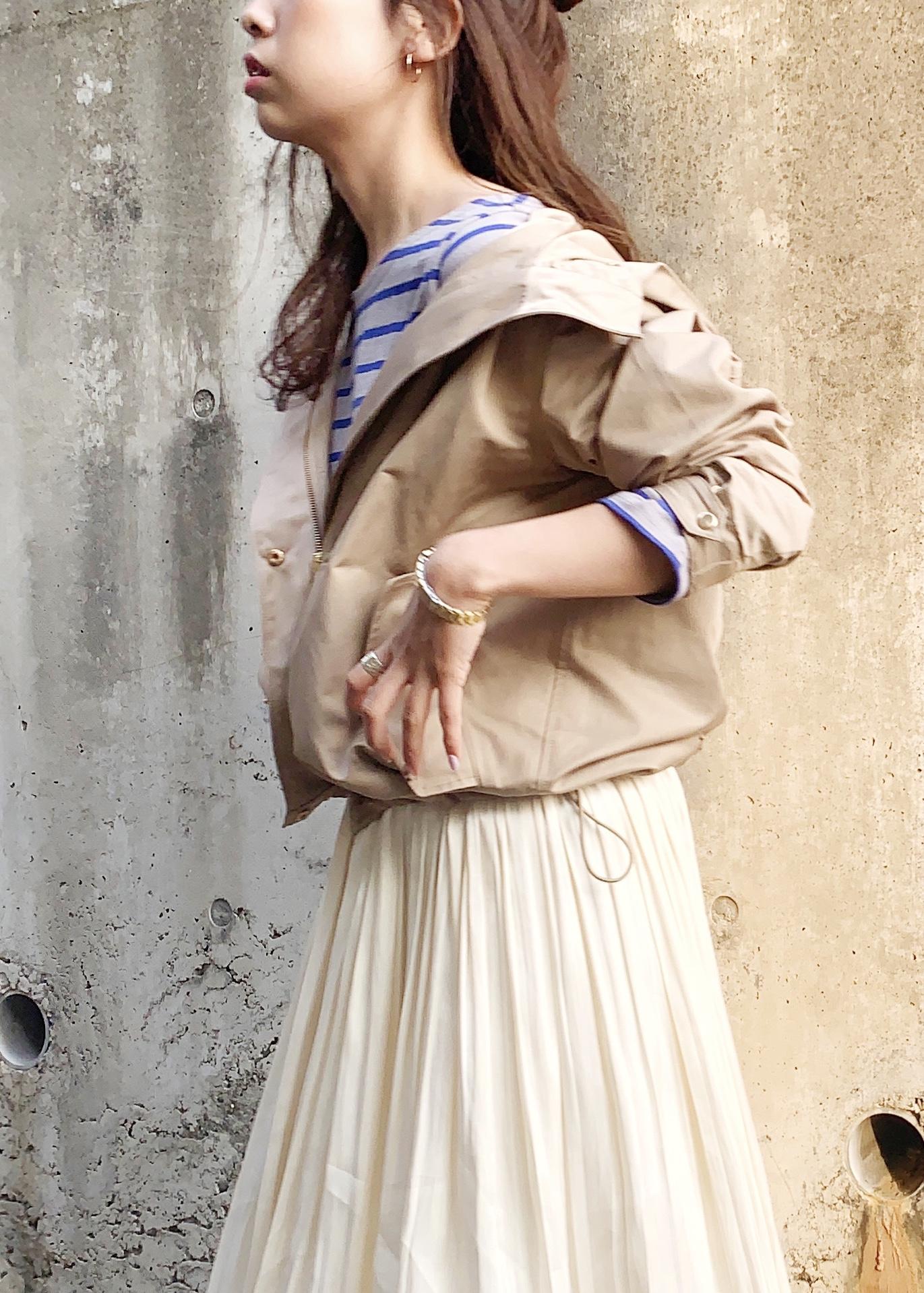 マウンテンパーカーをメインにしたカジュアルコーデ◎ フワッと広がるプリーツスカートとのバランスを考え、 裾は思いっきりキュッと絞り短めに、、 袖口もまくって全体的にコンパクトに着ることで、 グッとスタイルアップ効果が高まります。