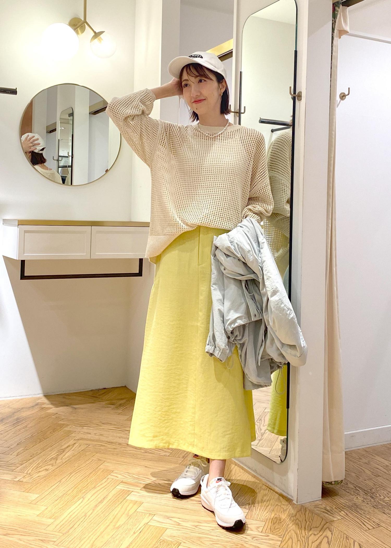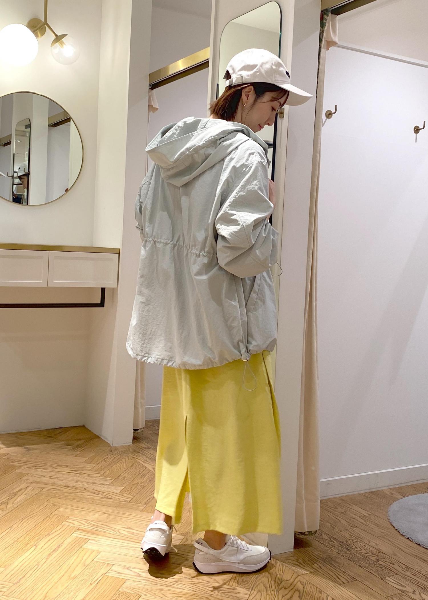 マウンテンパーカーの水色と相性の良いイエローのスカートで明るさをプラスしました。