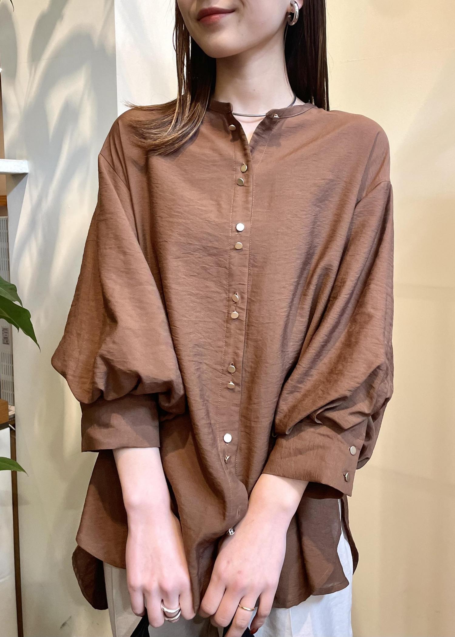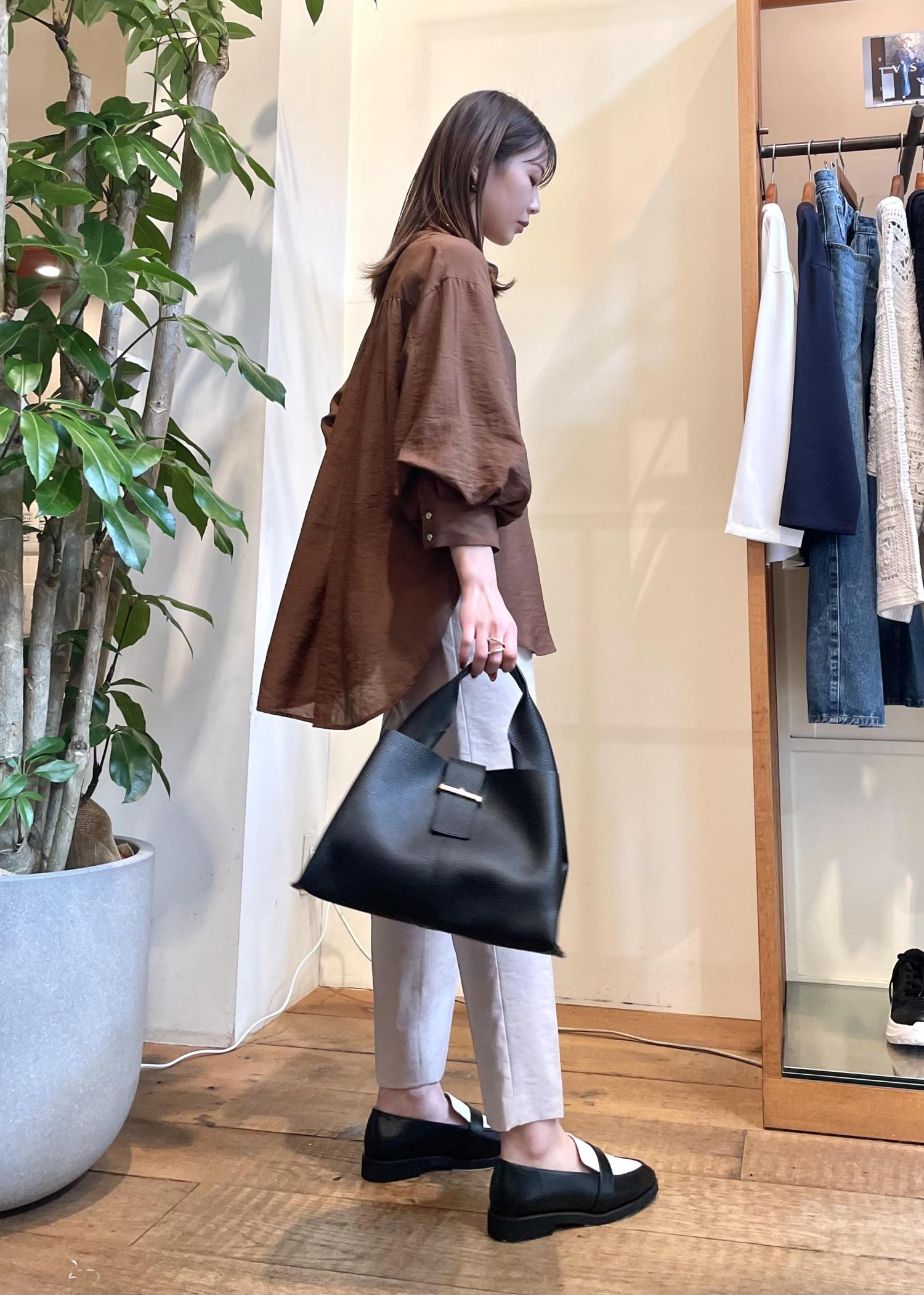 トップスが着丈長めなのでテーパードパンツですっきりと。