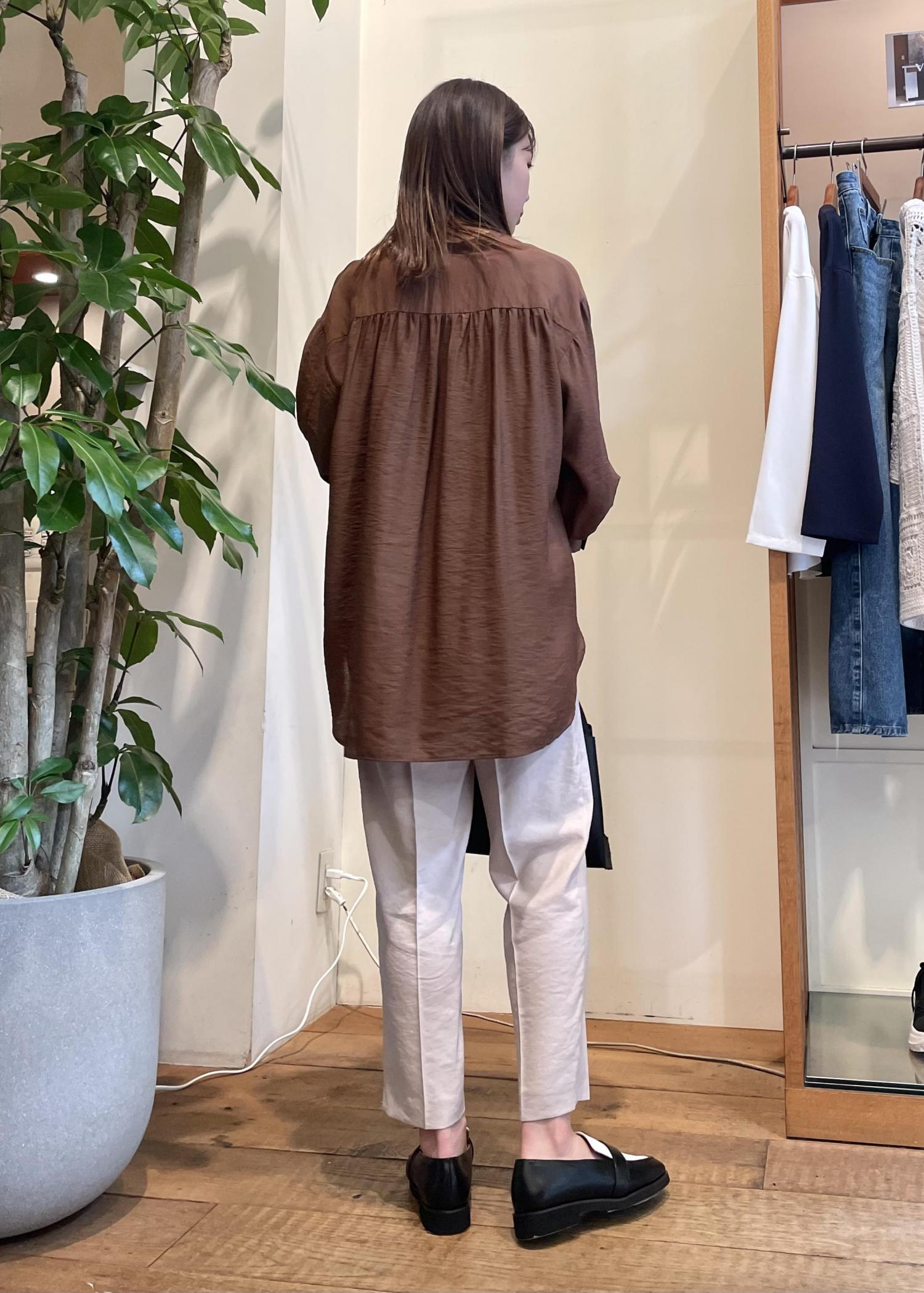 少し光沢のあるさらっとした素材なので春〜秋まで長く使えるパンツです。