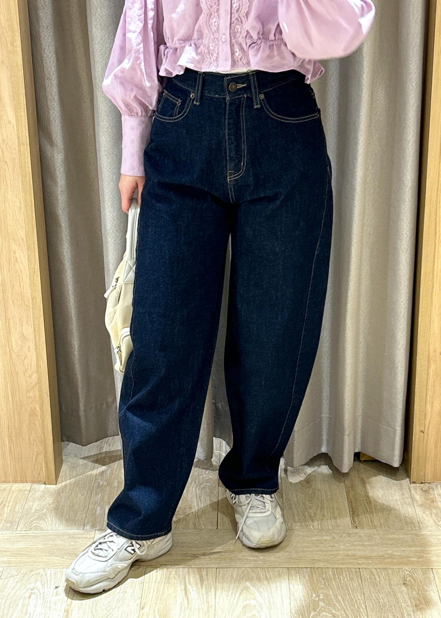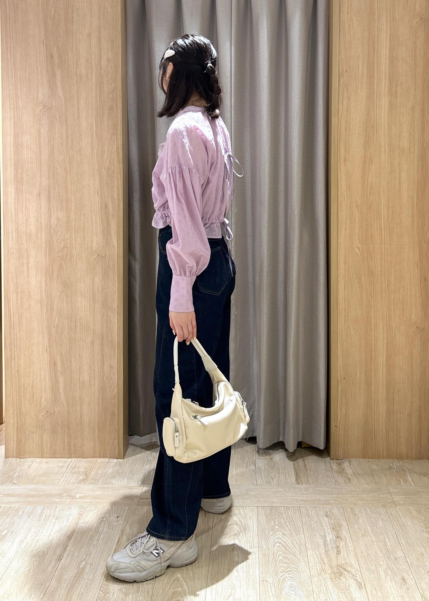 春色カラーの小鼻柄ブラウスにカーブデニムを合わせたコーデです♪