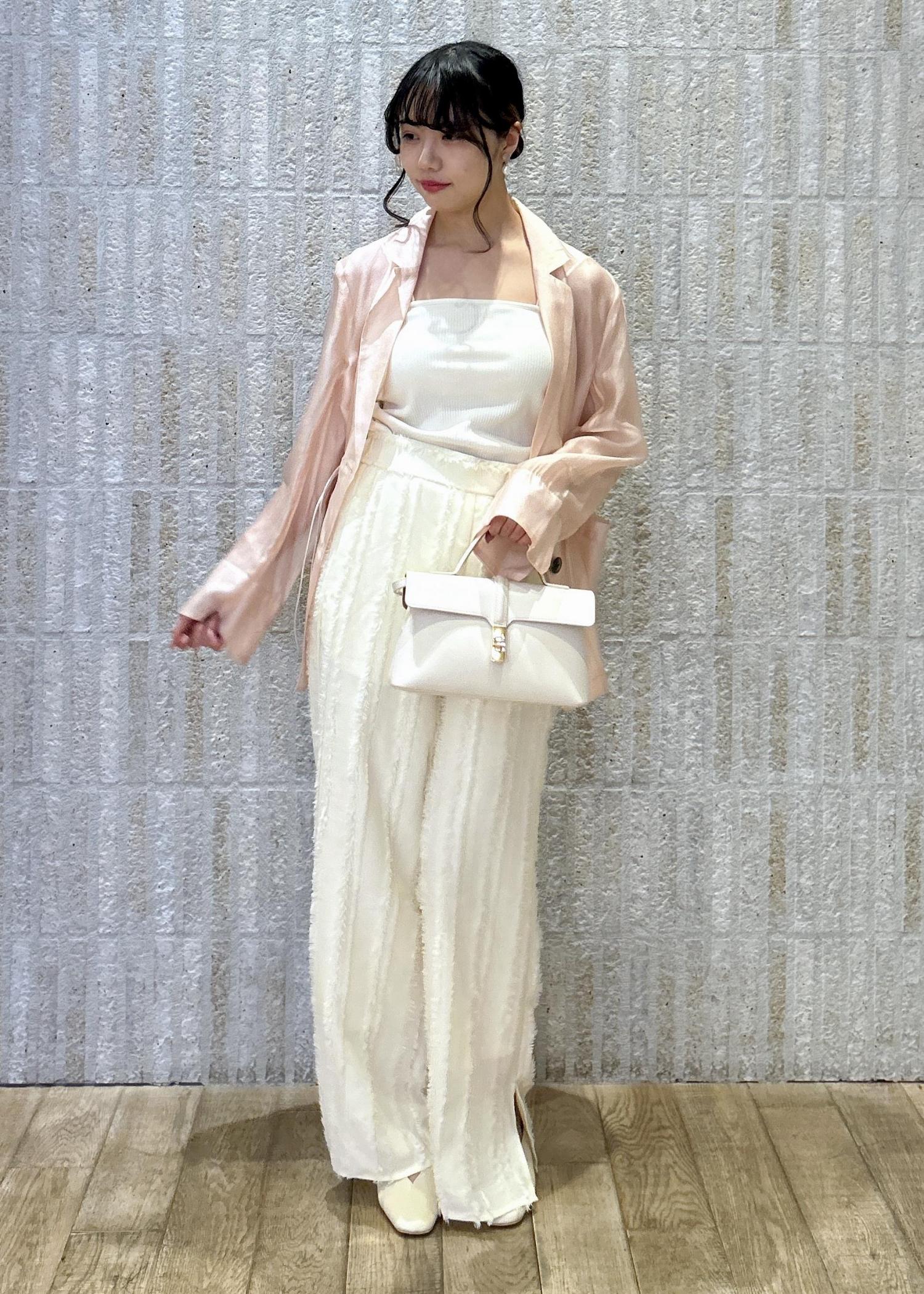 春色カラーのシアージャケットに デザイン性のあるフリンジパンツで 綺麗めカジュアルになるように組み合わせました! パンツはゴムになっていて履きやすさと動きやすさがあるので お花見におすすめです✨ シアージャケットが主役になるように全体的をホワイトでまとめ 女性らしさがでるようにしたのもポイントです ____________________ LINEで在庫のお問い合わせや商品、コーディネートのご相談など是非お気軽にお問い合わせくださいませ。 LINEで二子玉川ライズVISスタッフにご相談は【友だち追加】をタップ!!