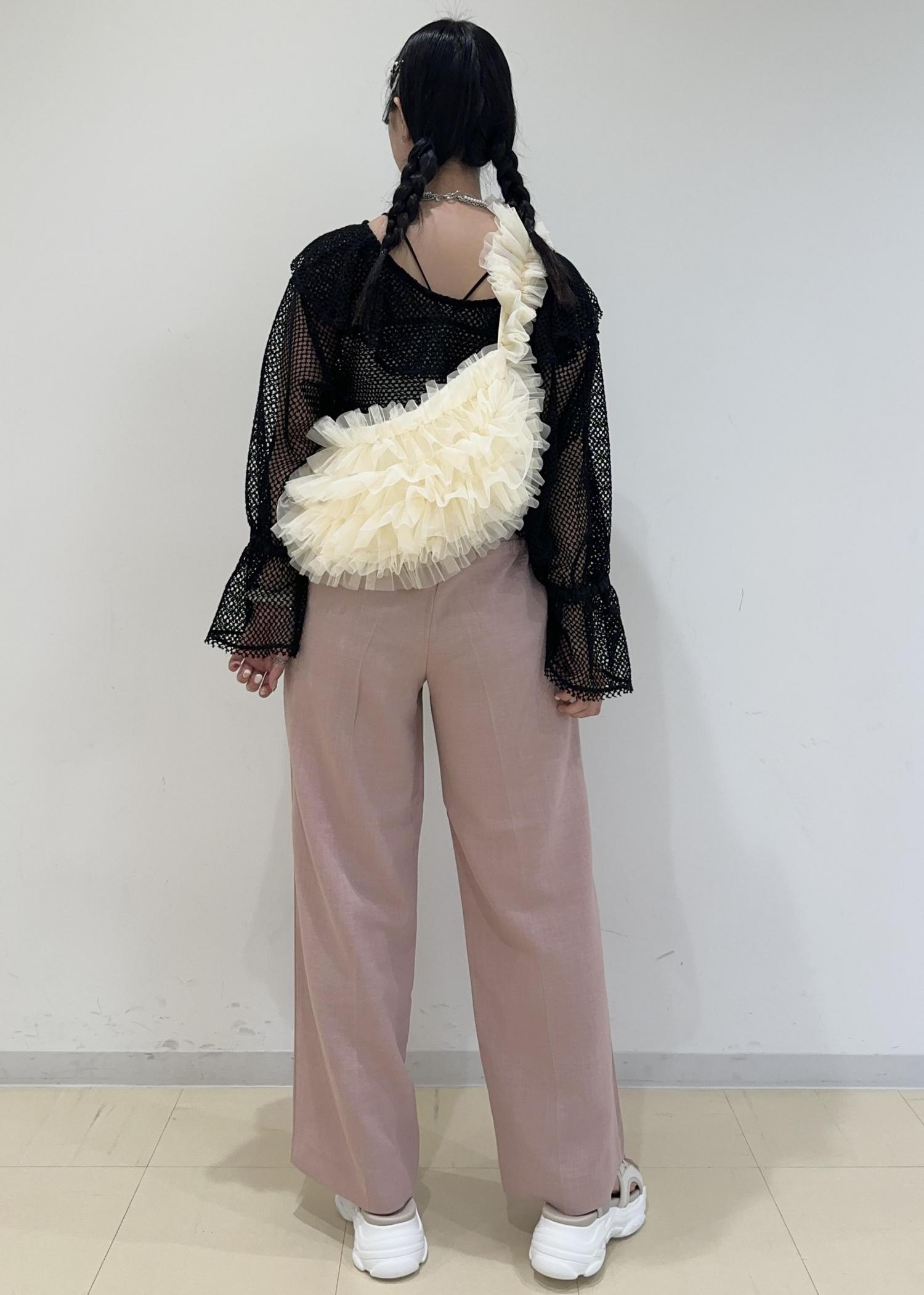 アウトレットVISCASUAL チュールフリルショルダーキナリ / F¥2,076レビューコーデのアクセントになってくれるフリルバッグ。とにかくバックなのに軽いです。紐で長さもちょうせつできるので、様々なコーデに合わせられます。