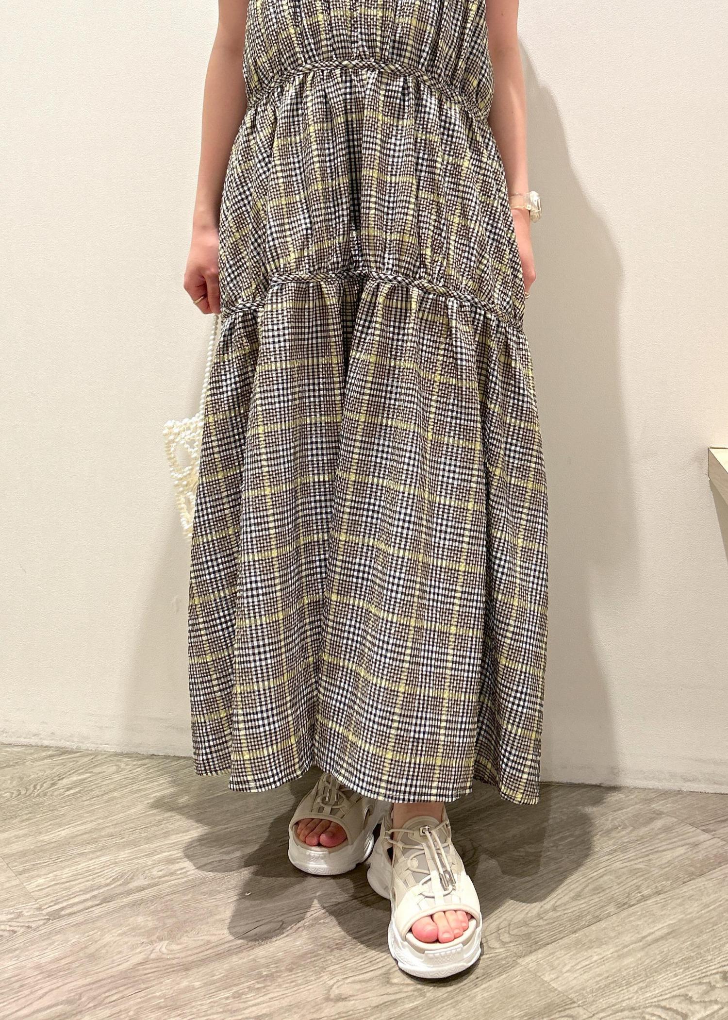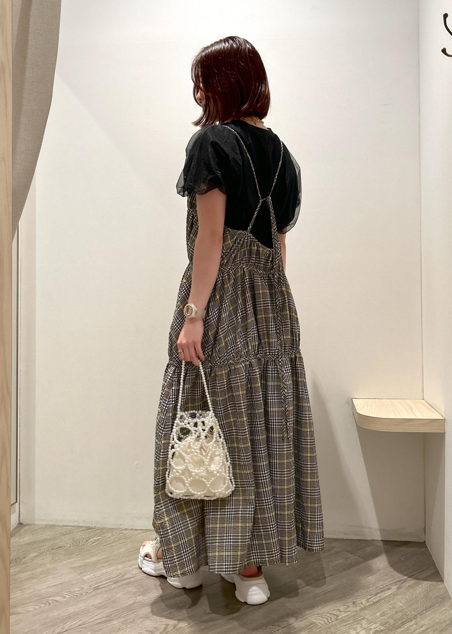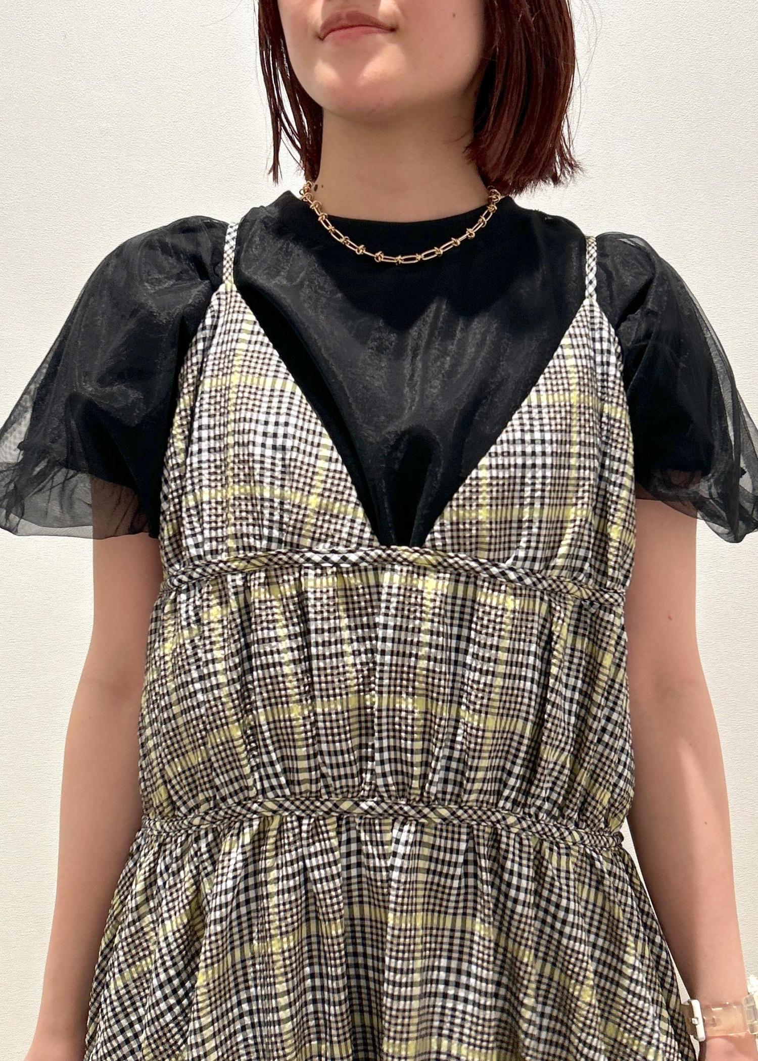 チェックのワンピースにチュールのトップスを組み合わせ大人ガーリーなコーデに!