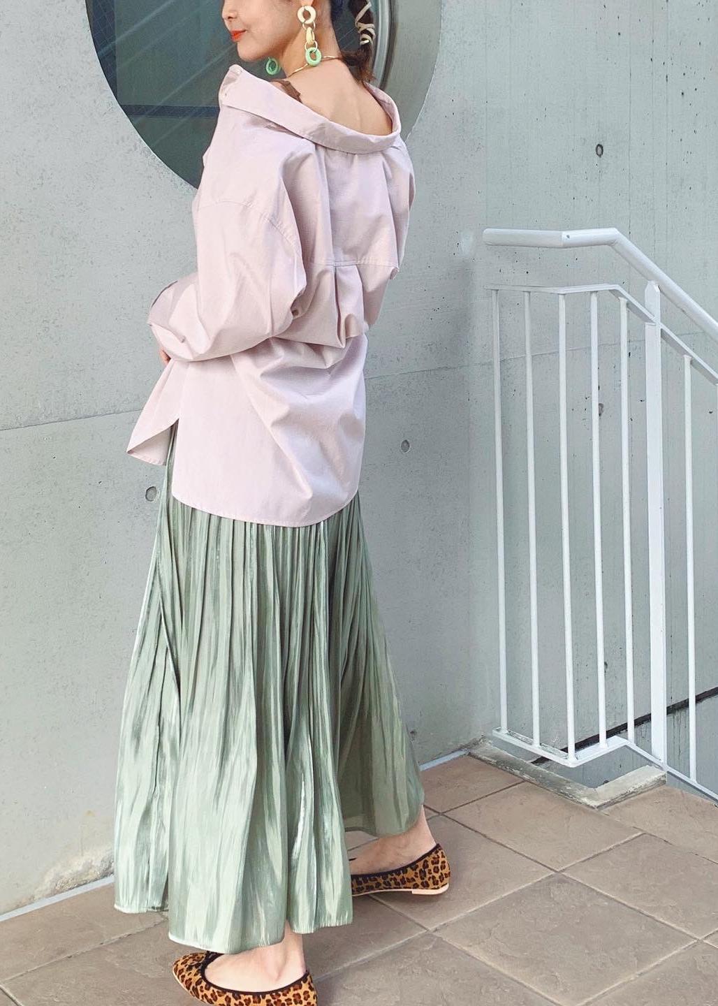 上質な生地感の鎌倉シャツをラフに☆ 光沢感あるシャイニースカートで 大人カジュアルな印象に☆