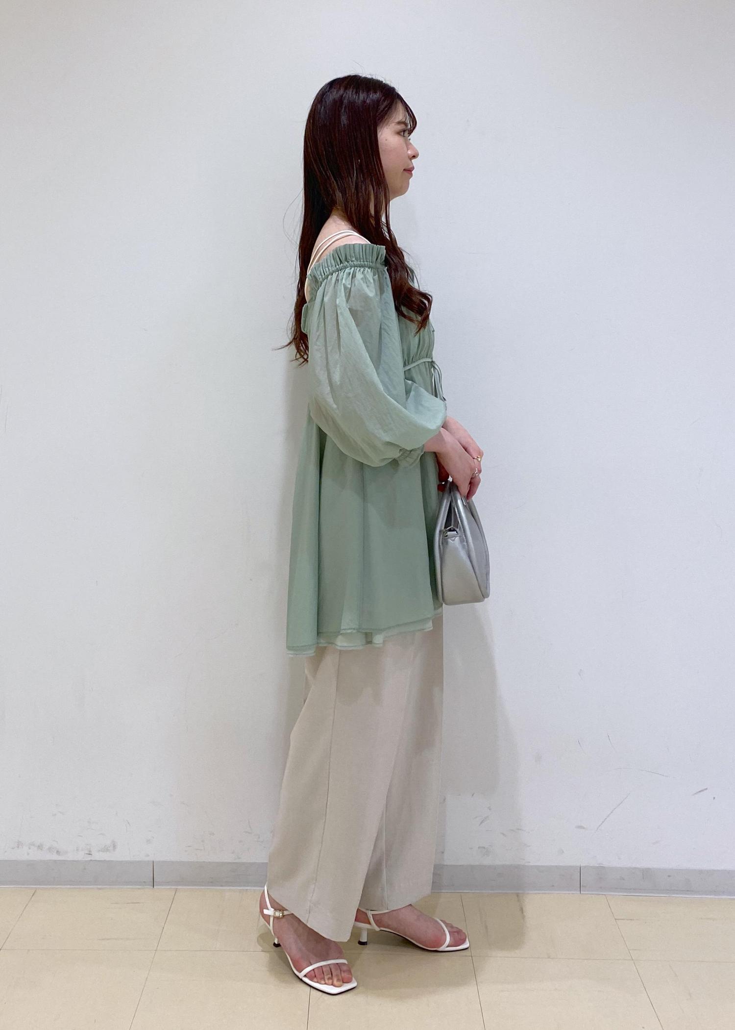 オフショルでも使えるブラウスをワイドパンツと合わせたコーディネートです。