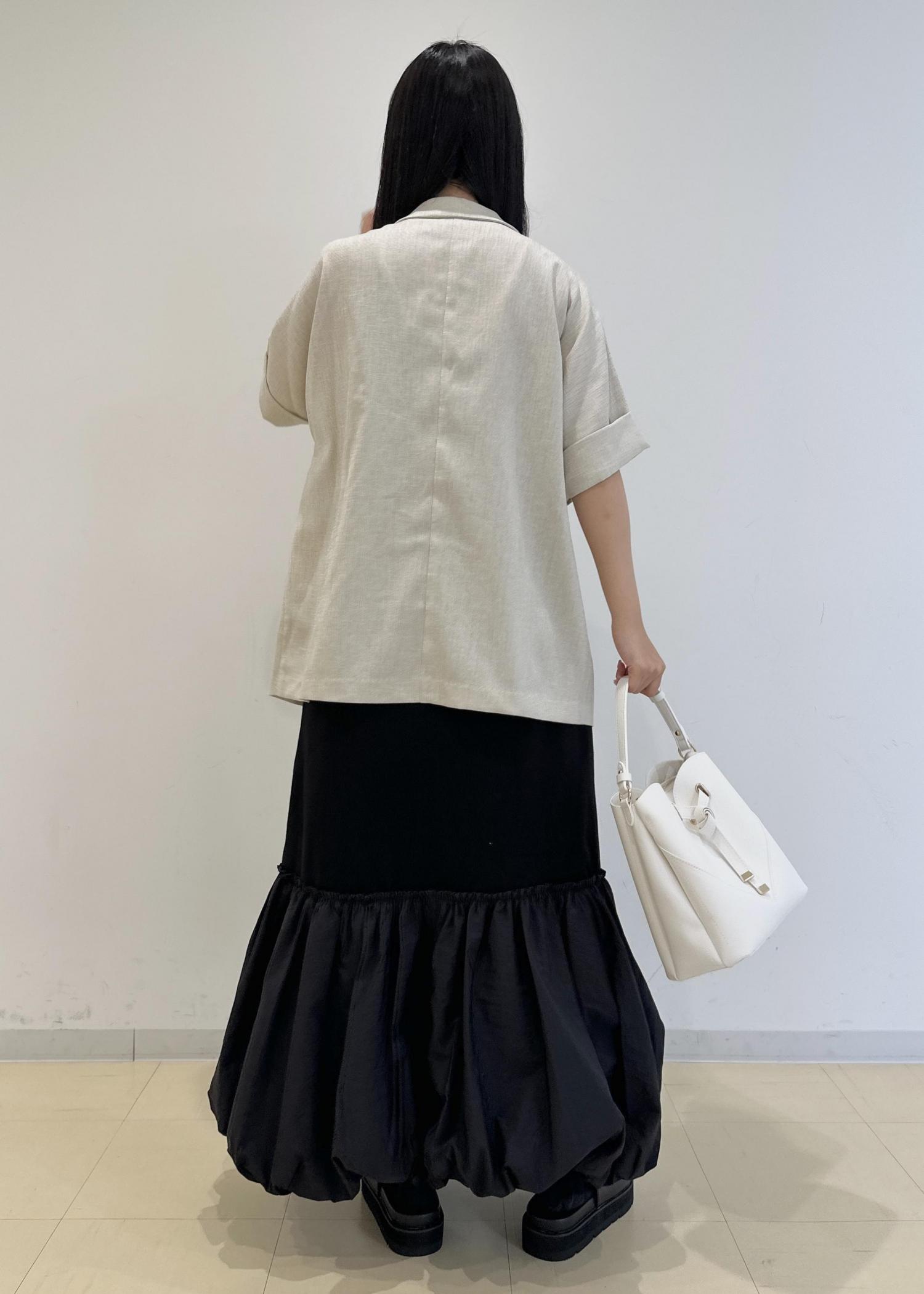 二の腕露出が苦手な方は、上からジャケットを羽織るとよりキレイめで挑戦しやすいコーデに◎