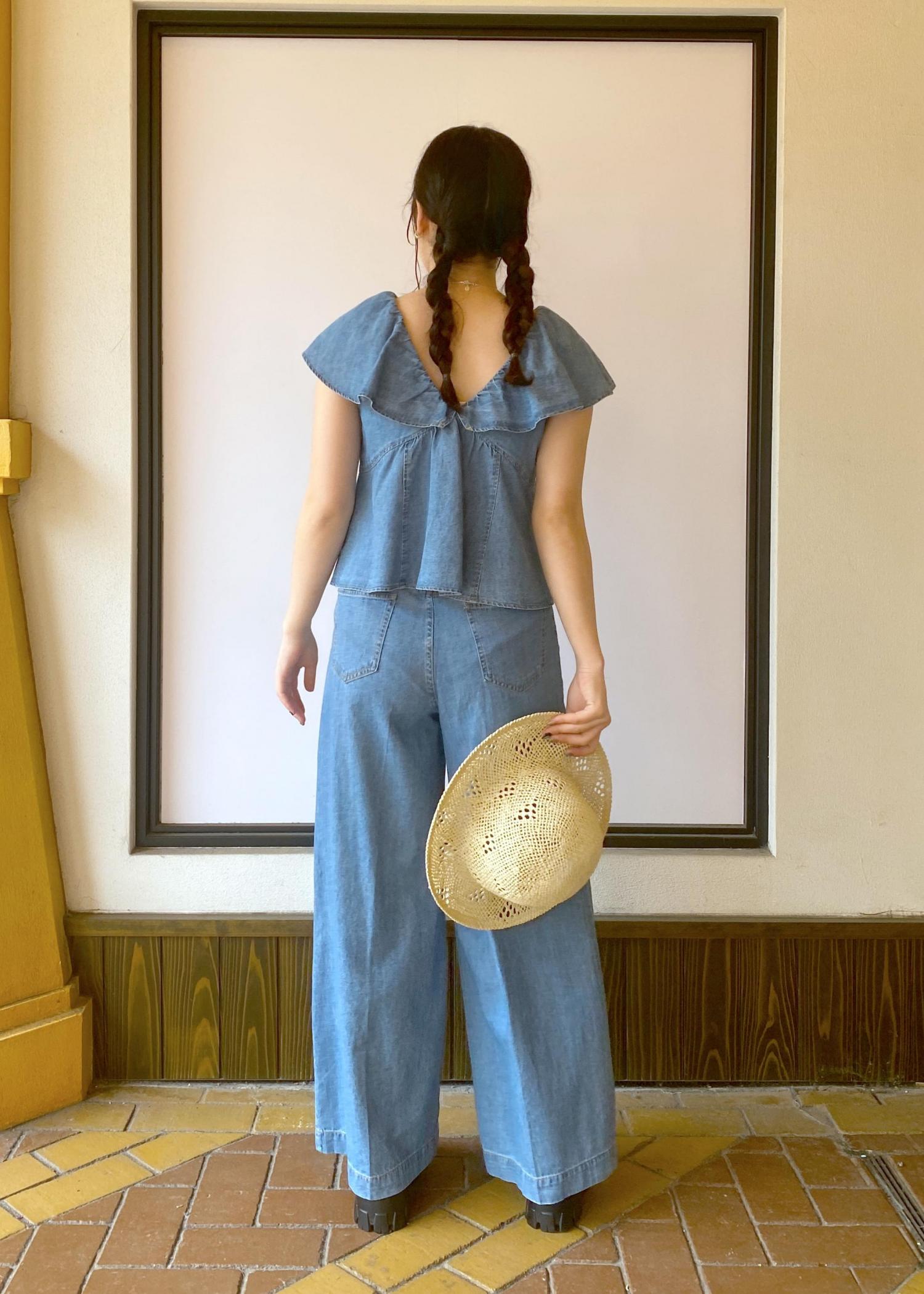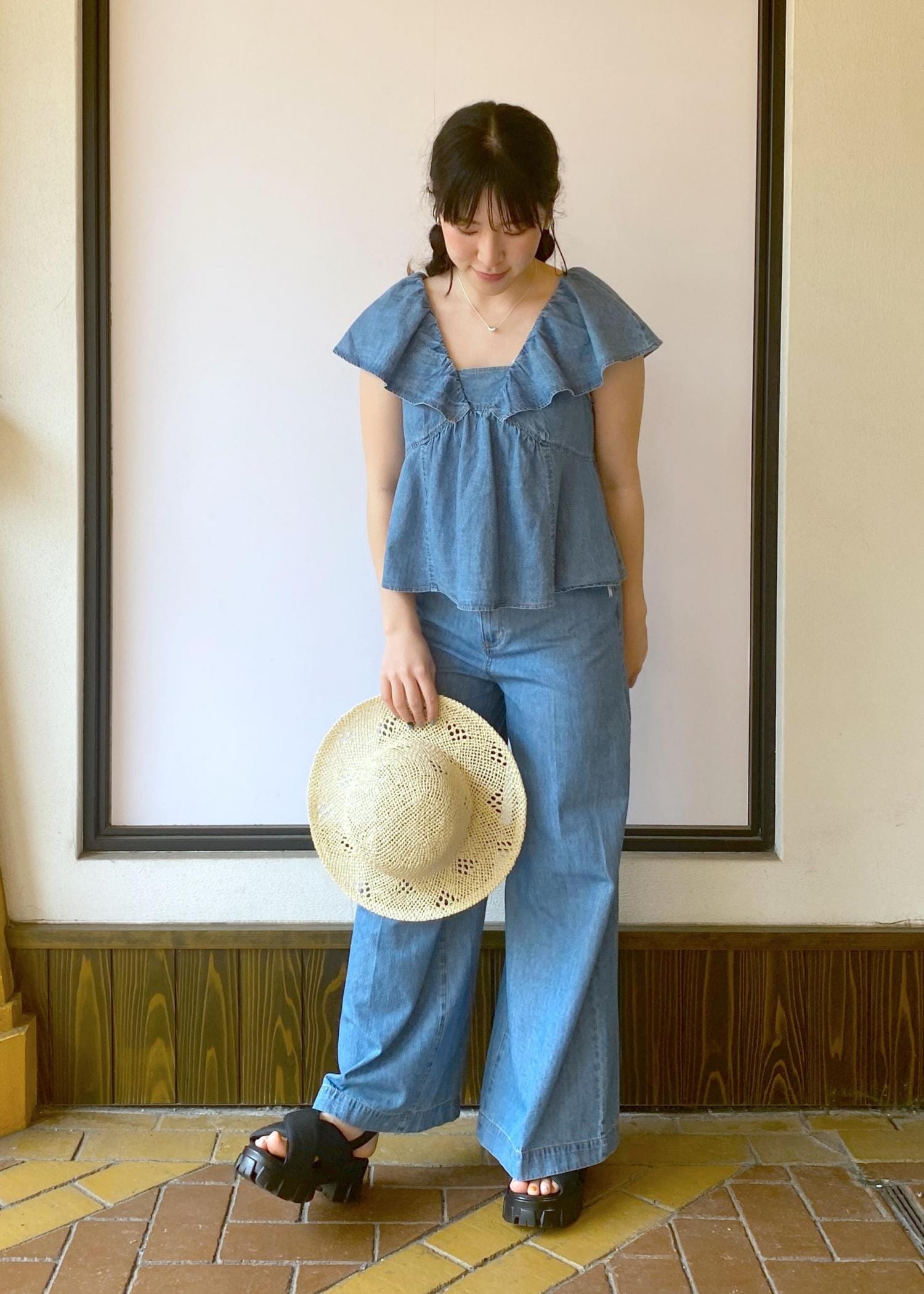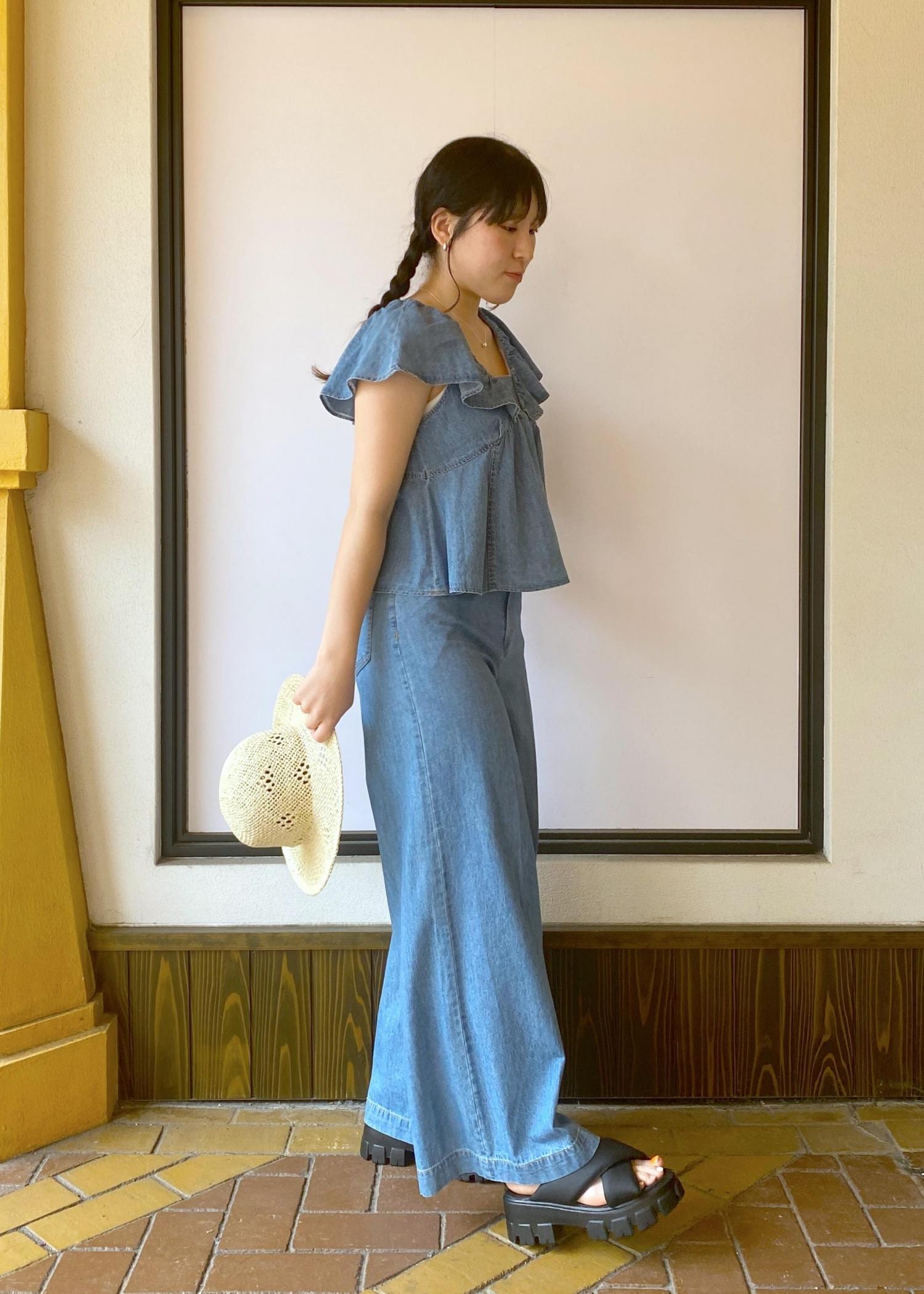 袖のフリルやウエスト下から広がるシルエットがとってもかわいいトップスとワイドシルエットが綺麗な