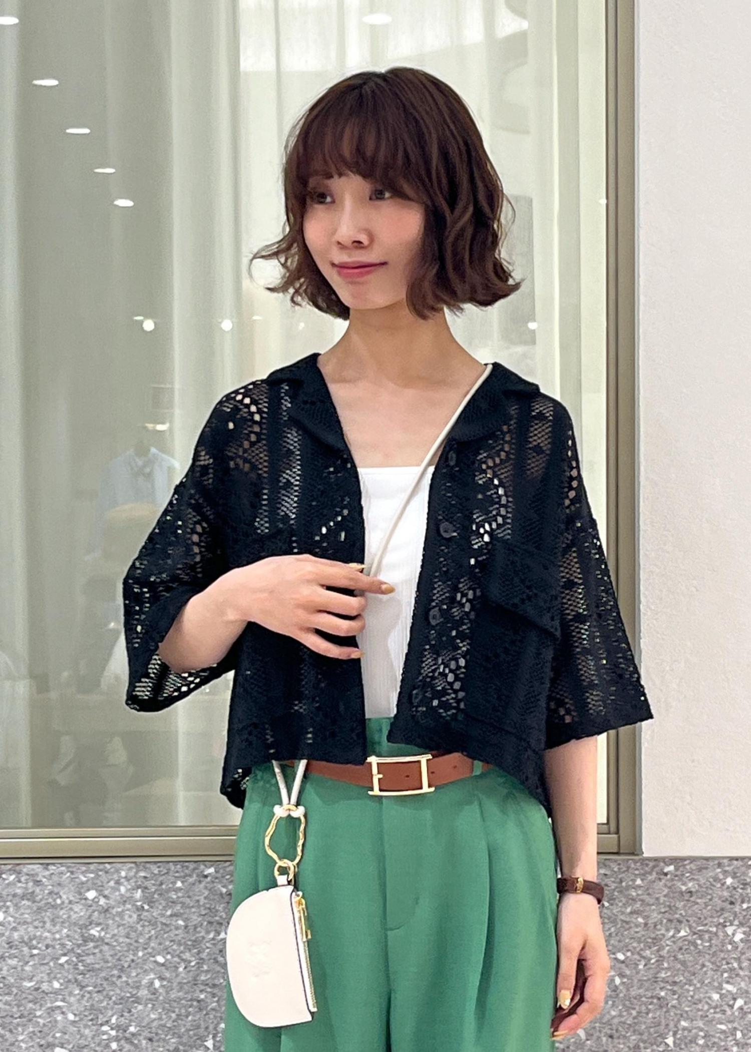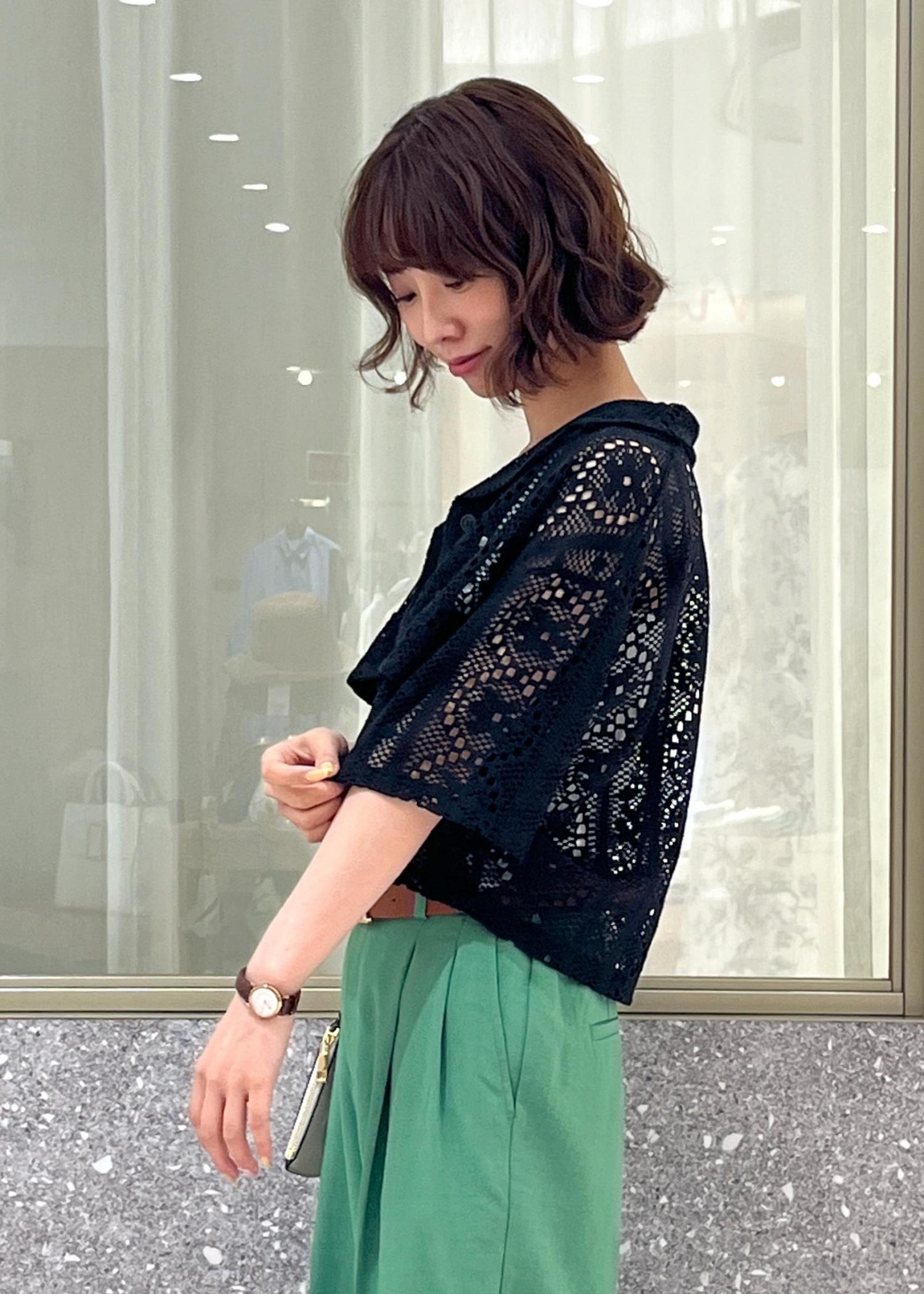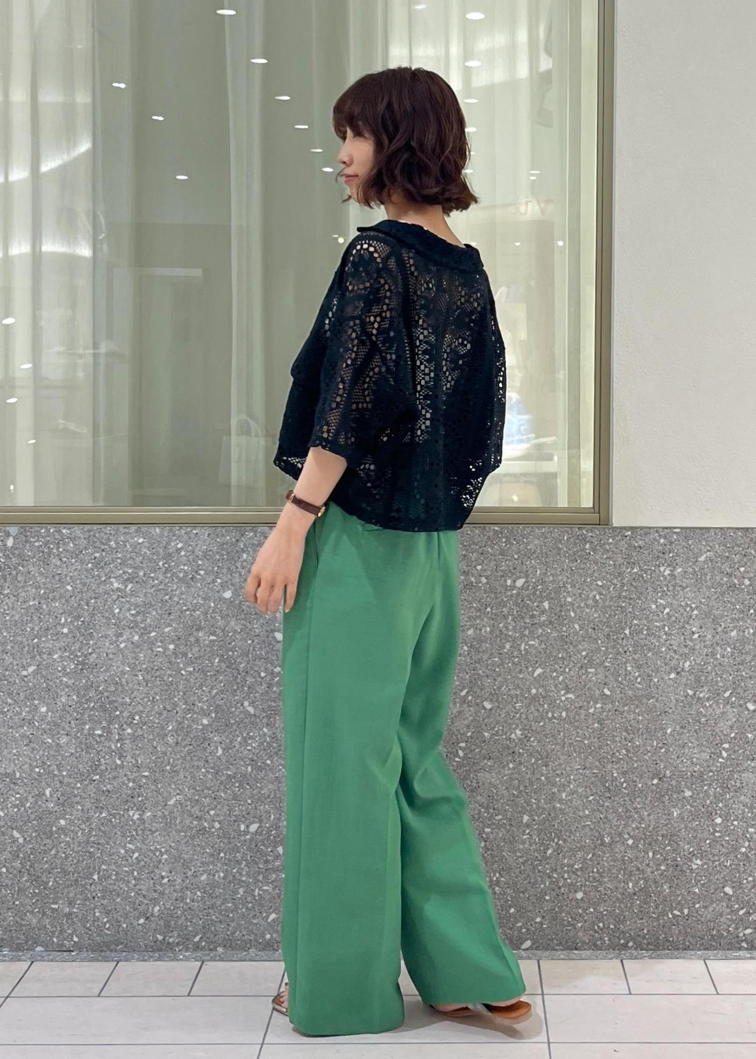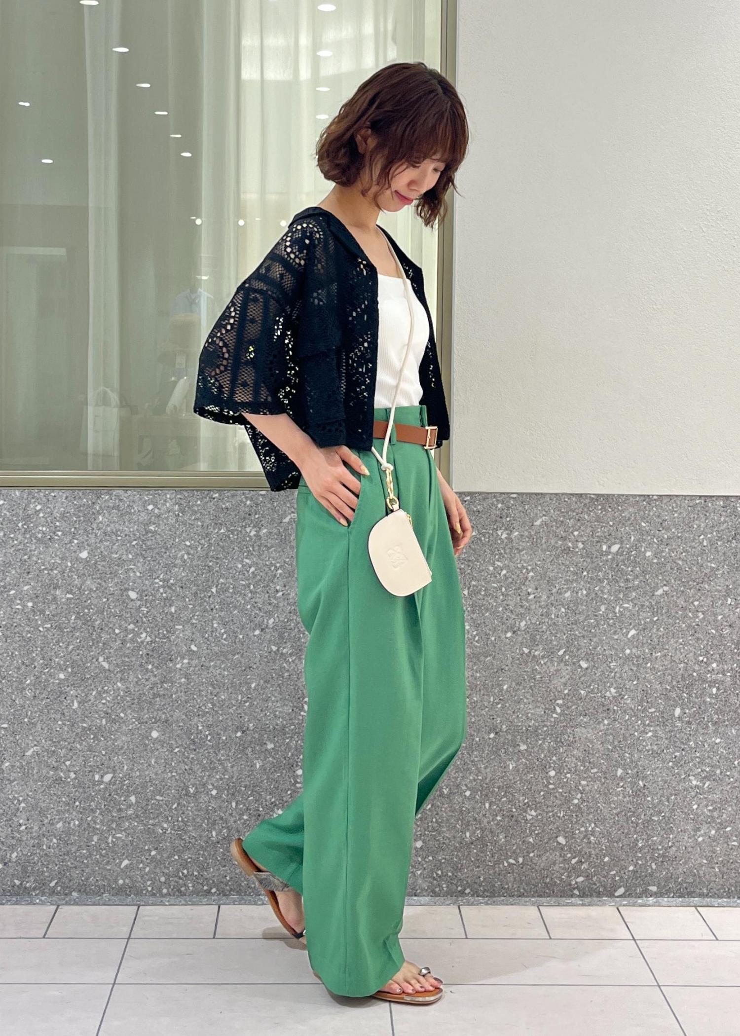 リネンライクのナチュラルな素材感ですが、フロントタックがあることでラインが綺麗に見えるので通勤など綺麗めスタイルにも合います。 -